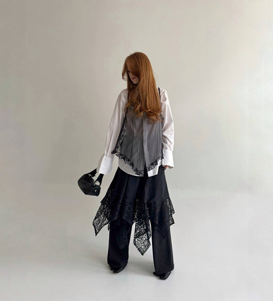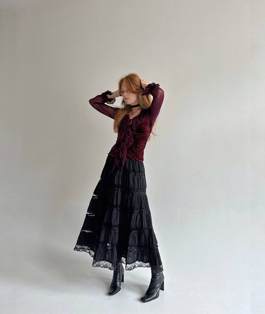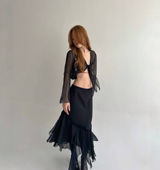 Vintage viscose black asymmetrical layered bottom skirt with ruched detail