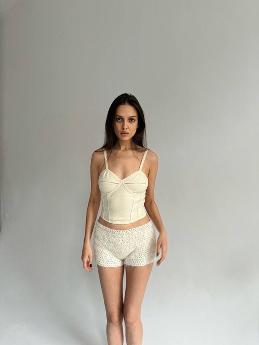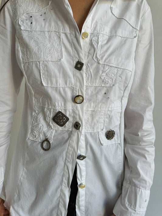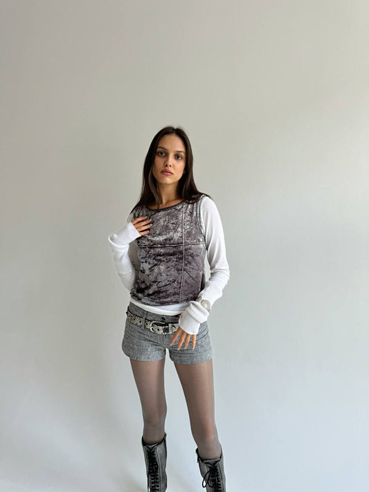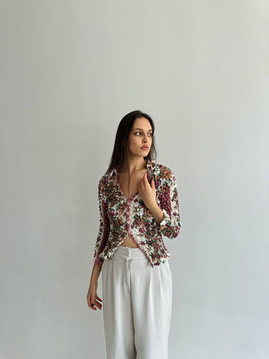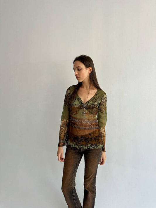 Vintage mesh blouse with 50’s ladies print and striped sleeves