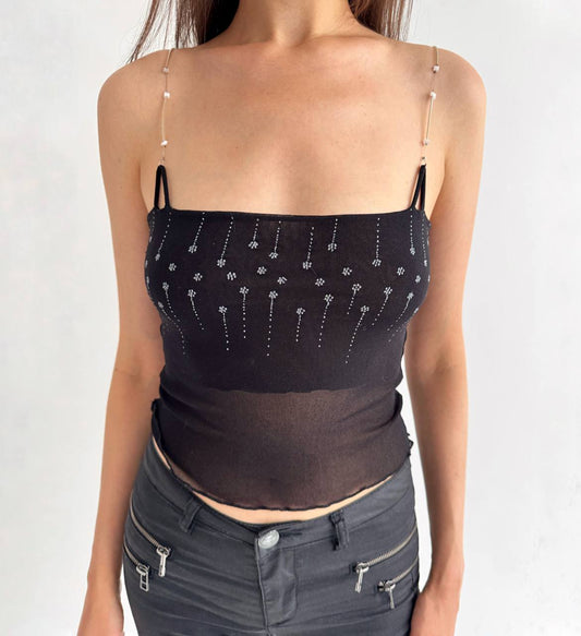 Vintage mesh black beaded straps top