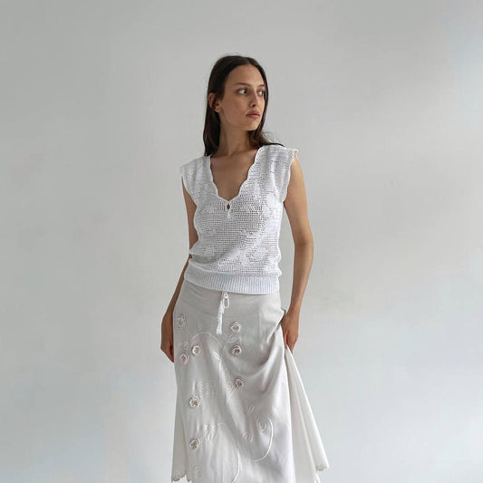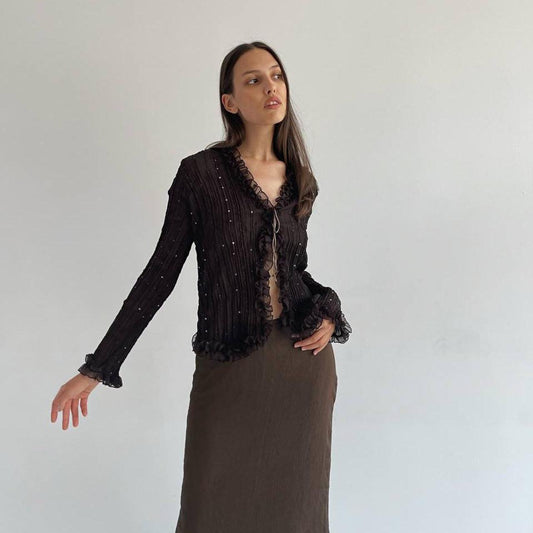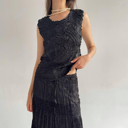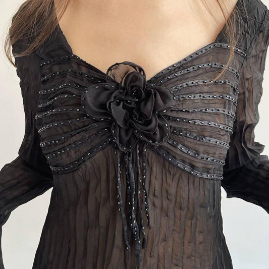 Vintage pink pleated blouse with ruffles and flower appliqué
