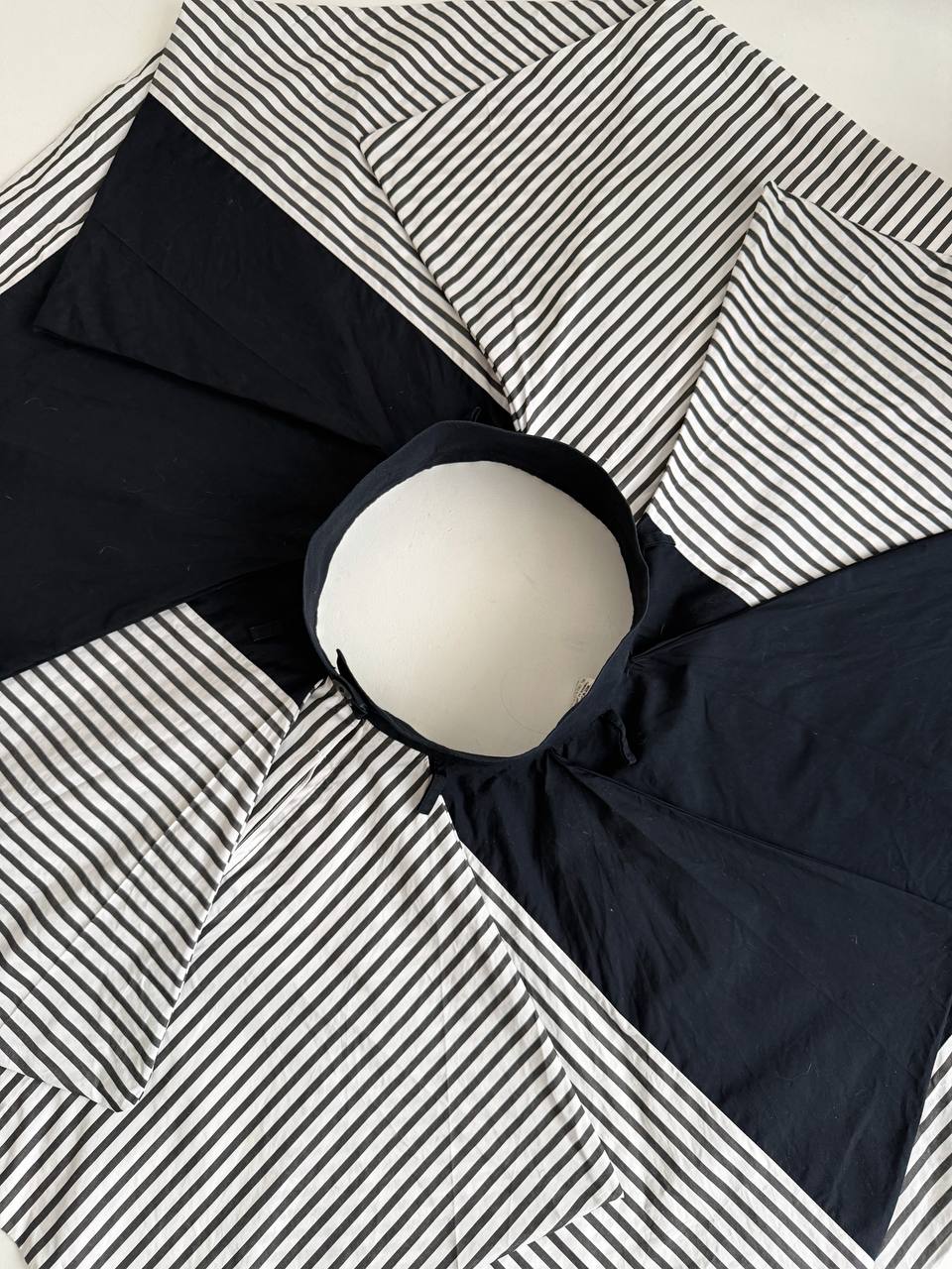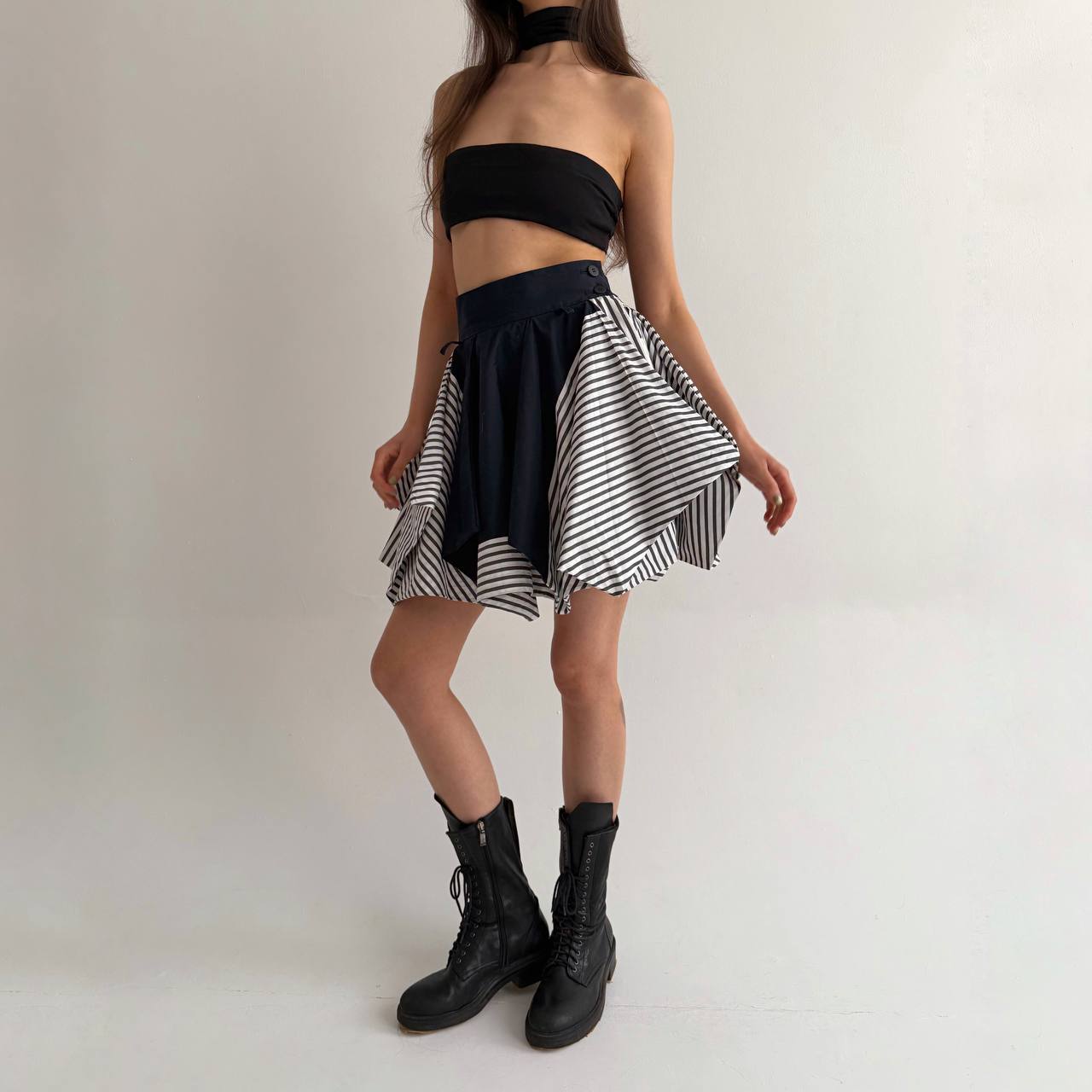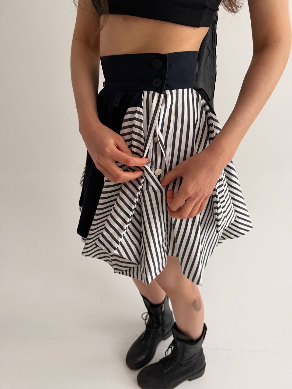 Exceptional archival skirt from Issey Miyake Spring/Summer 1991 Paris runway collection. A rare example of designer’s early exploration of sculptural garment construction, this piece embodies his pioneering approach to clothing as three-dimensional form rather than flat pattern. The skirt is constructed from structured cotton panels, engineered into a dynamic geometric silhouette that transforms with movement and reveals its full complexity when laid flat, resembling an origami-like radial composition. The graphic black and white striped motif reflects Issey Miyake’s interest in rhythm, repetition, and optical structure. A closely related variation of this textile was photographed by Irving Penn and published in his work documenting Miyake, further reinforcing the artistic and historical significance of this design.