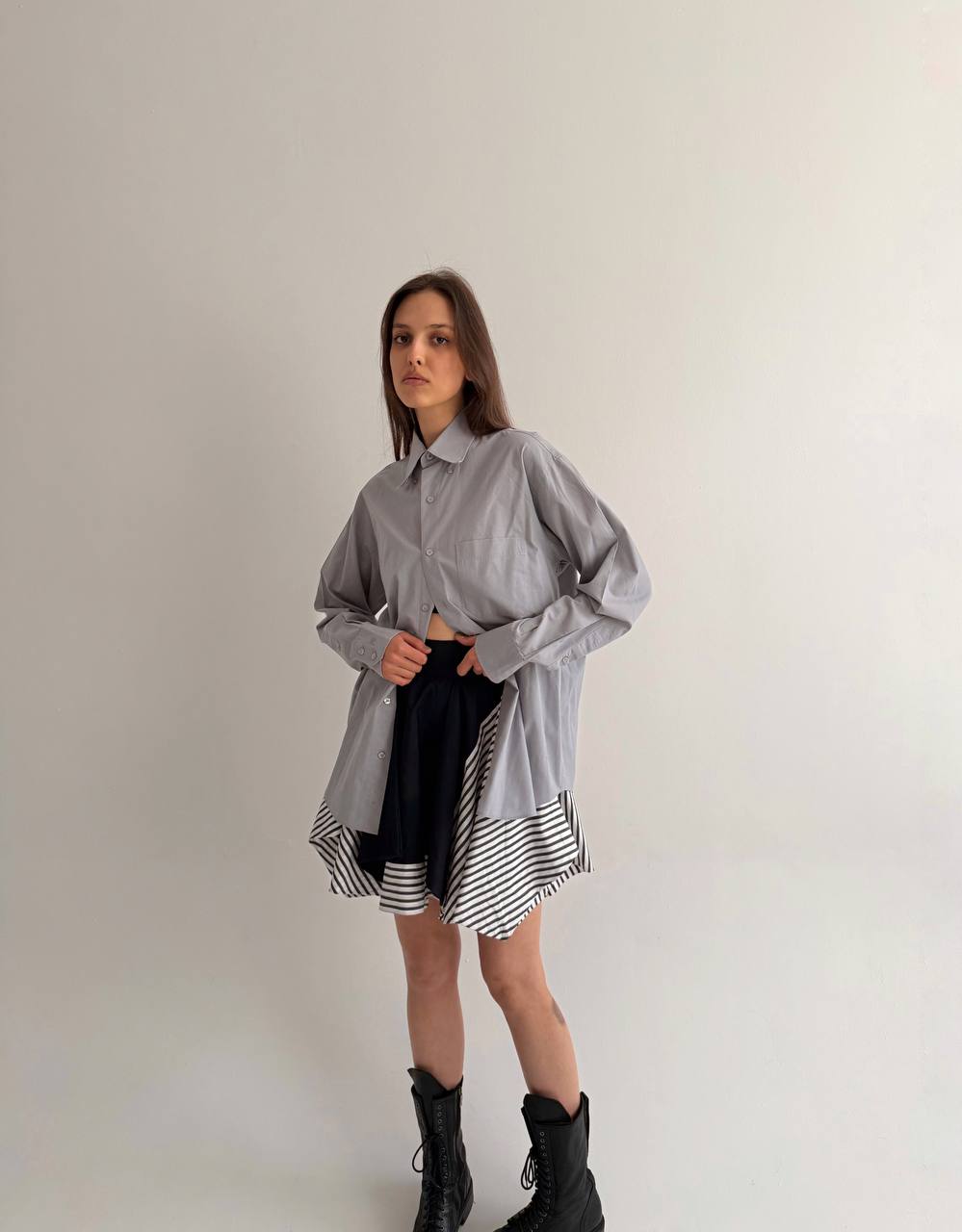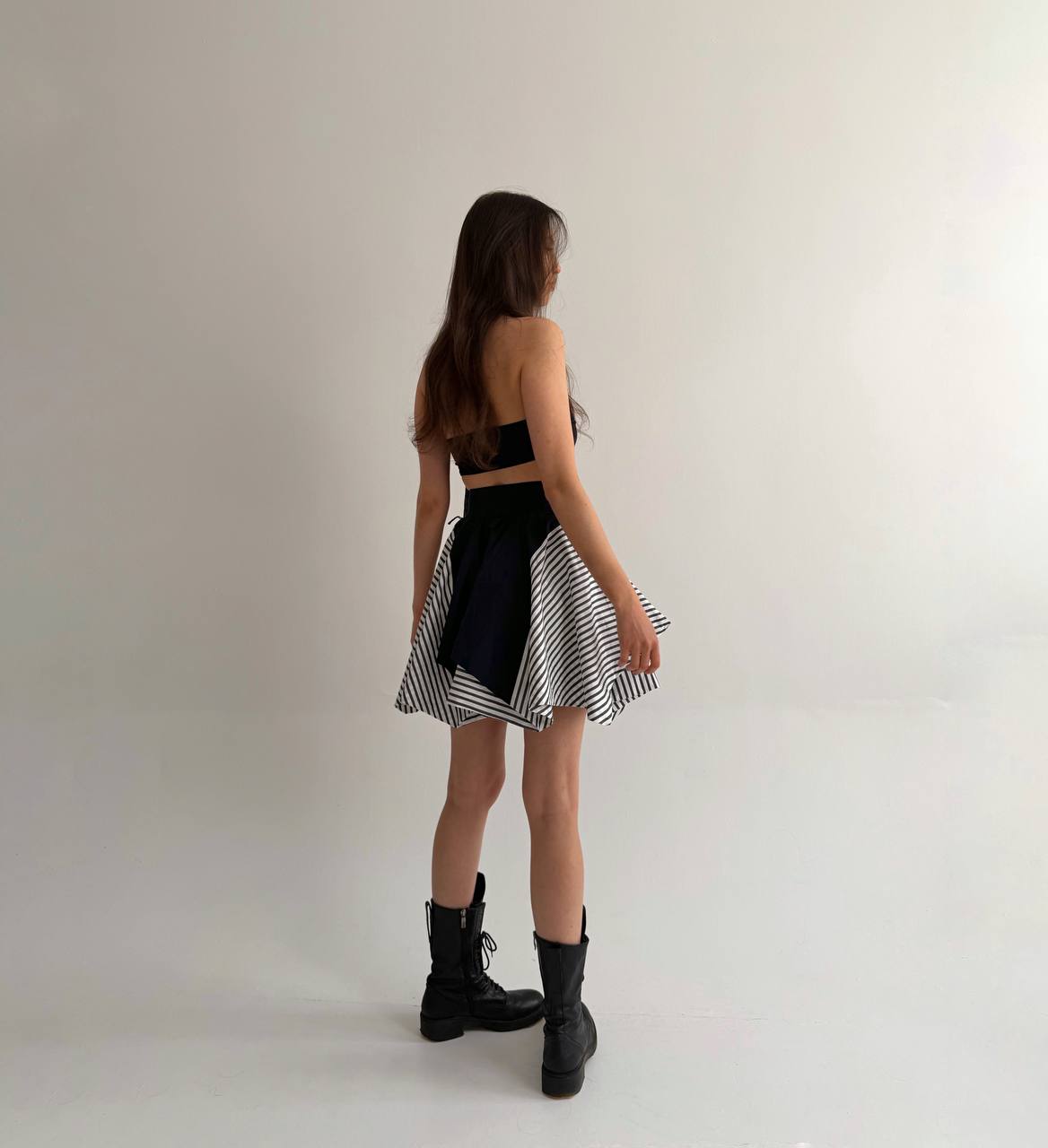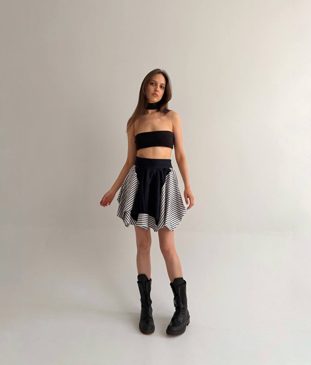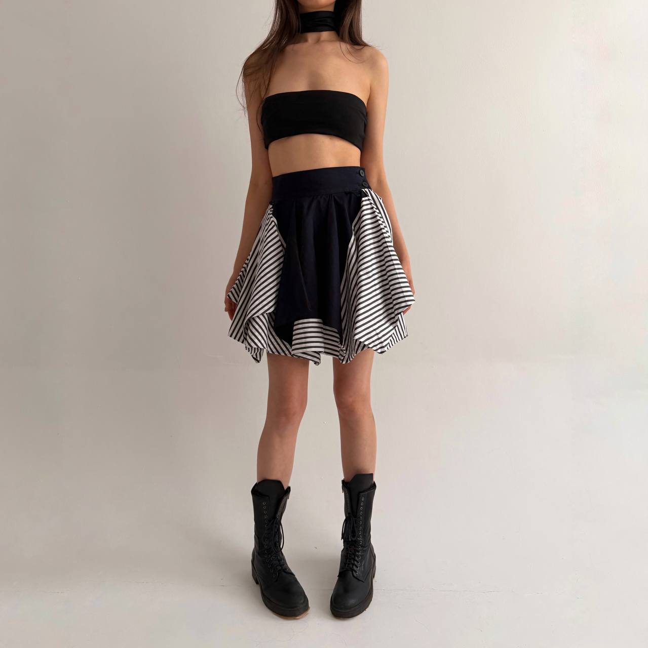 Exceptional archival skirt from Issey Miyake Spring/Summer 1991 Paris runway collection. A rare example of designer’s early exploration of sculptural garment construction, this piece embodies his pioneering approach to clothing as three-dimensional form rather than flat pattern. The skirt is constructed from structured cotton panels, engineered into a dynamic geometric silhouette that transforms with movement and reveals its full complexity when laid flat, resembling an origami-like radial composition. The graphic black and white striped motif reflects Issey Miyake’s interest in rhythm, repetition, and optical structure. A closely related variation of this textile was photographed by Irving Penn and published in his work documenting Miyake, further reinforcing the artistic and historical significance of this design.