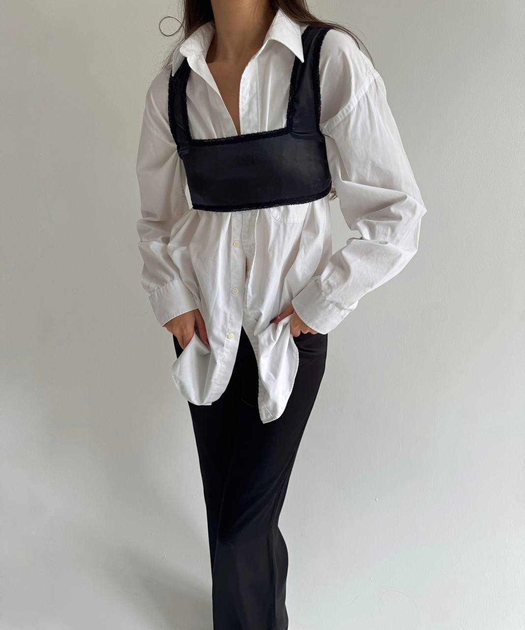 Jean Paul Gaultier black satin mini top with lace trim