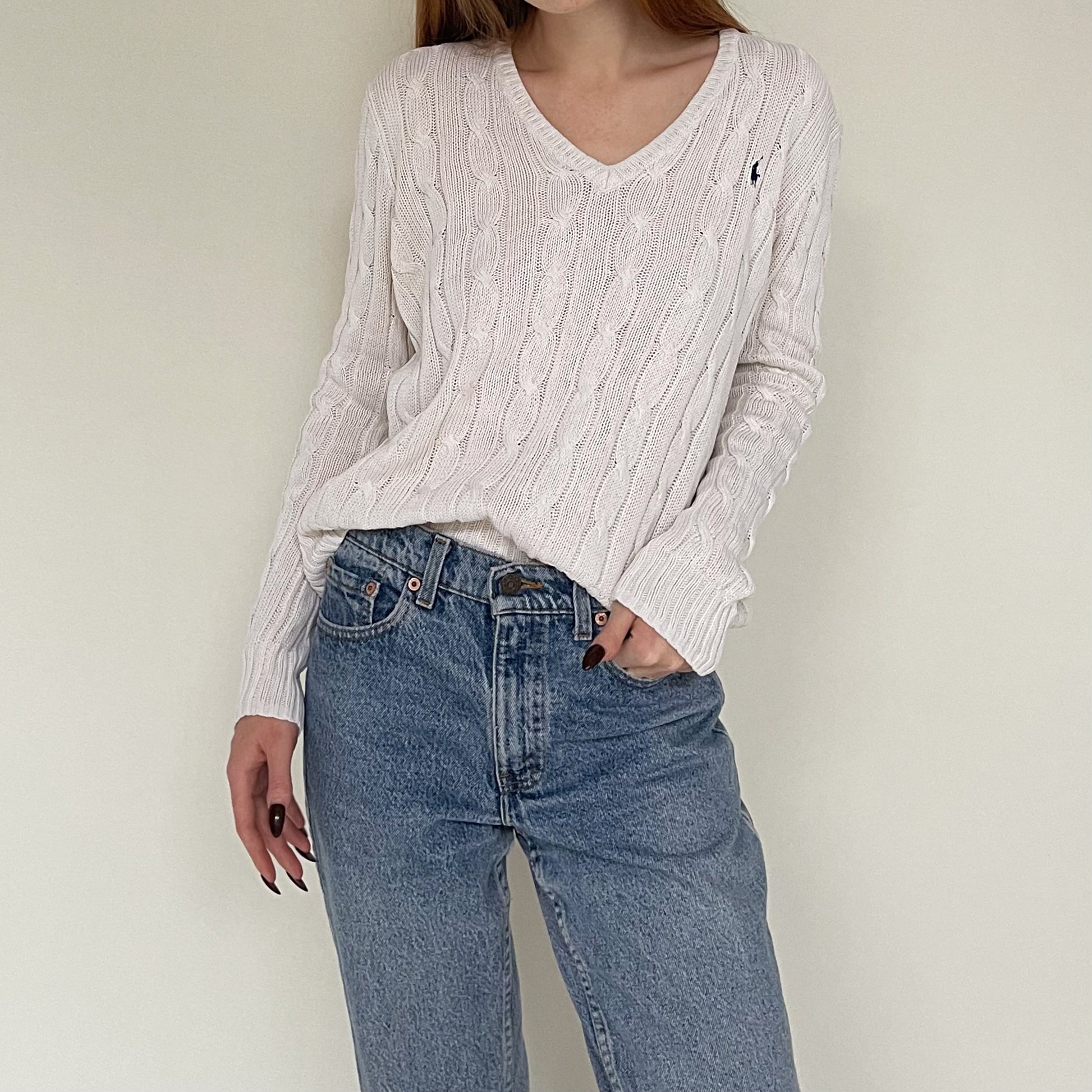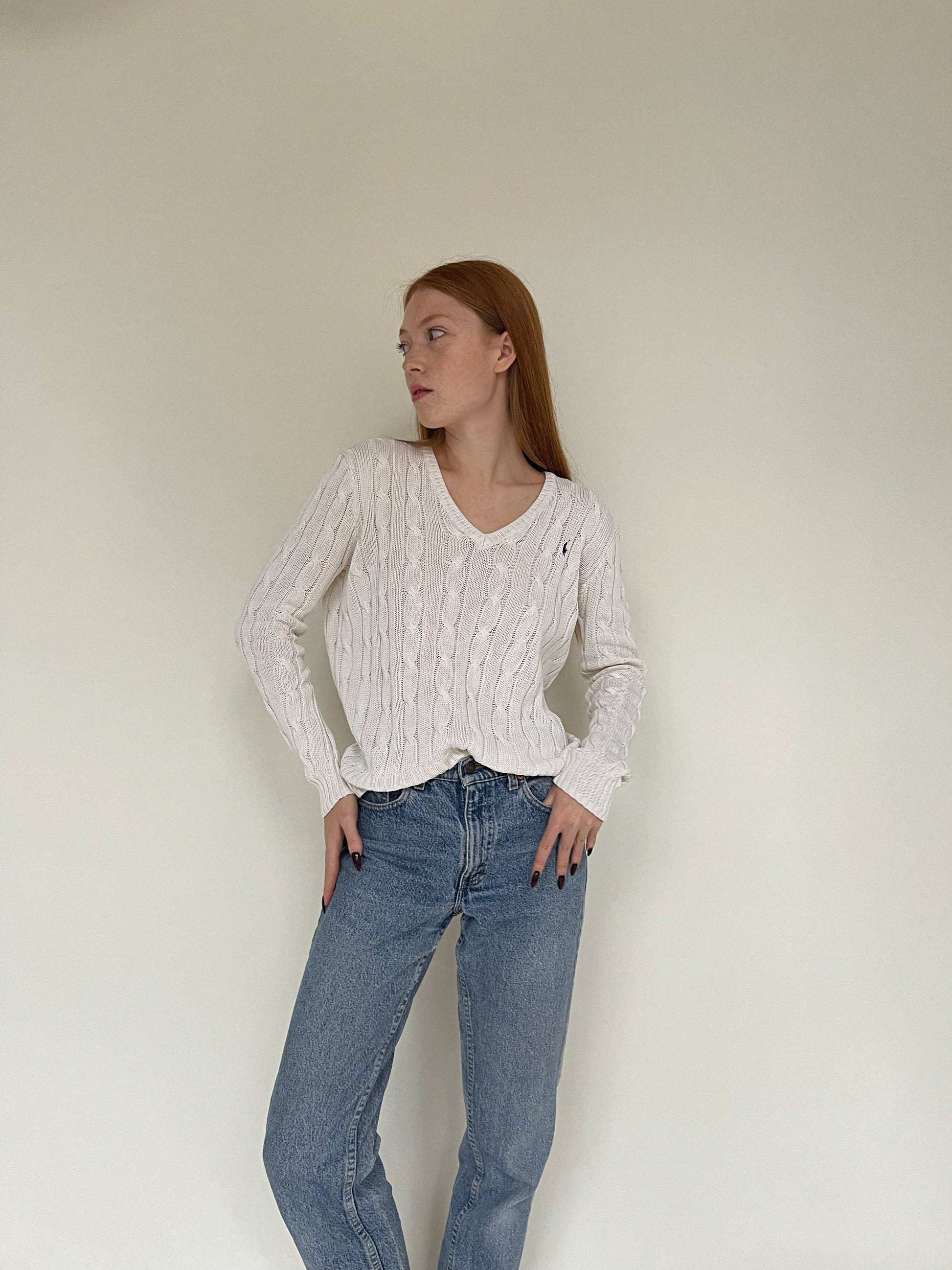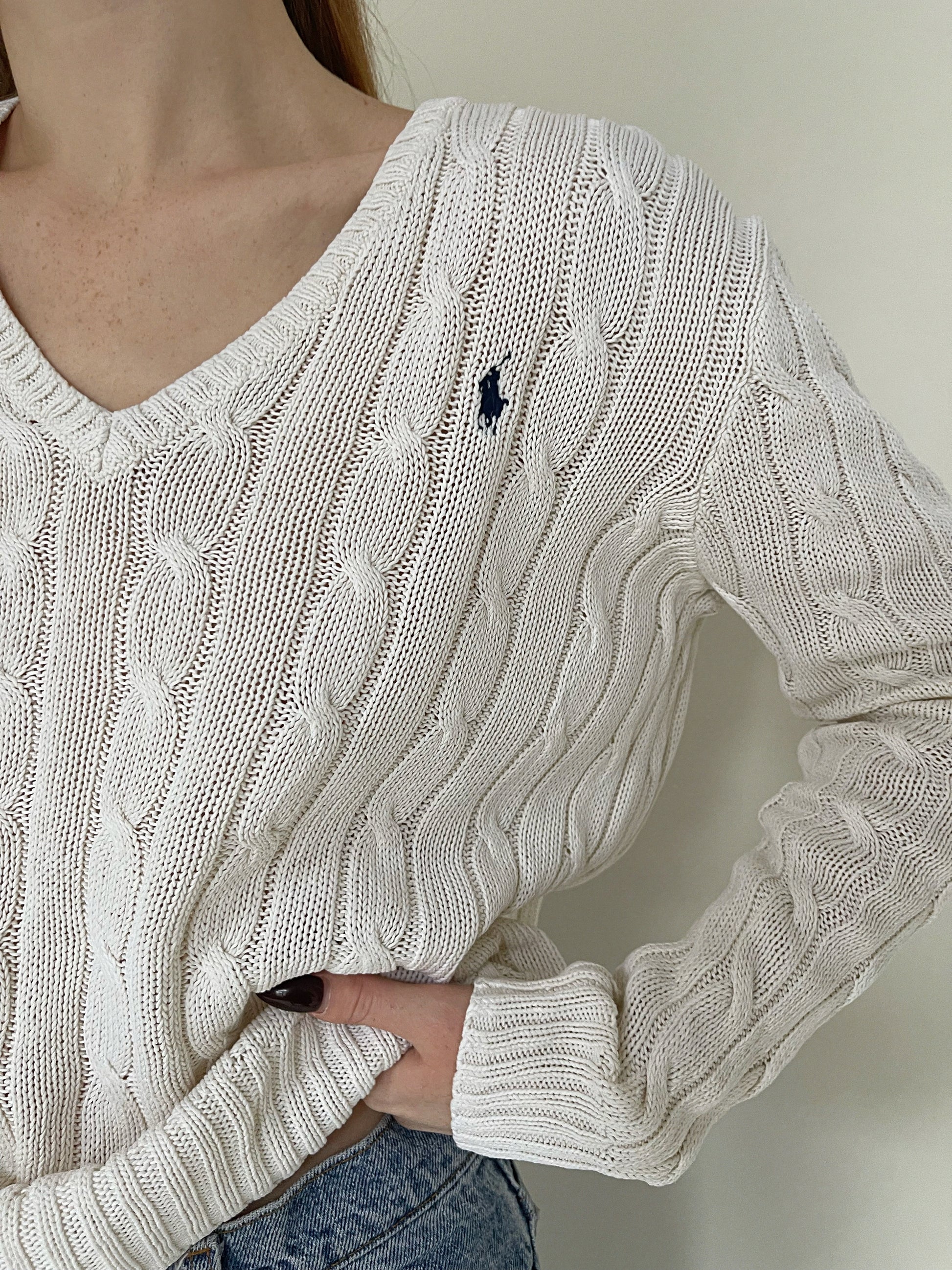 Ralph Lauren white cable knit 100% cotton V-neck sweater