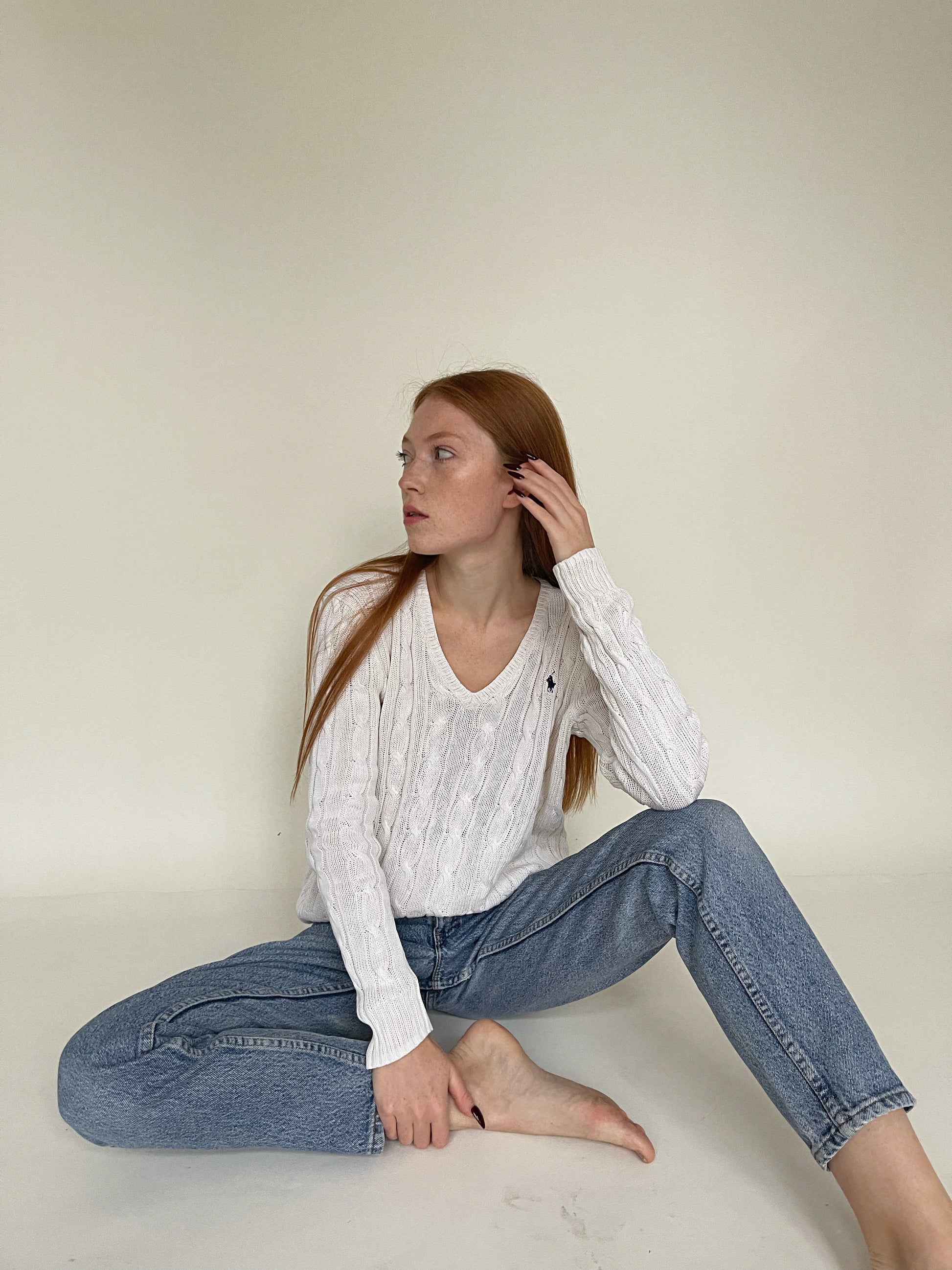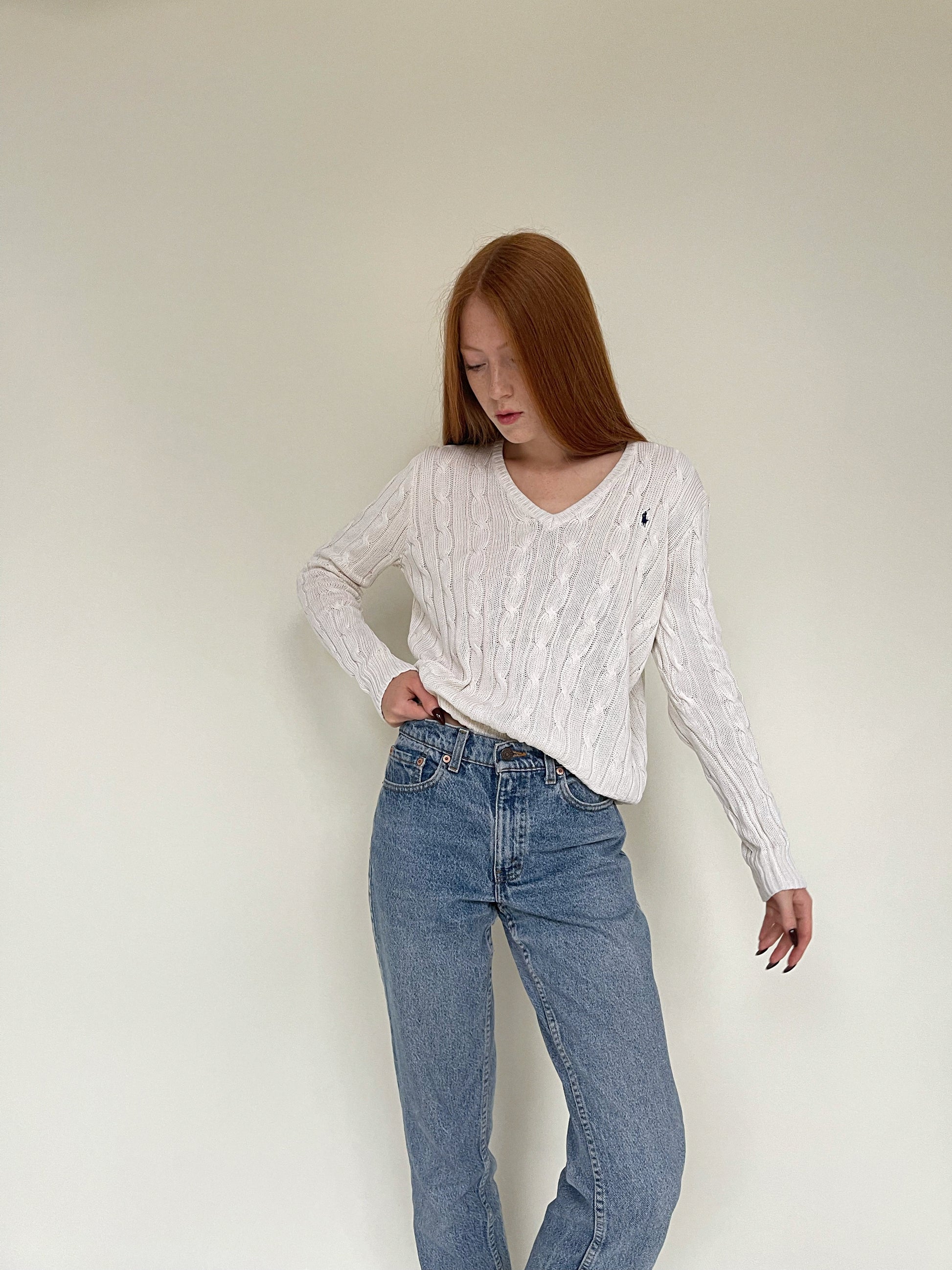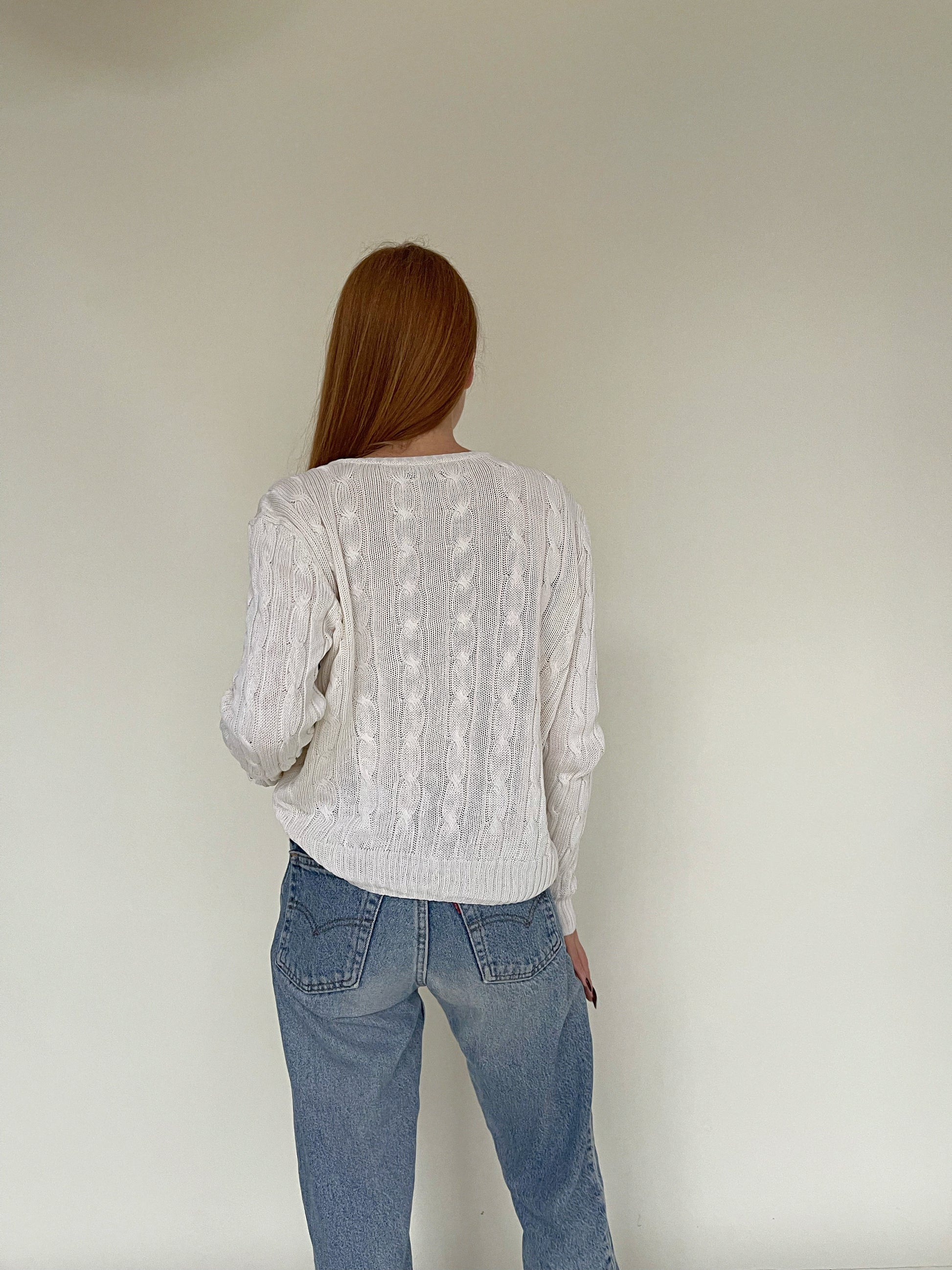 Ralph Lauren white cable knit 100% cotton V-neck sweater
