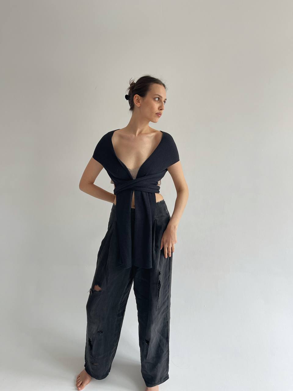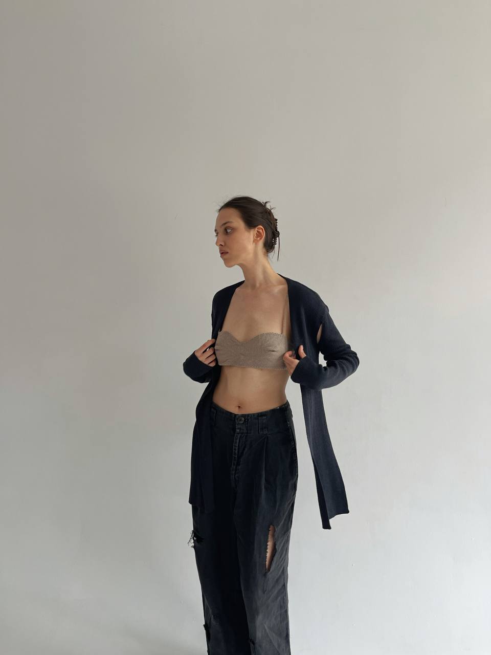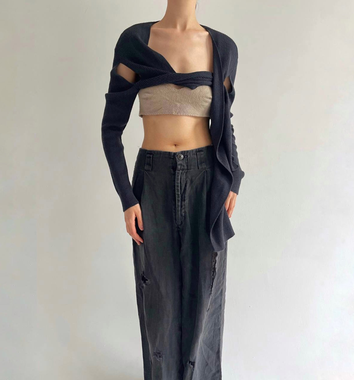 Sarah Pacini dark fade navy deconstructed ribbed cardigan which you can wear different ways made of 50% wool