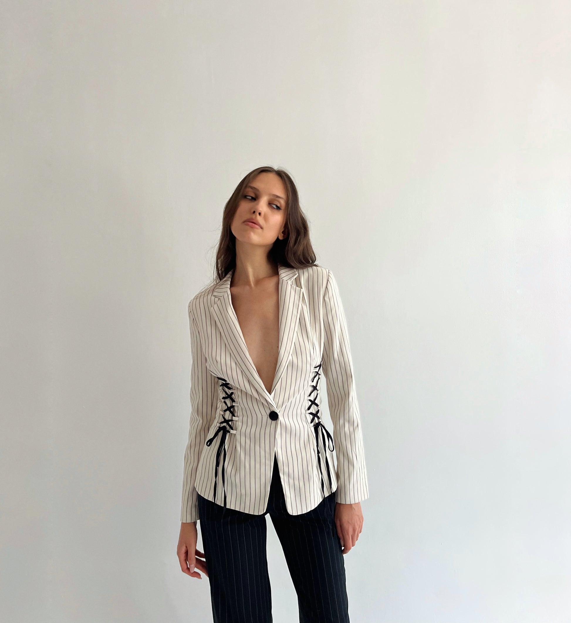 Beige striped fitted blazer with corset like lace up detailing on sides