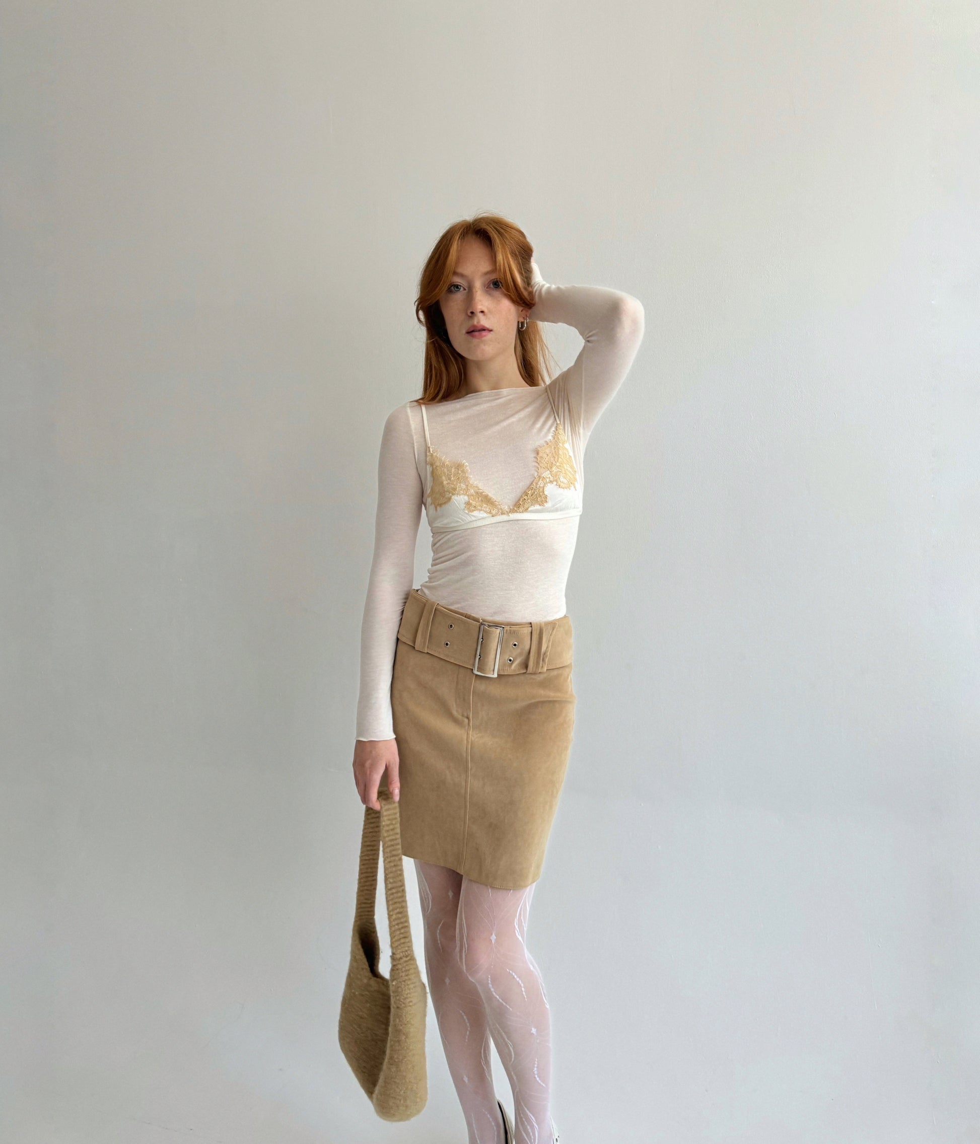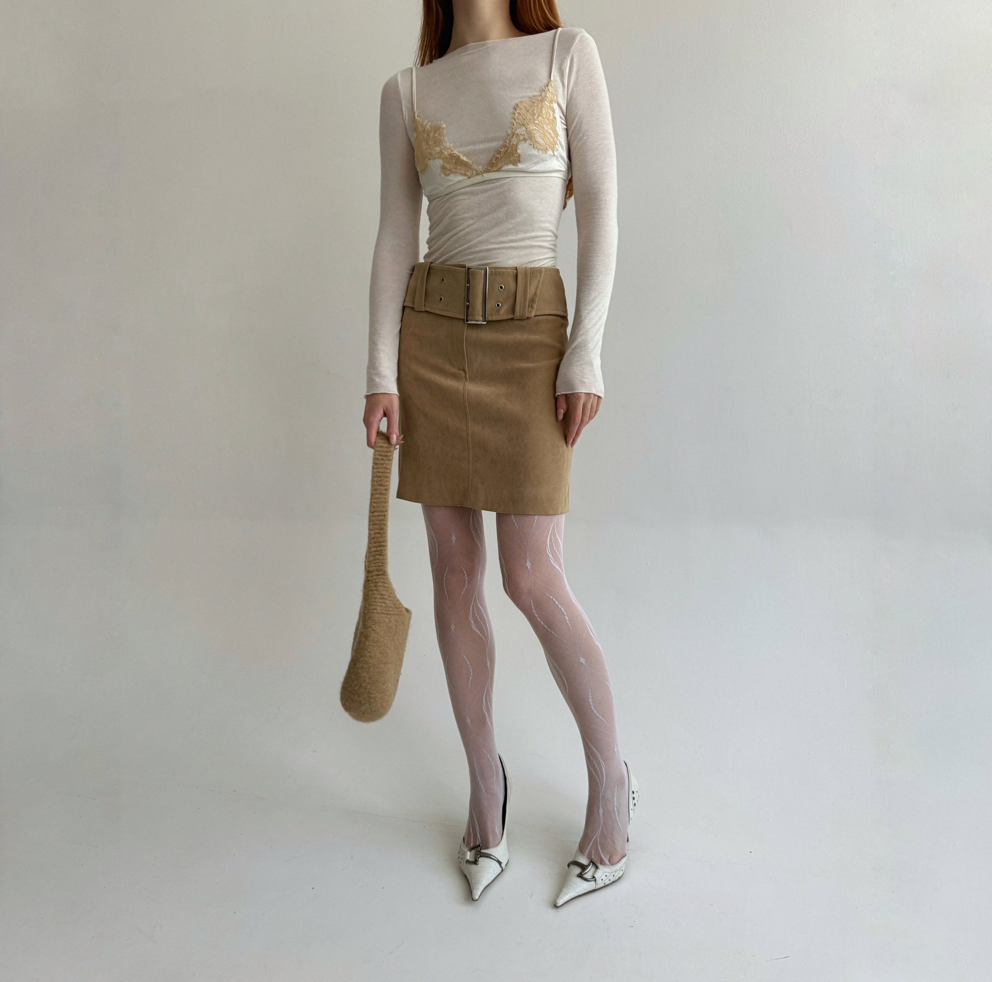 Vintage made in France beige mini skirt with silver tone rectangular buckle and sewn belt
