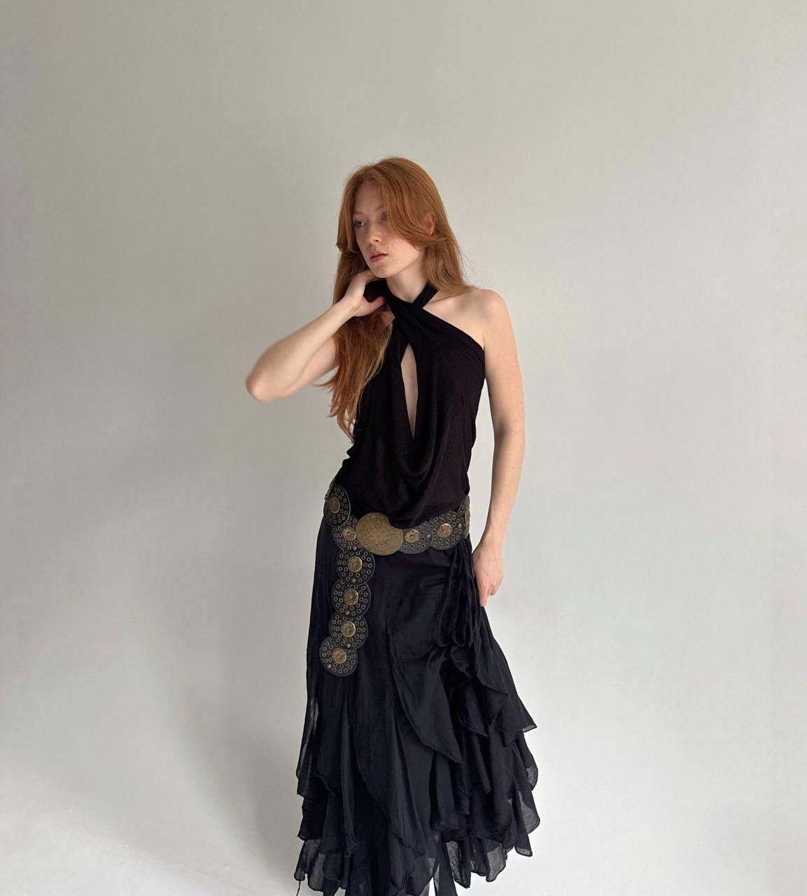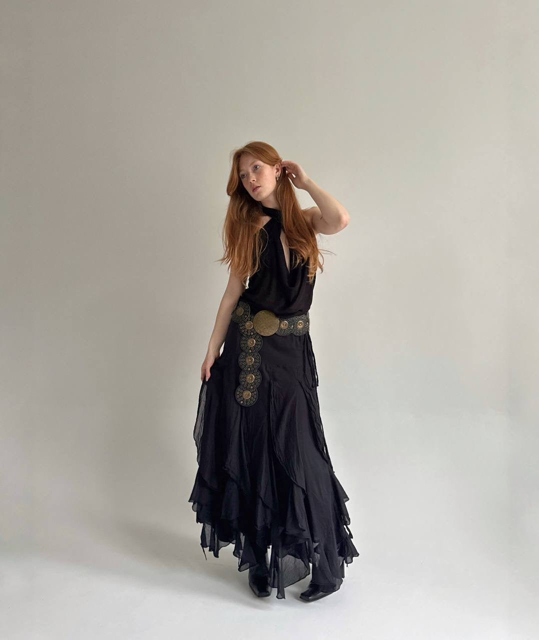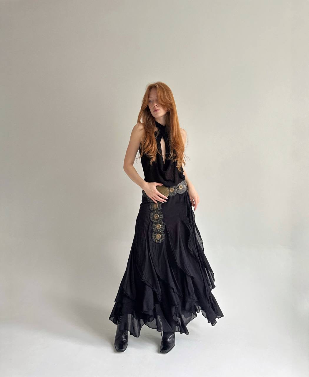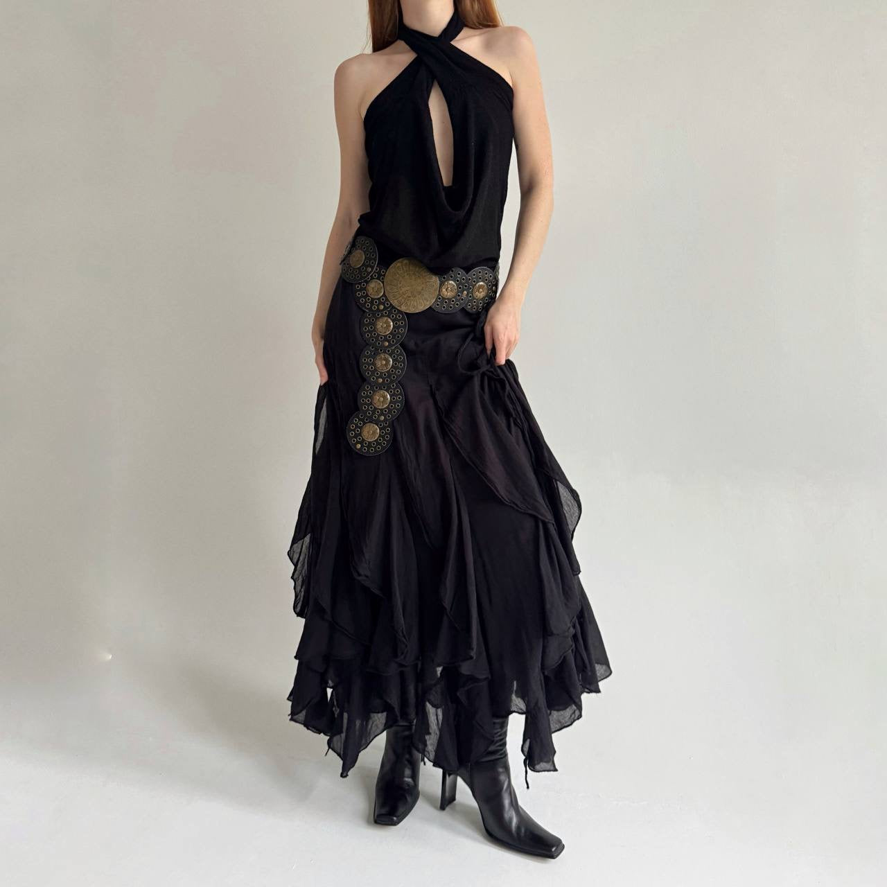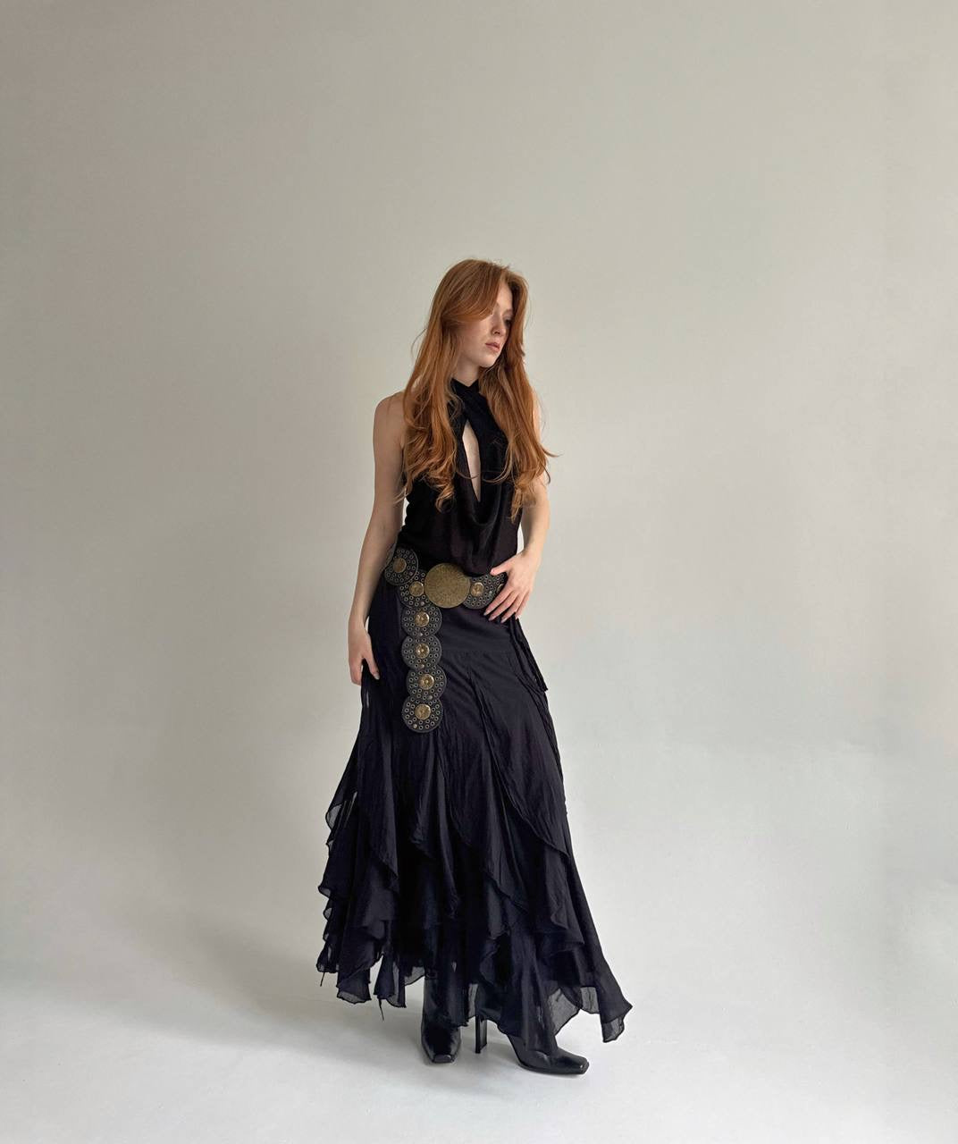 Vintage cotton black ruffled maxi skirt