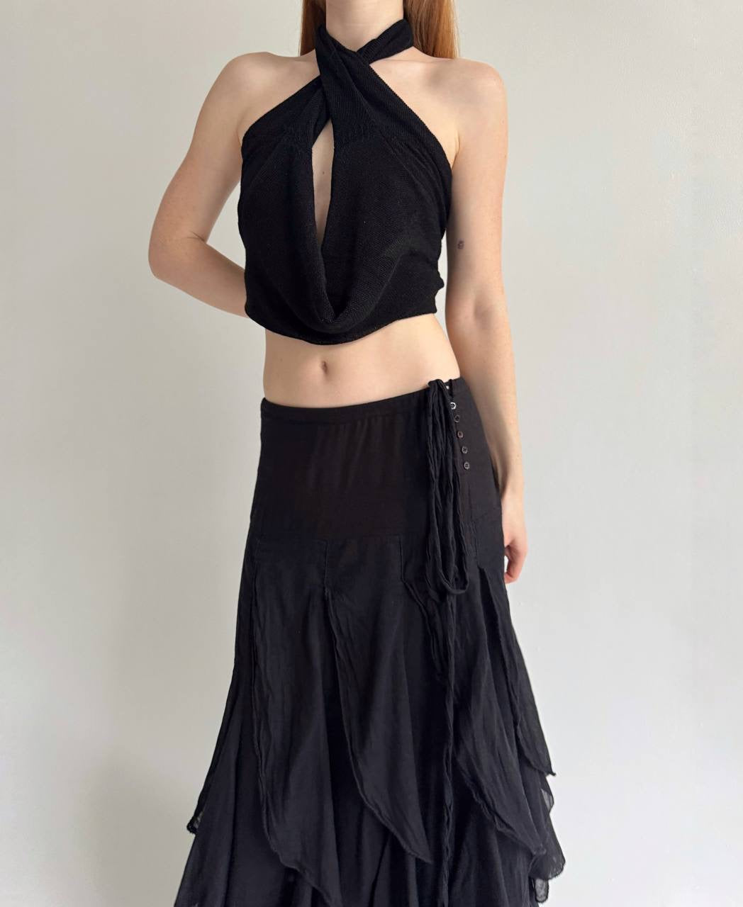Vintage cotton black ruffled maxi skirt with side buttons and a waist tie