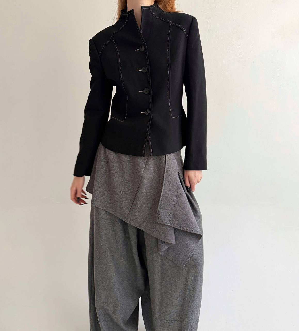 Vintage 45% viscose black button up blazer with stand collar and white stitching