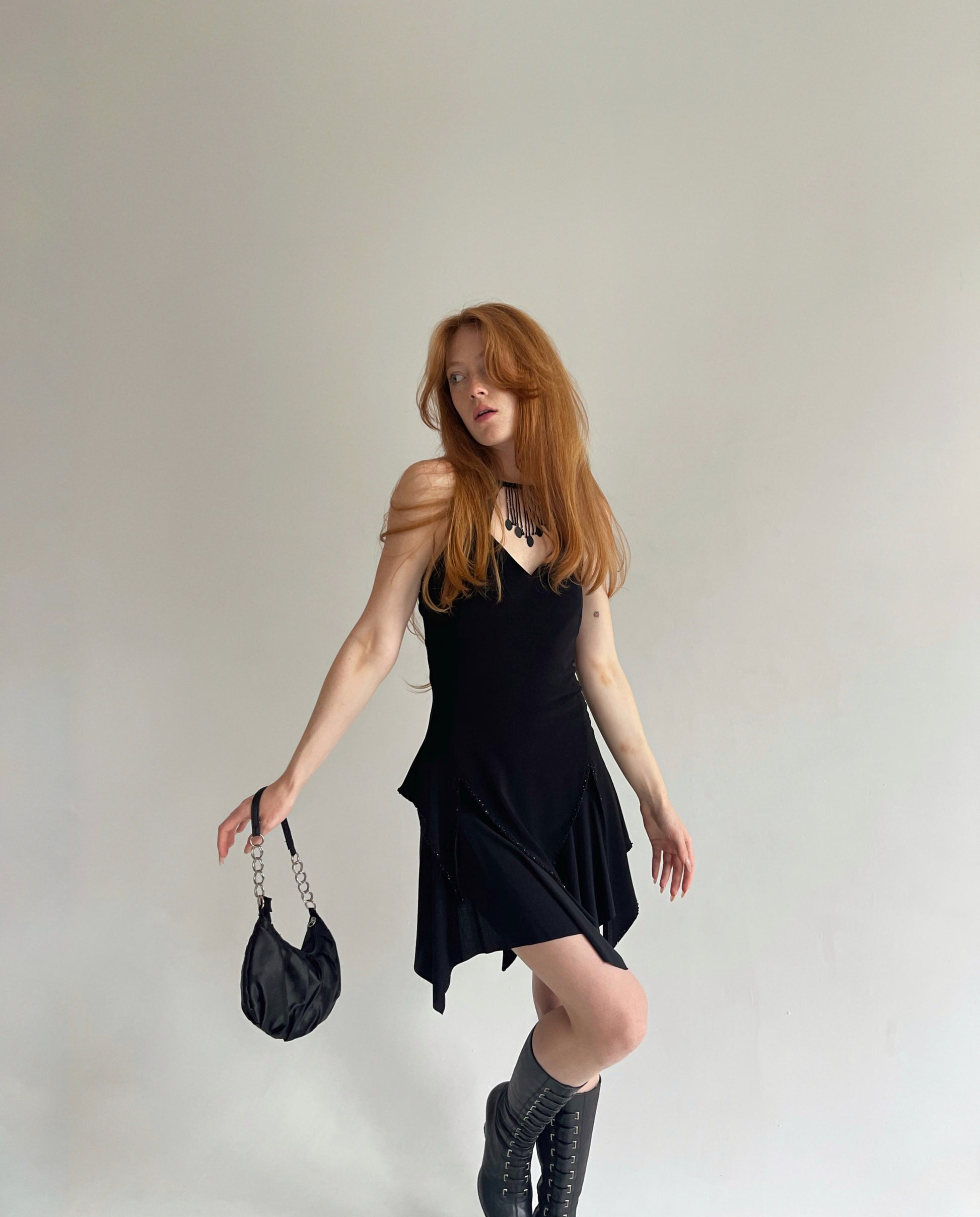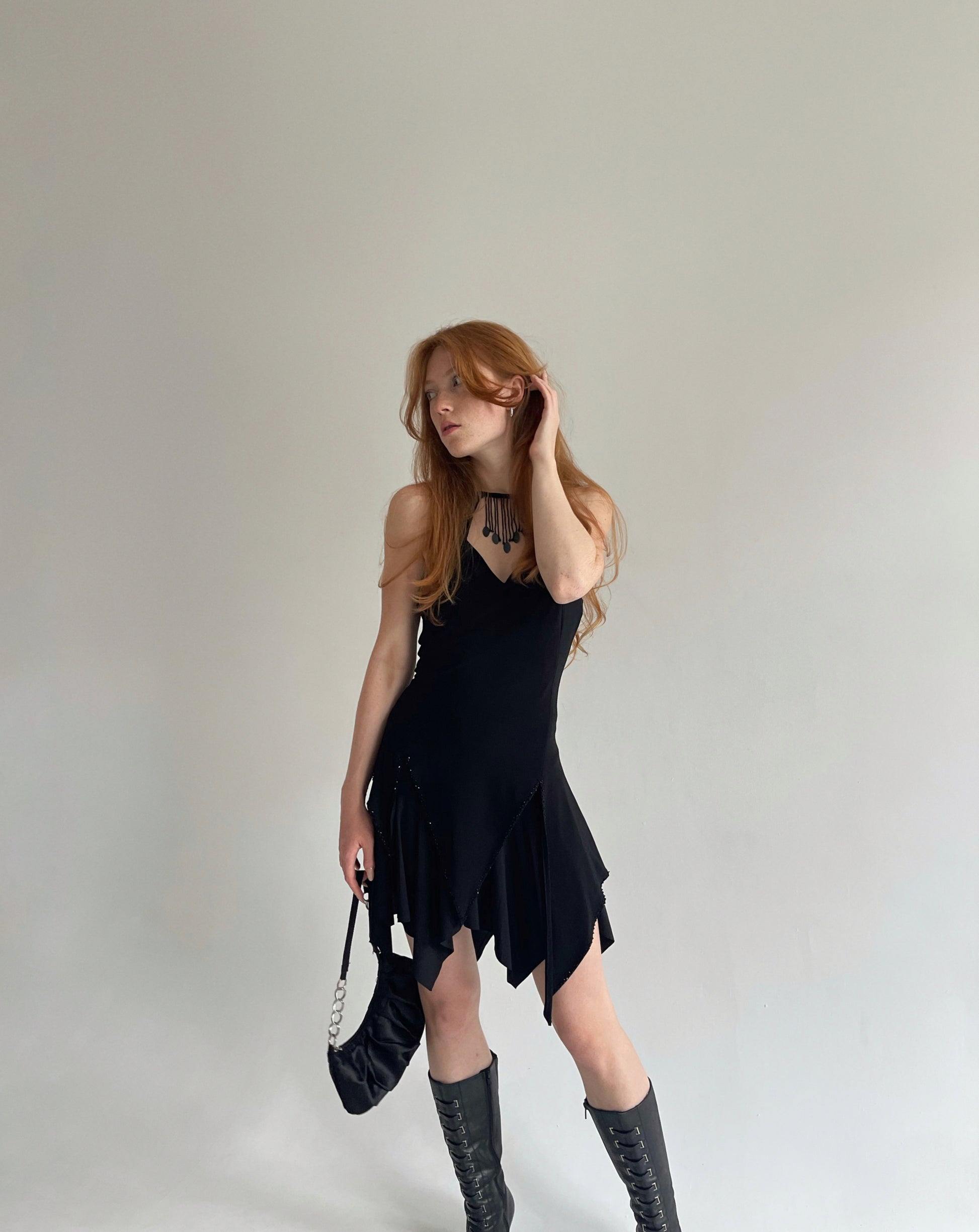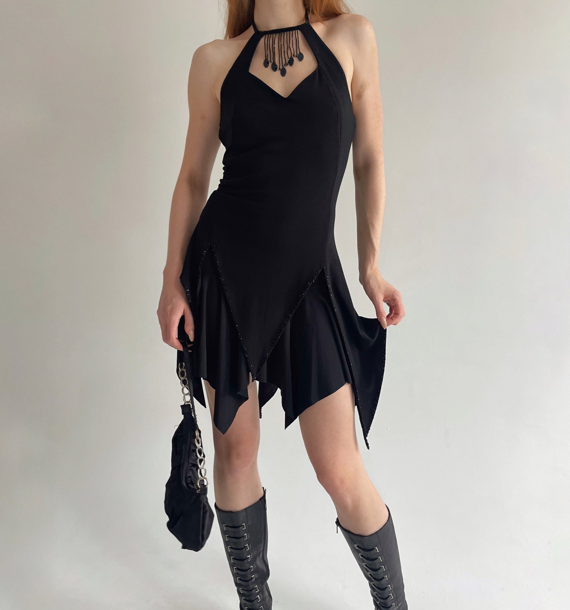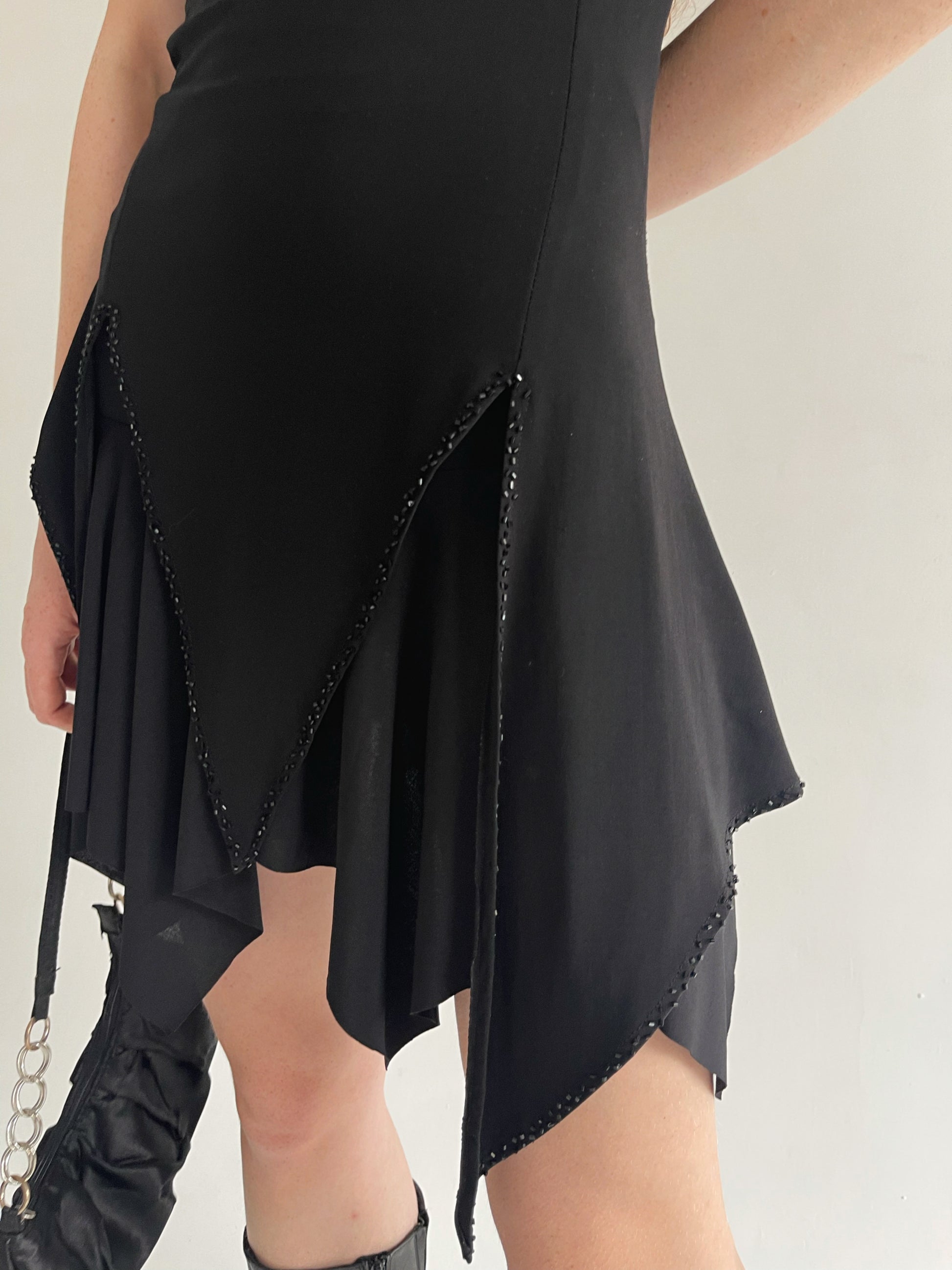 Vintage black stretchy asymmetrical bottom trim blouse with beads and chest embellishment