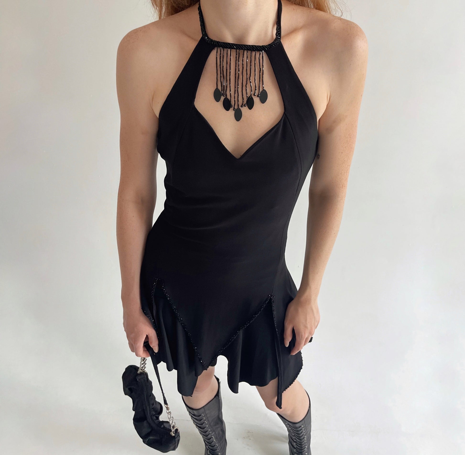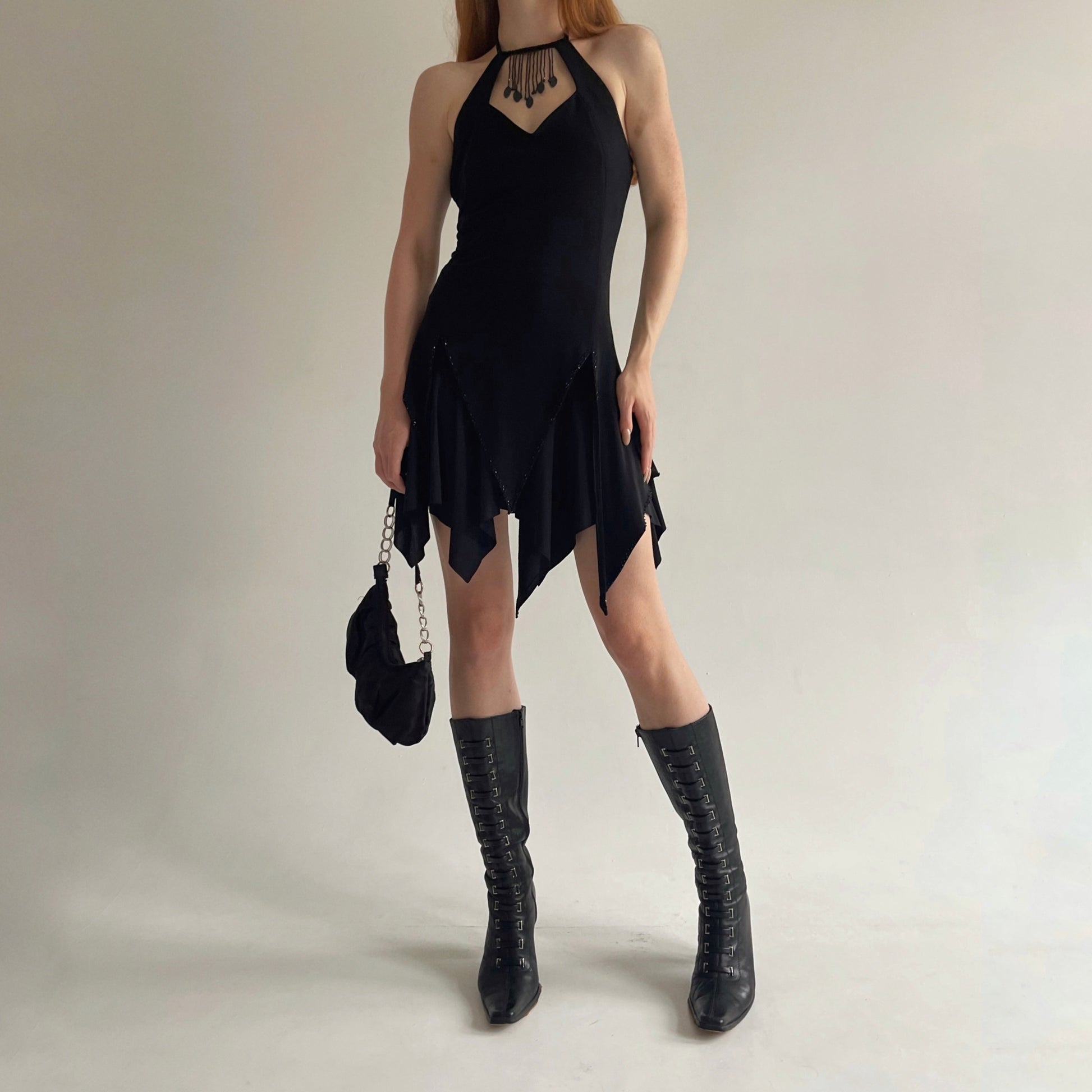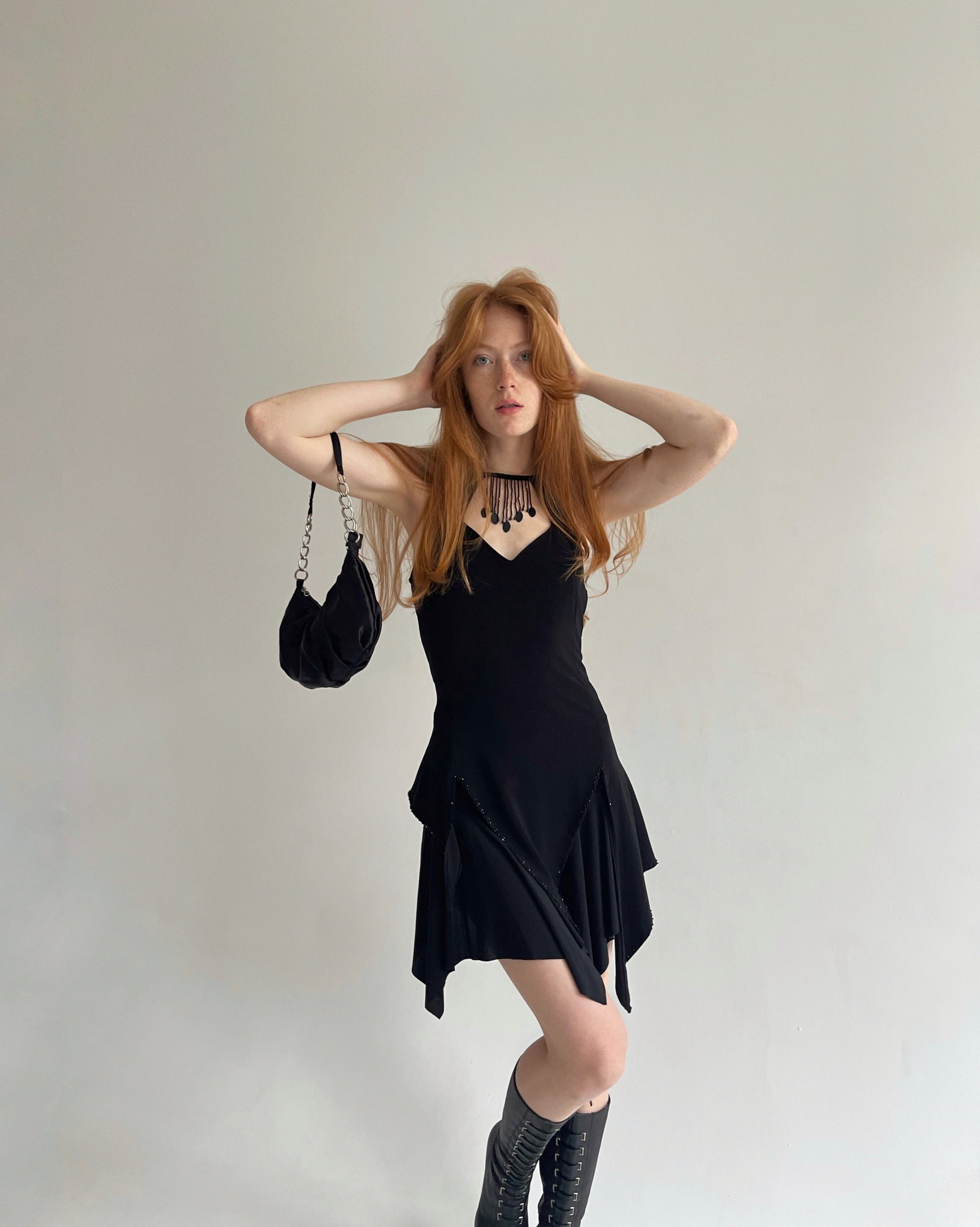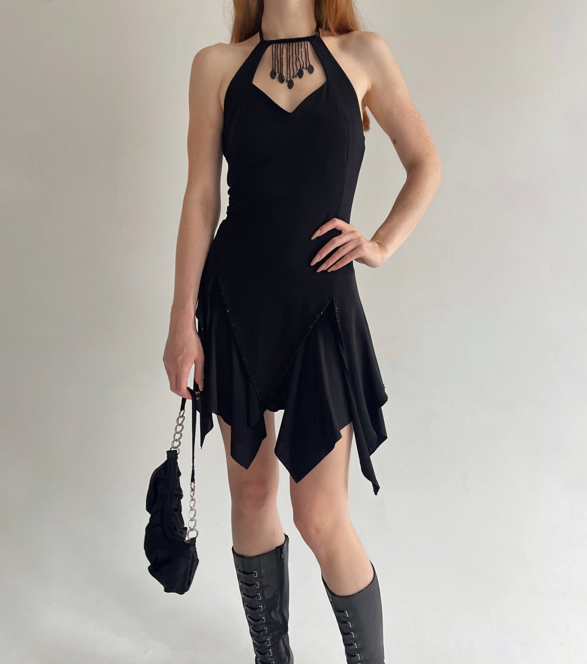 Vintage black stretchy asymmetrical bottom trim blouse with beads and chest embellishment