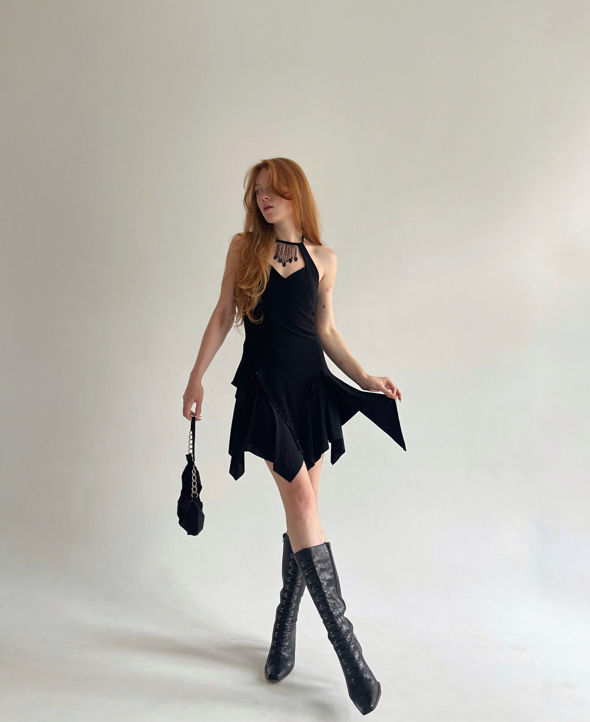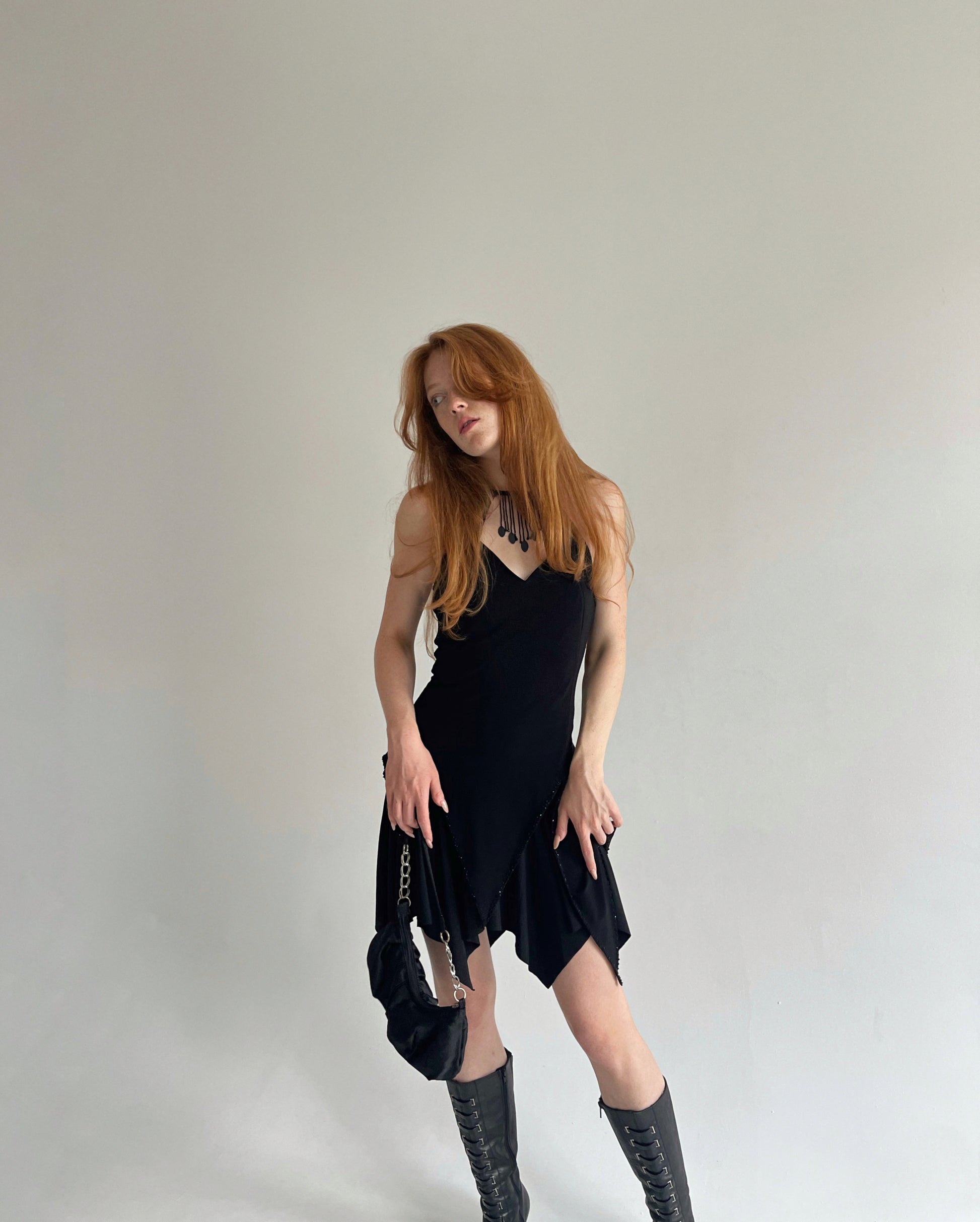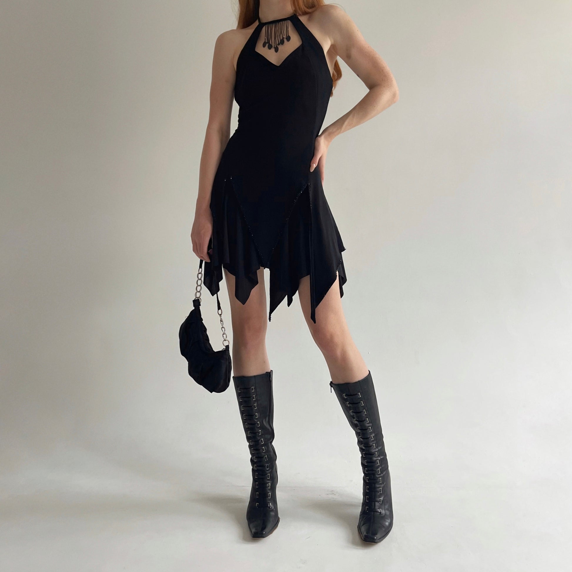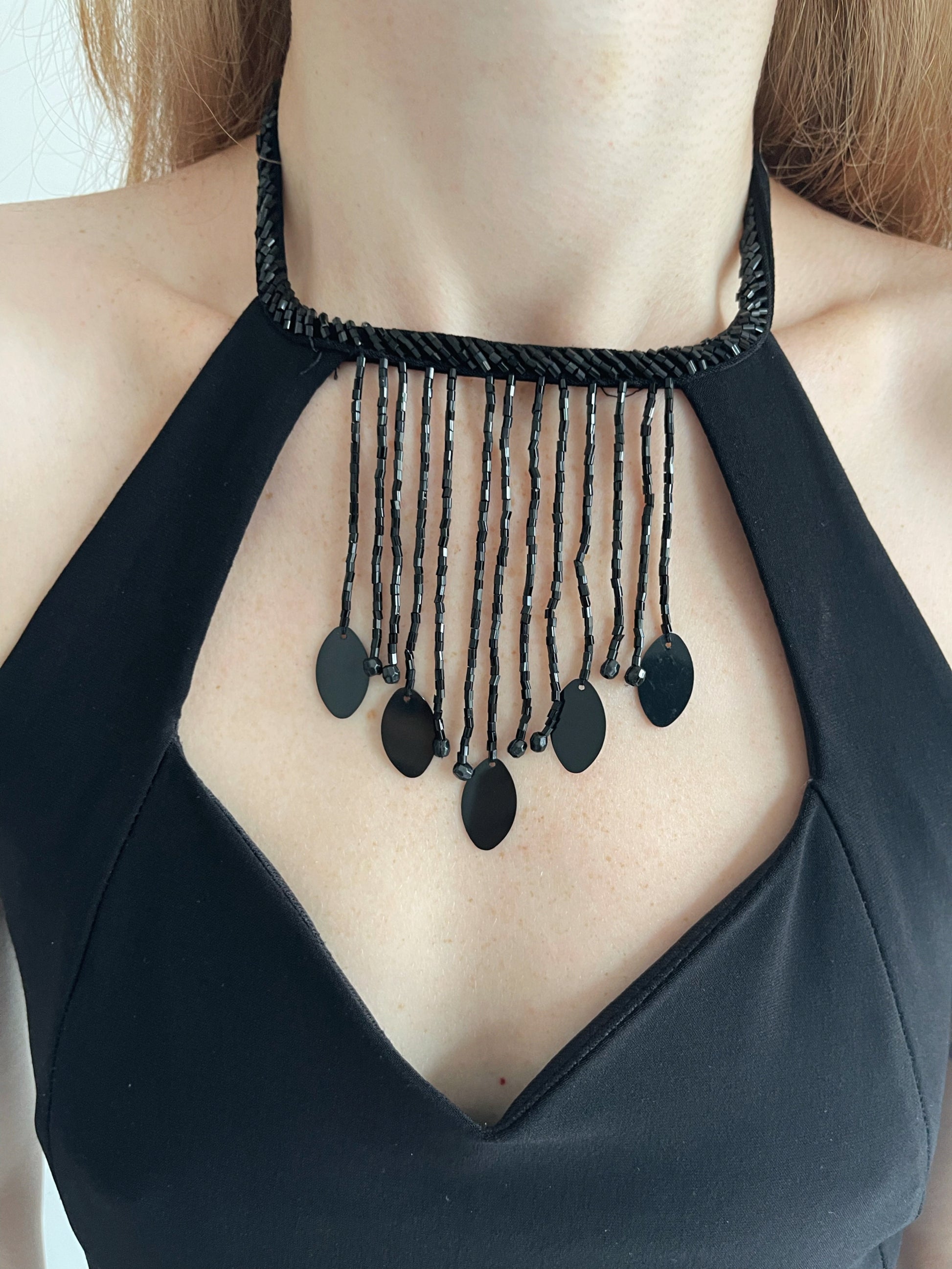 Vintage black stretchy asymmetrical bottom trim blouse with beads and chest embellishment