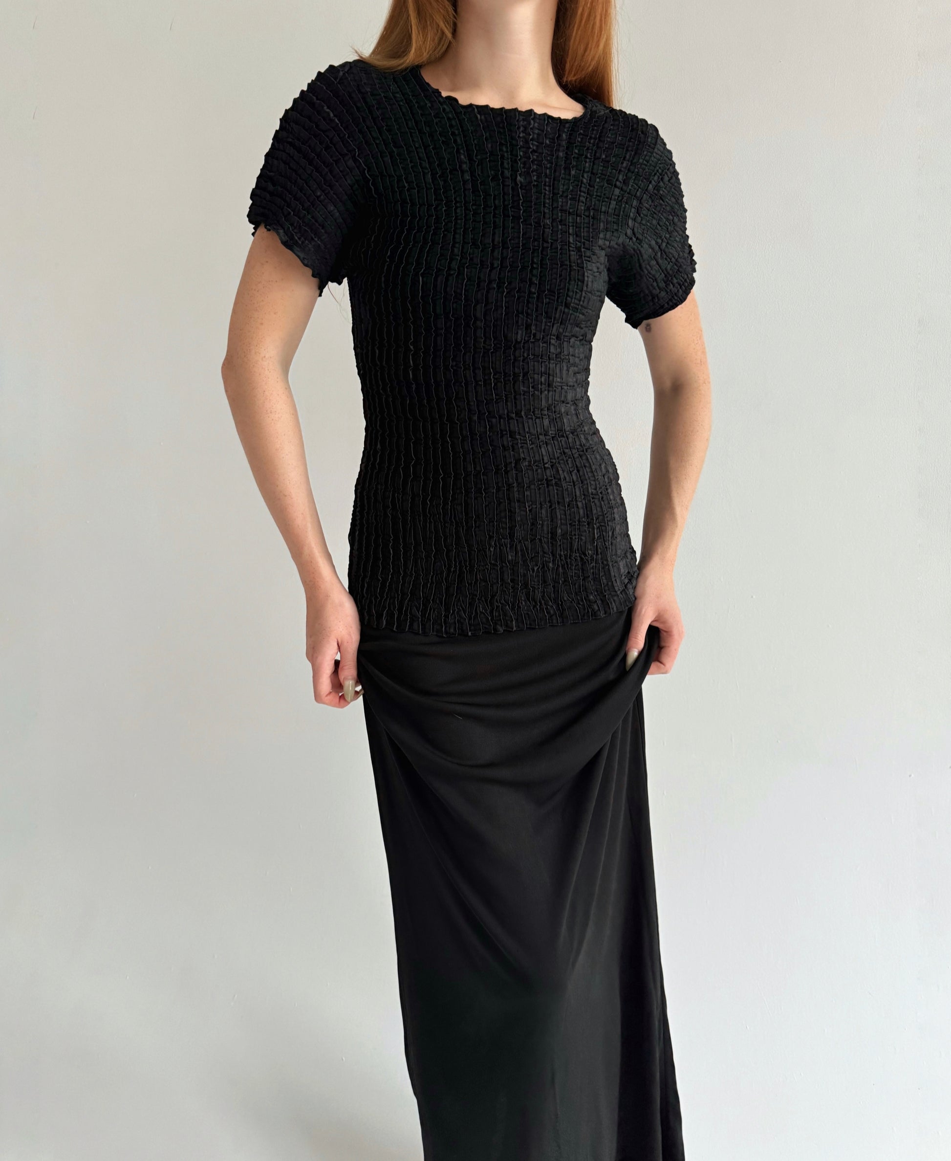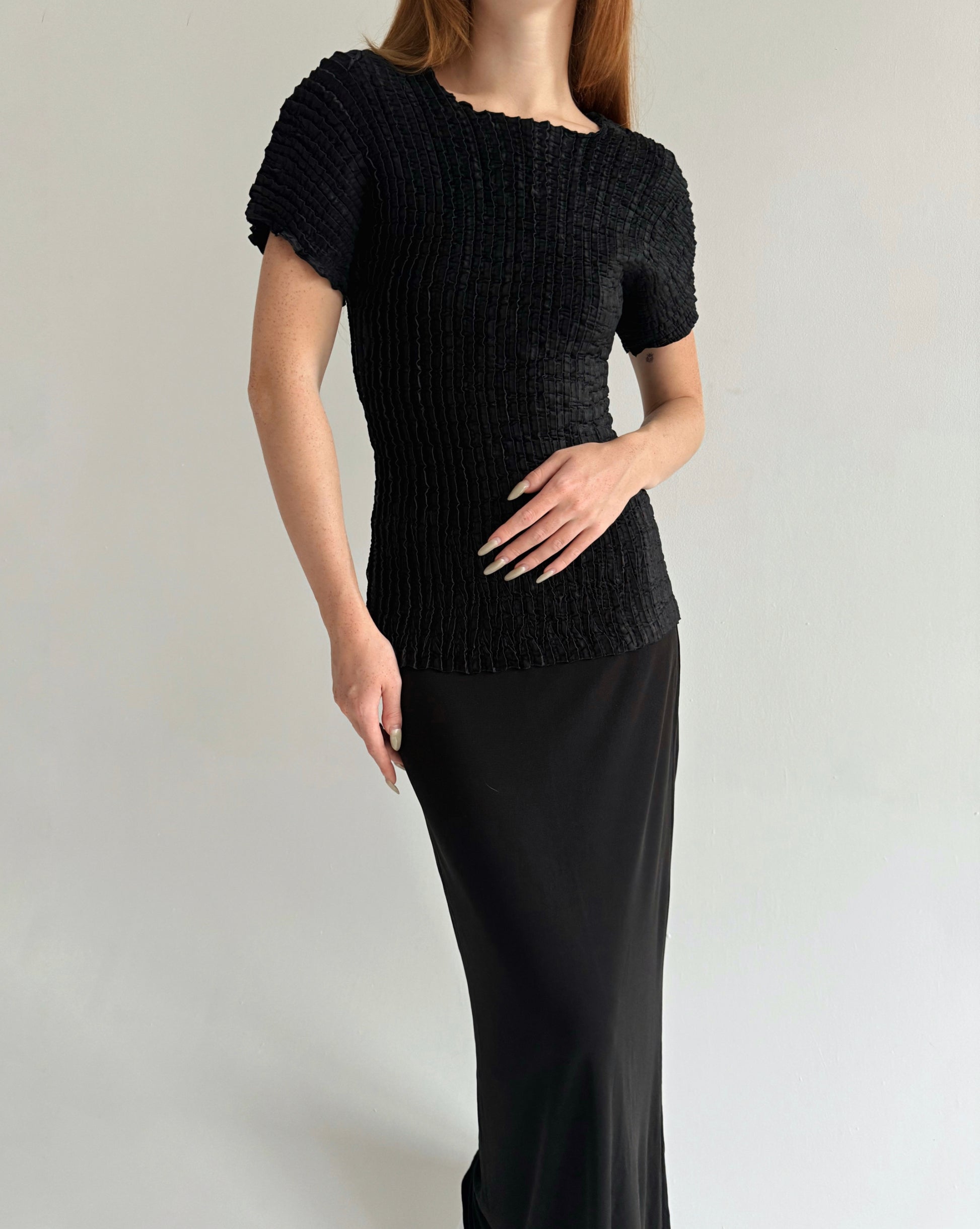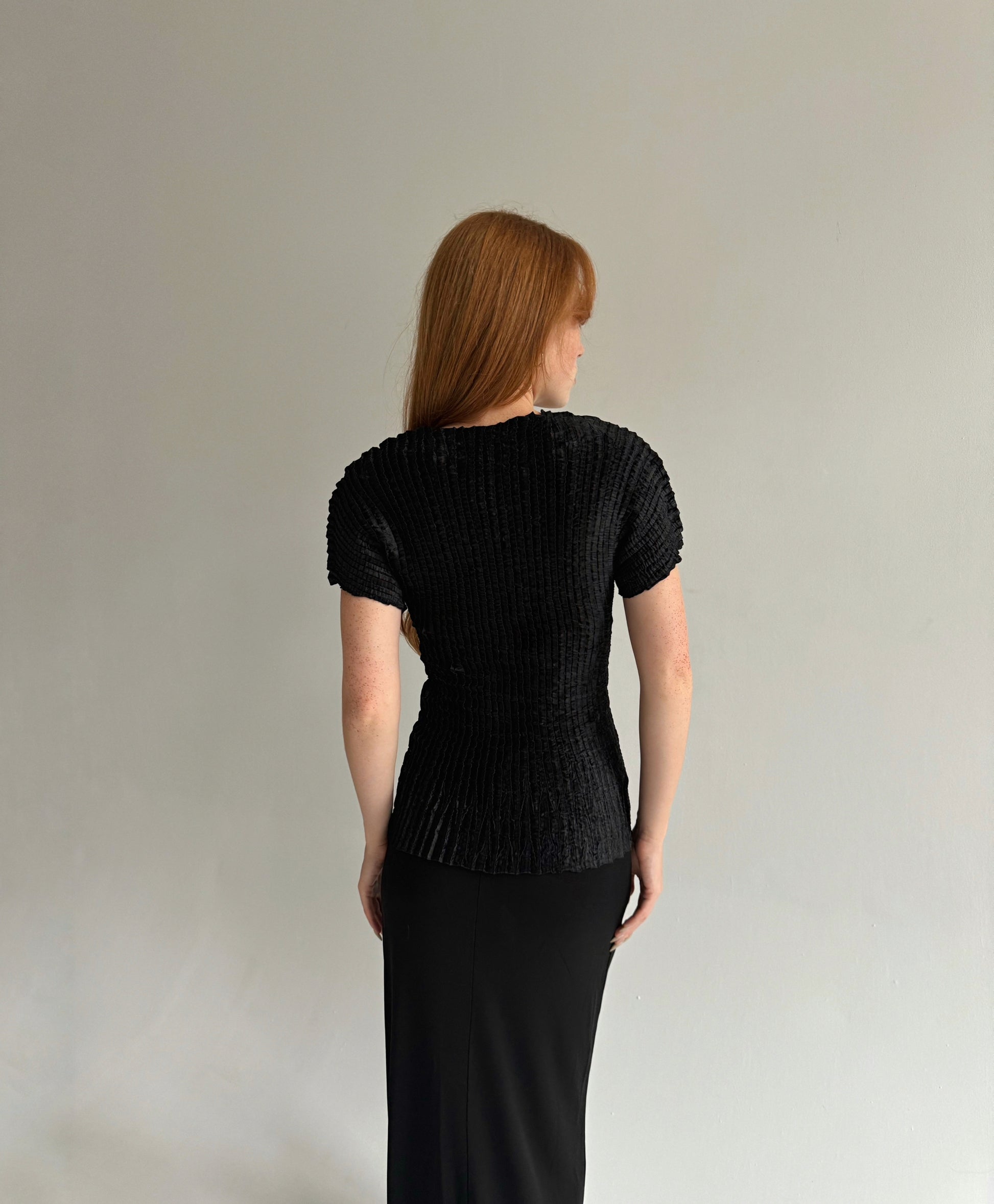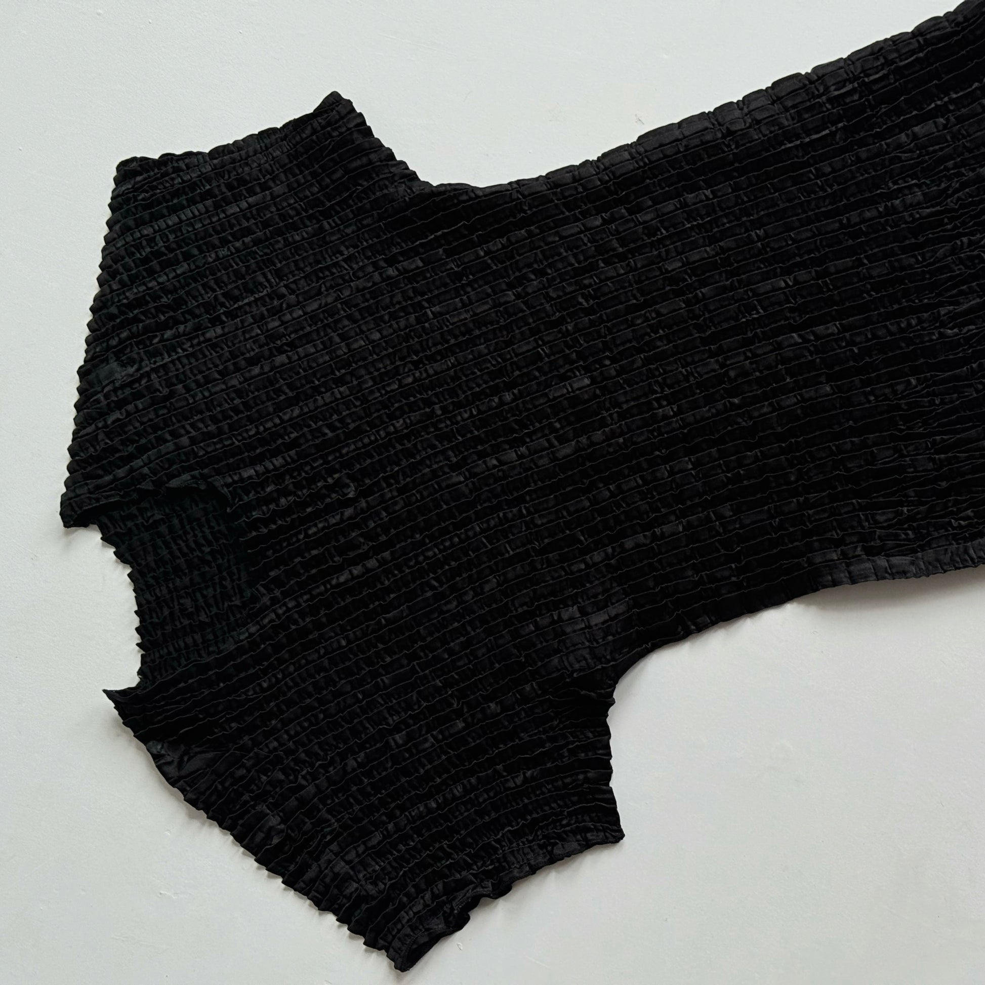 Vintage avant garde made in France pleated crinkle black satin blouse with short sleeves