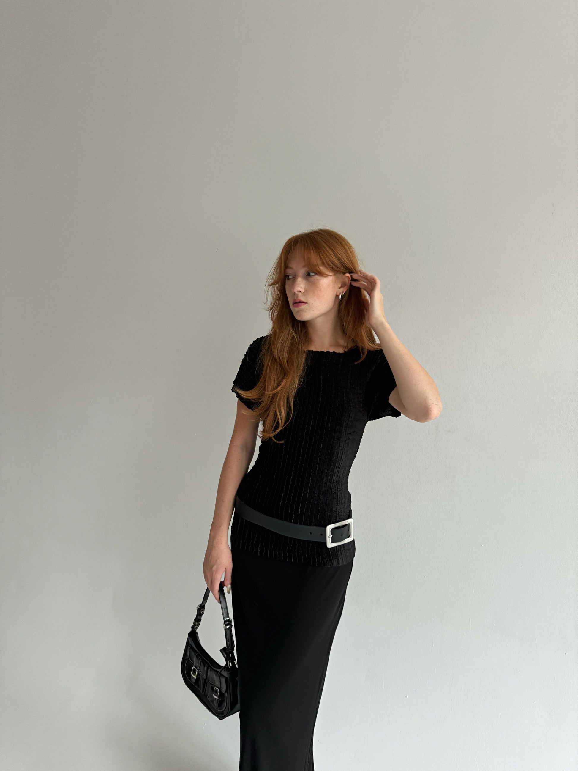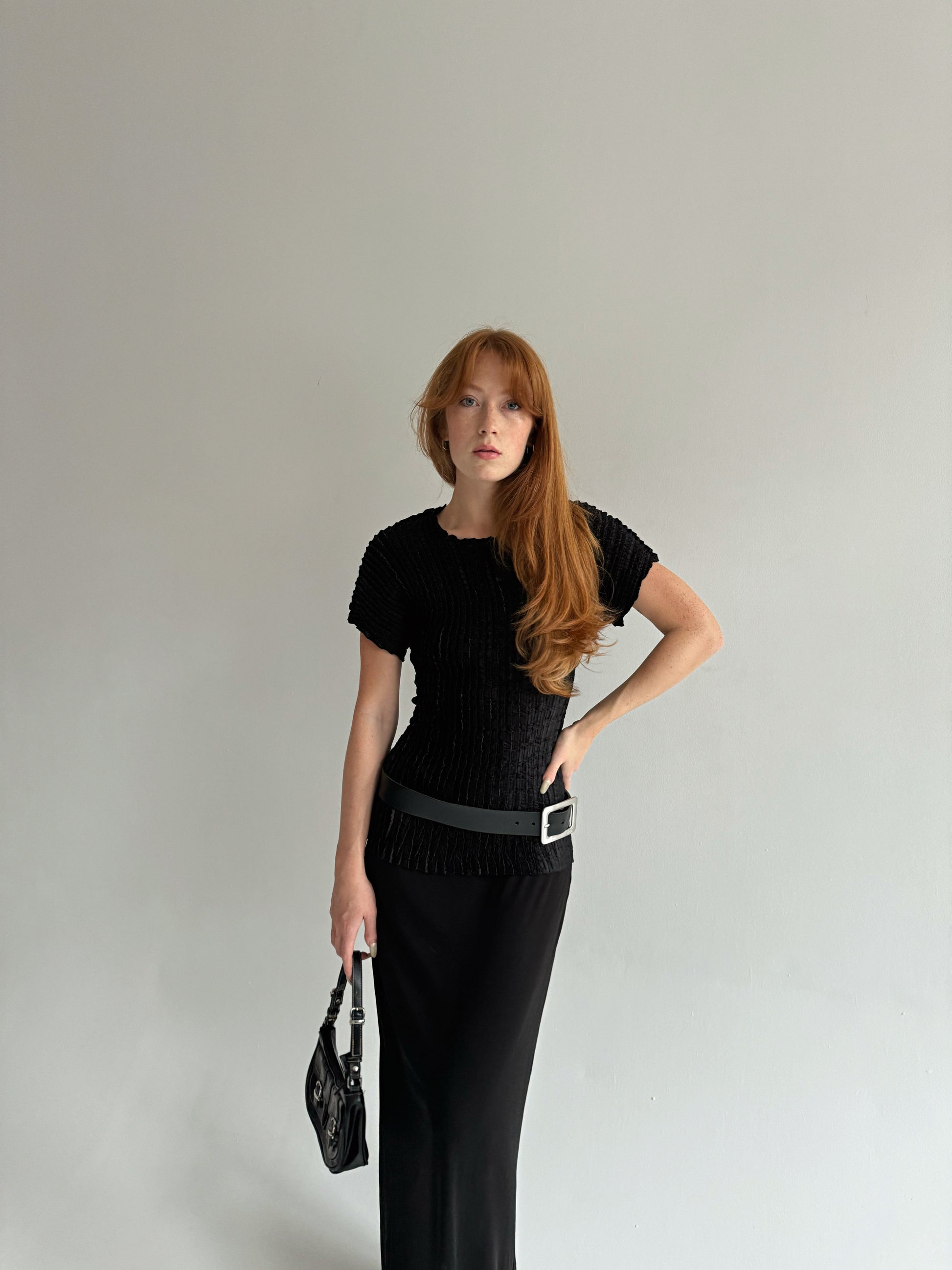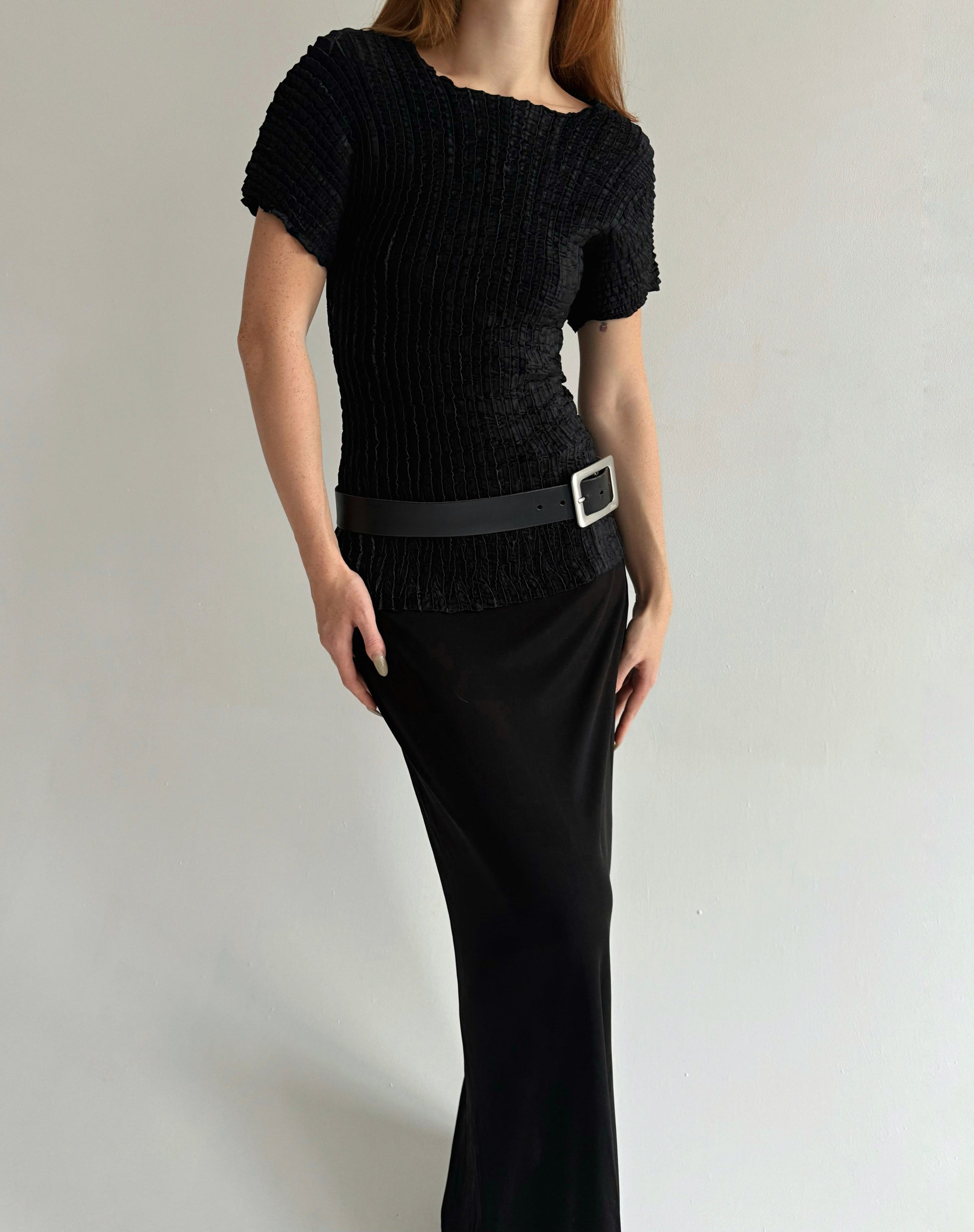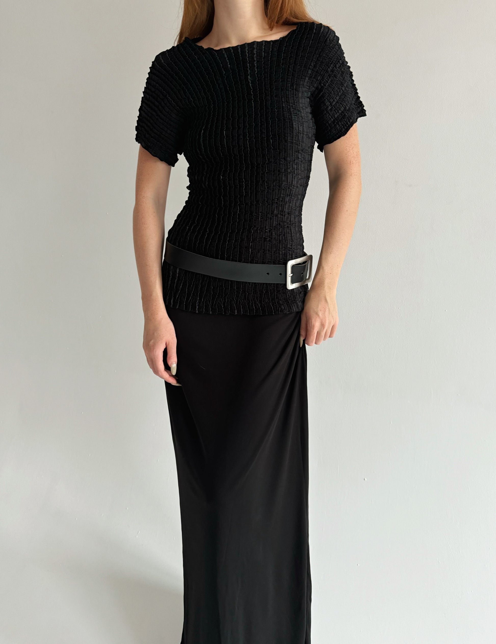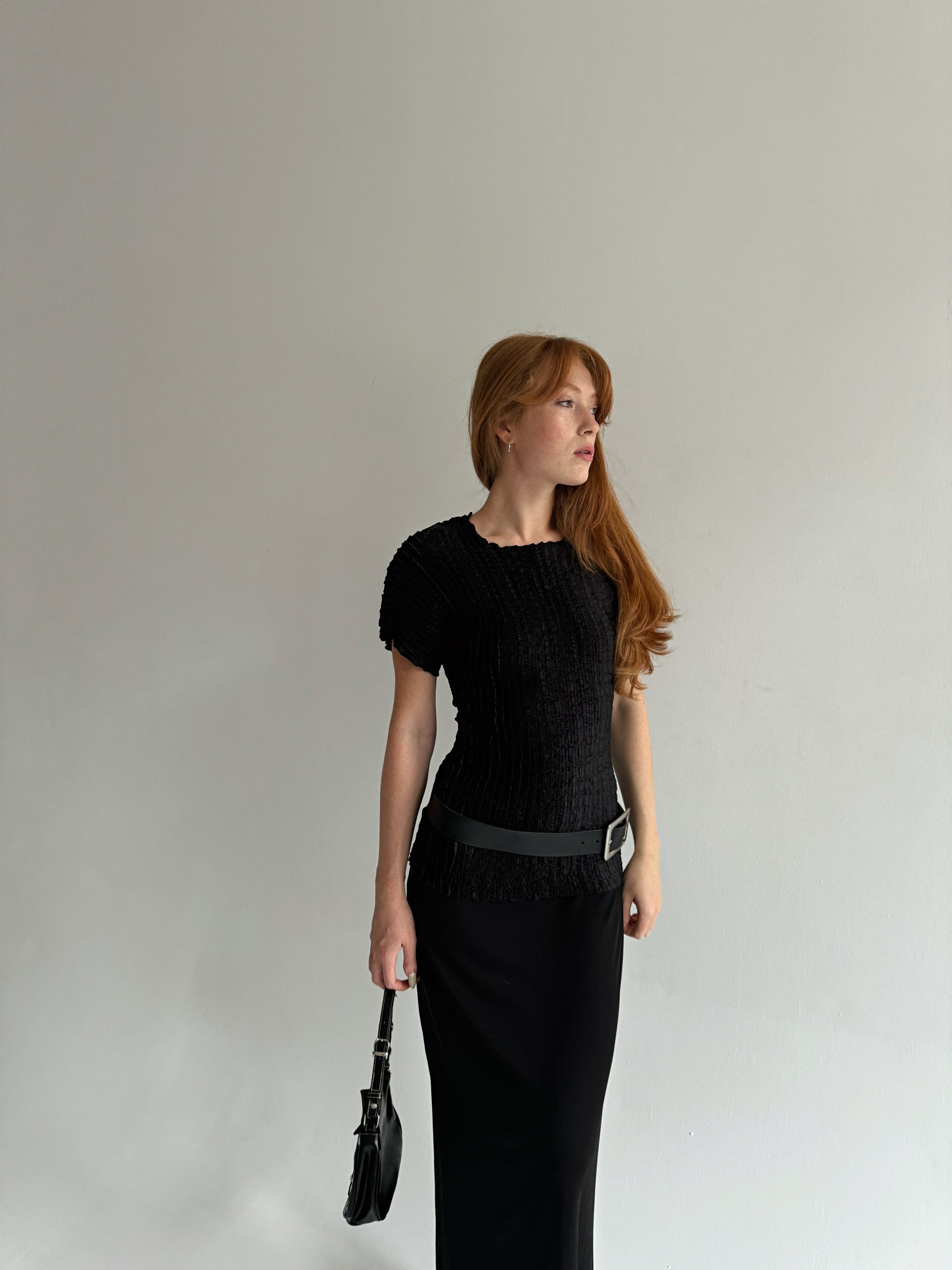 Vintage avant garde made in France pleated crinkle black satin blouse with short sleeves