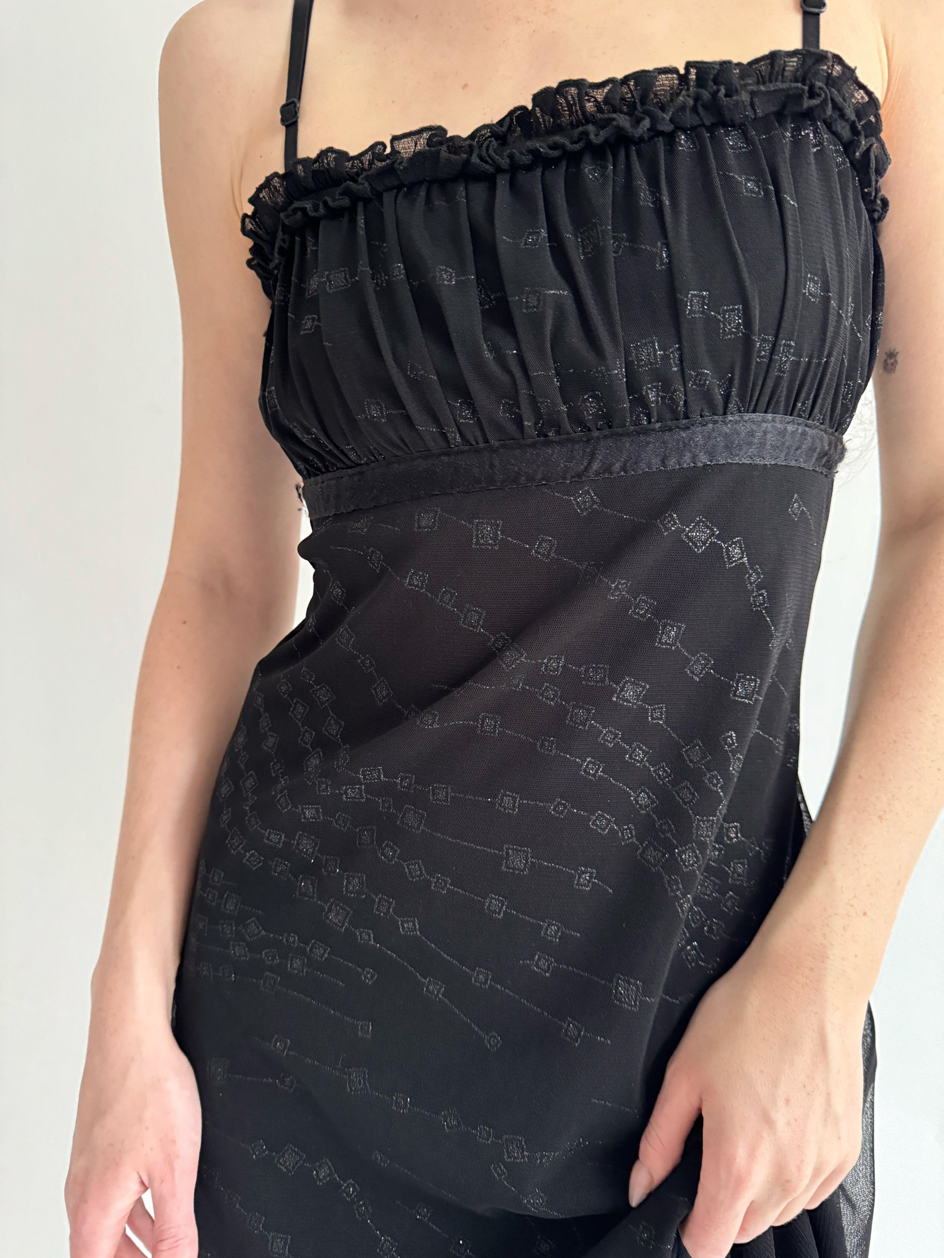 Vintage black asymmetrical midi dress with pattern and gathered bust