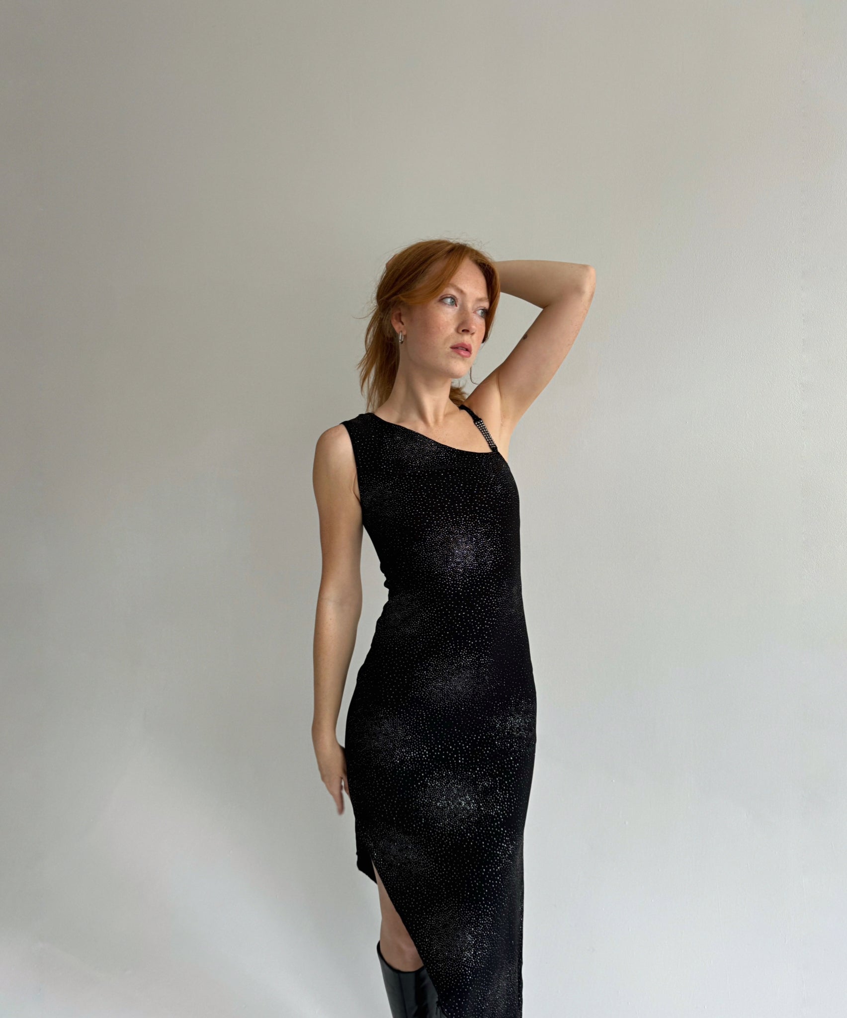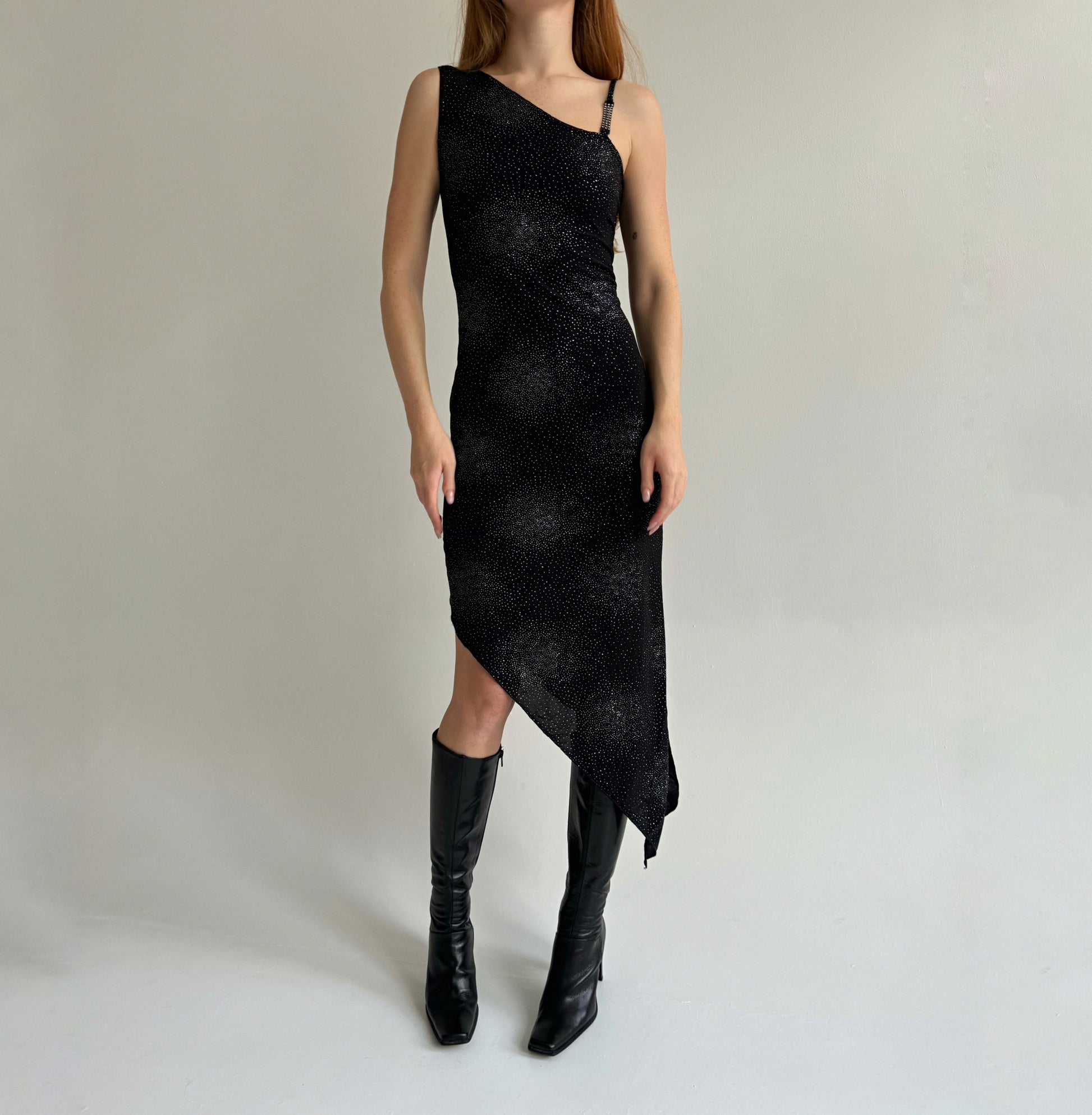 Vintage black asymmetrical stretchy dress with glitter pattern and rhinestone detail on a strap