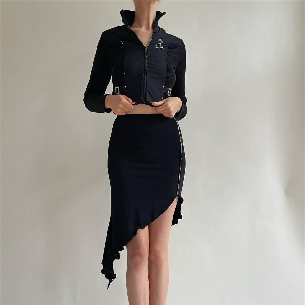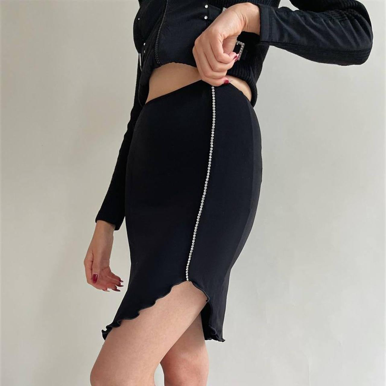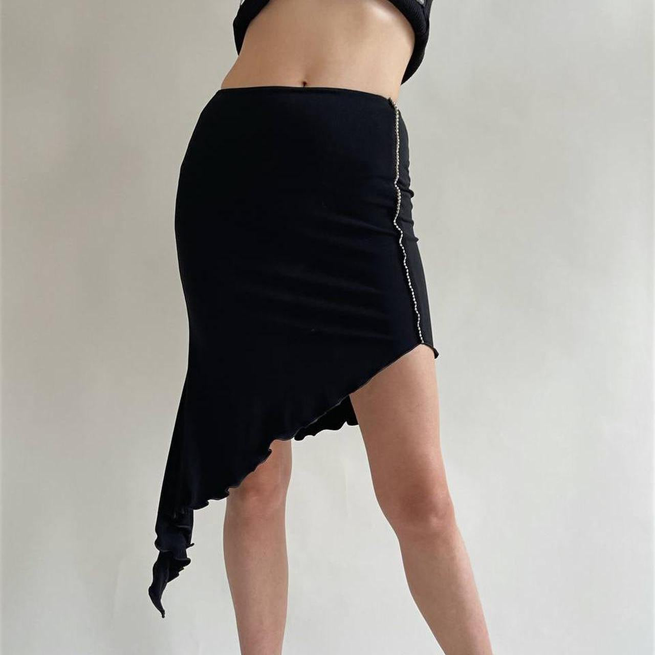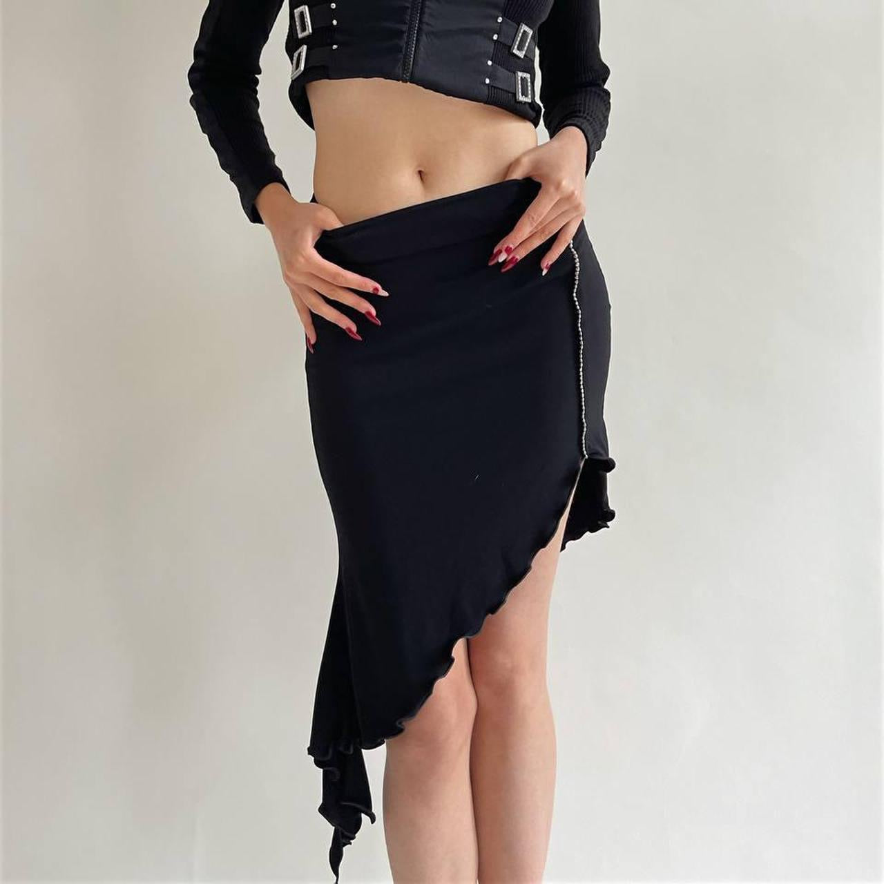 So stunning y2k 90’s asymmetrical stretchy black skirt with lettuce hem and rhinestone line on left side💎