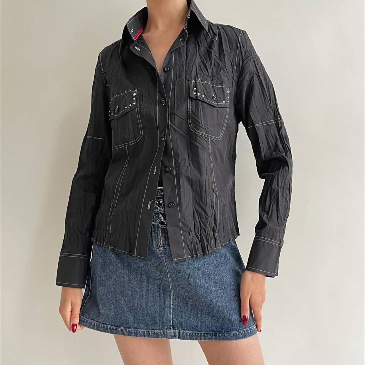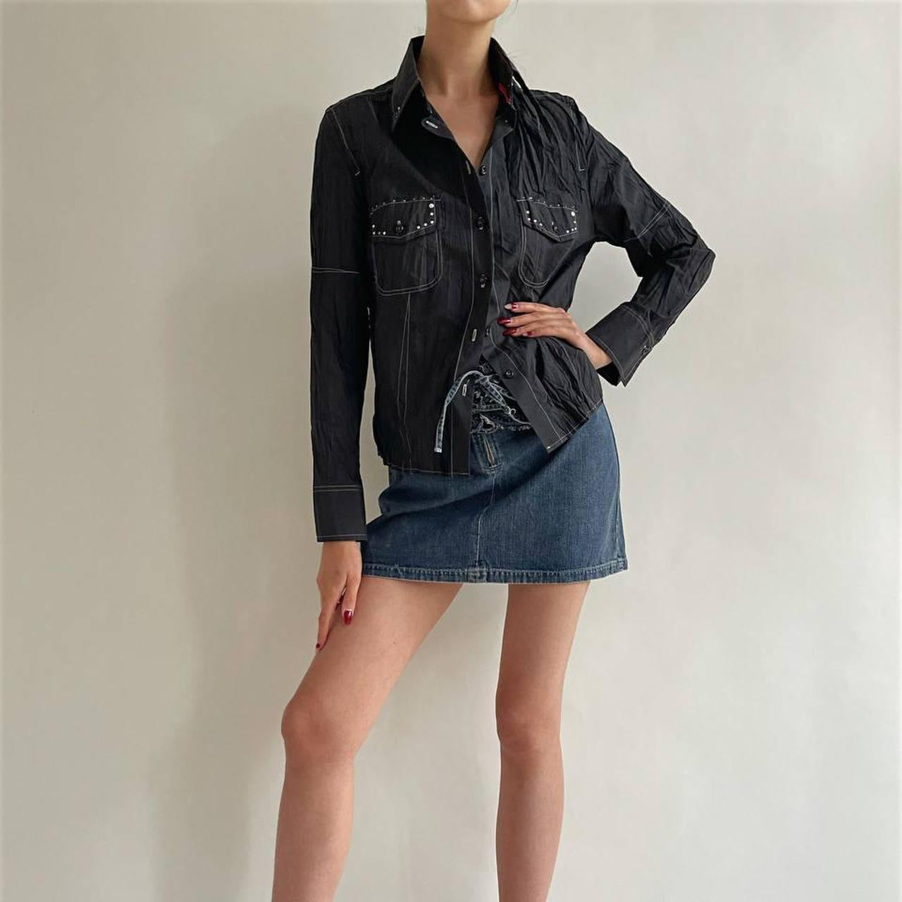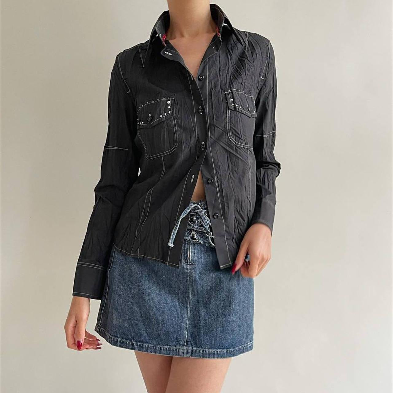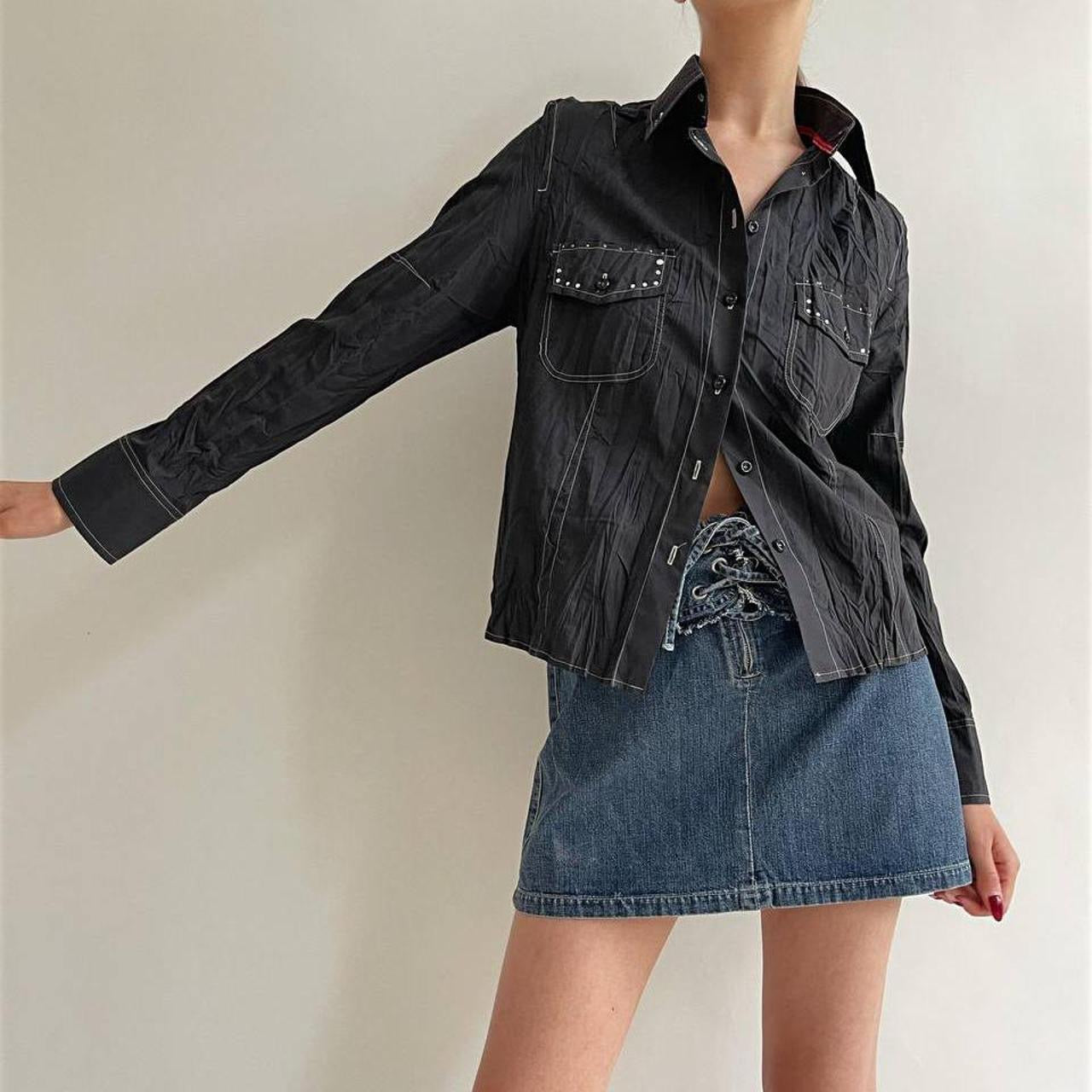 Gorgeous cotton blend y2k 2000’s black corrugated shirt with rhinestone details and white seams 🦪