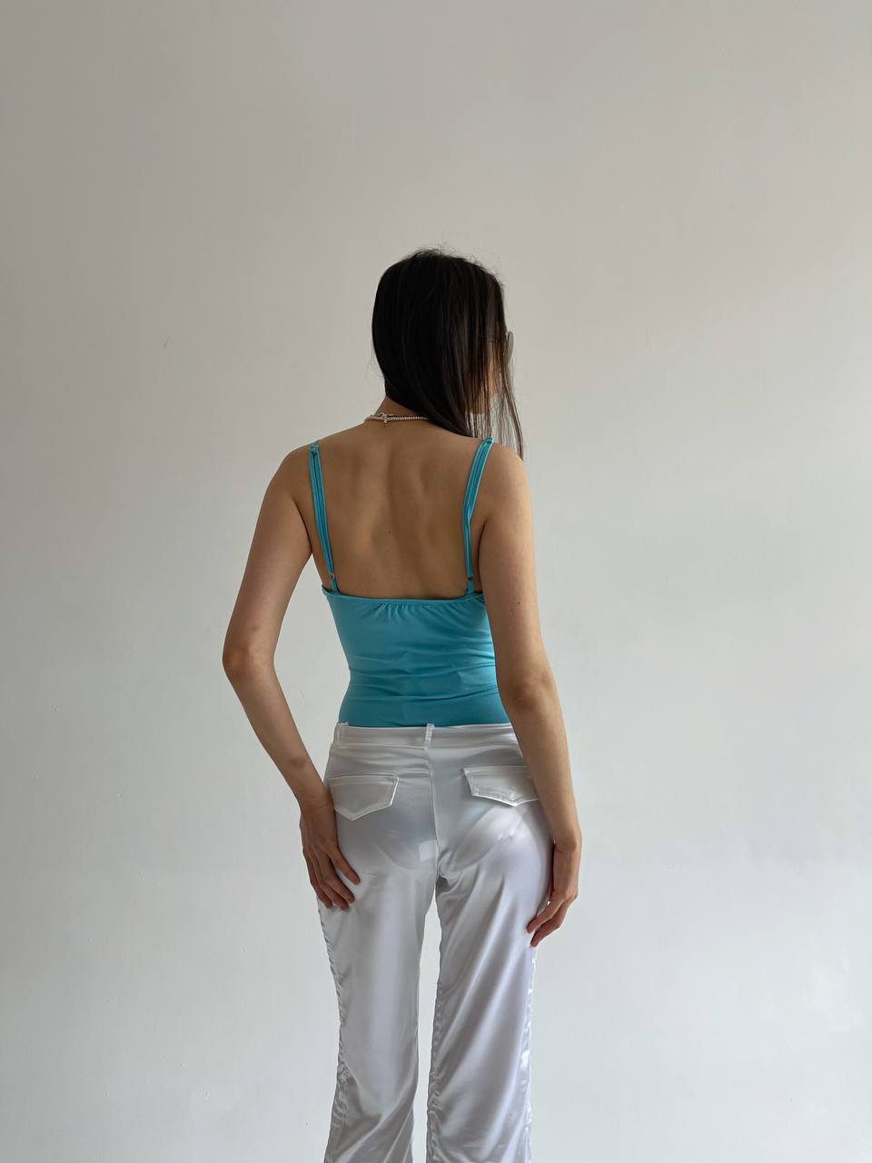 Vintage Blumarine turquoise 90% viscose bodice with mesh details and rhinestone chest B logo