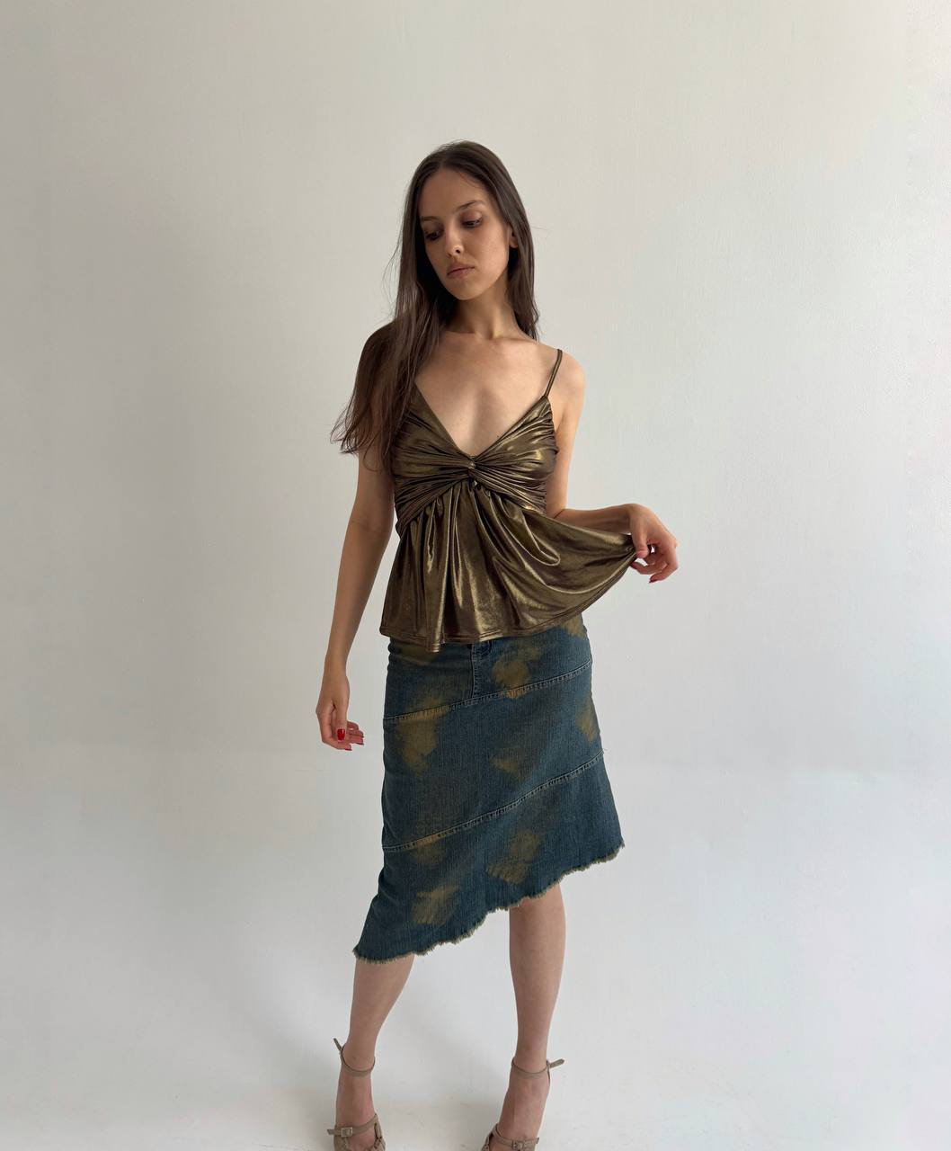 Vintage bronze liquid ruched Y2K top