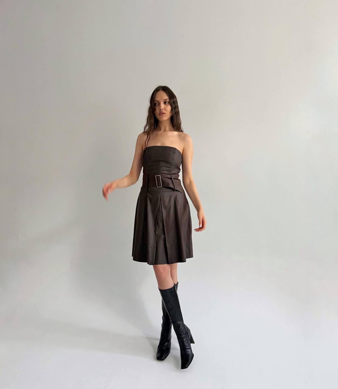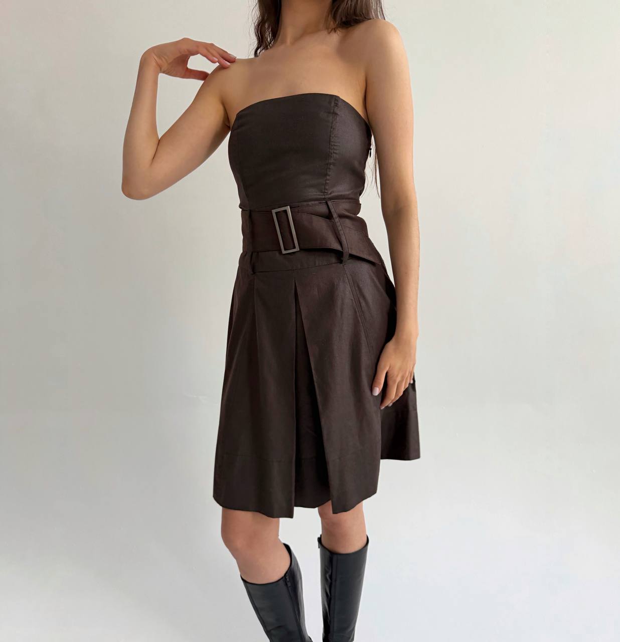 Vintage brown strapless dress with wide belt, made of cotton blend, lining made of acetate