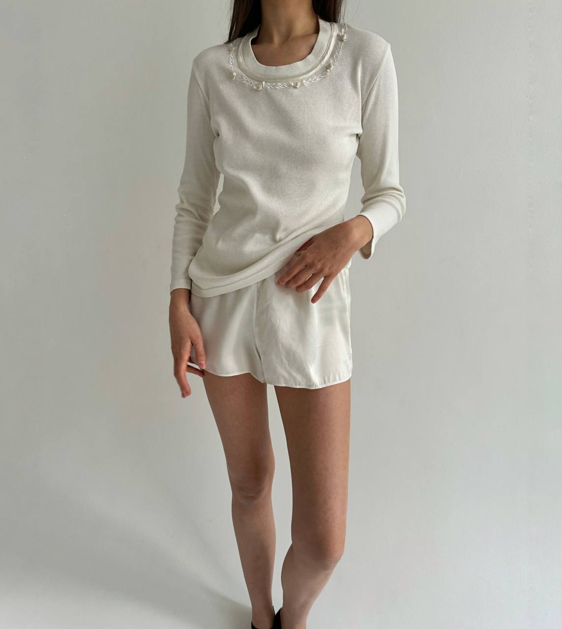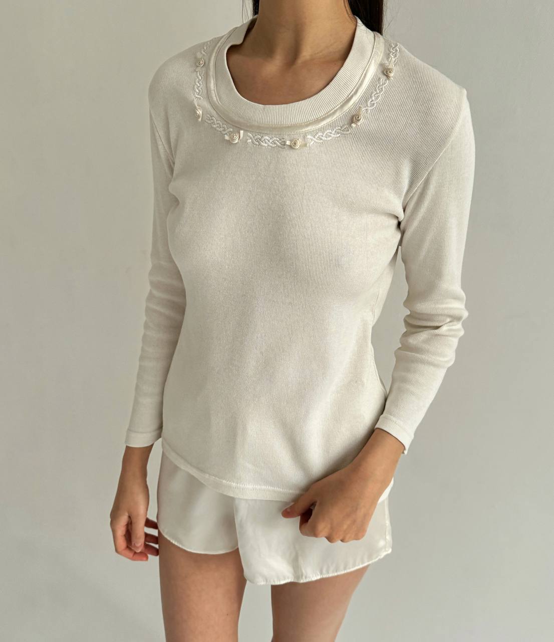 Vintage made in France cotton blend cream ribbed blouse with flower neck appliqué
