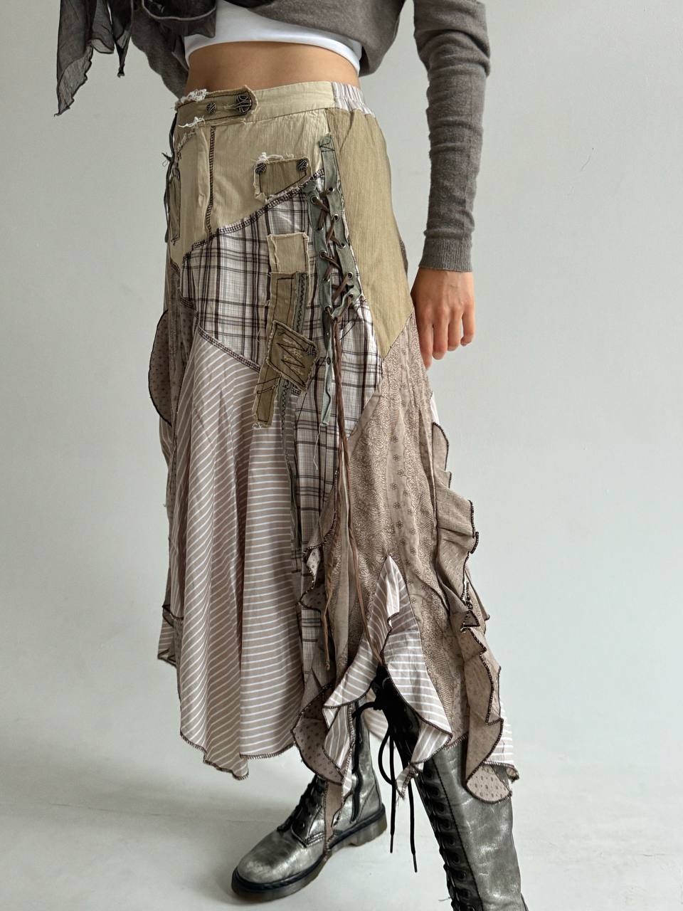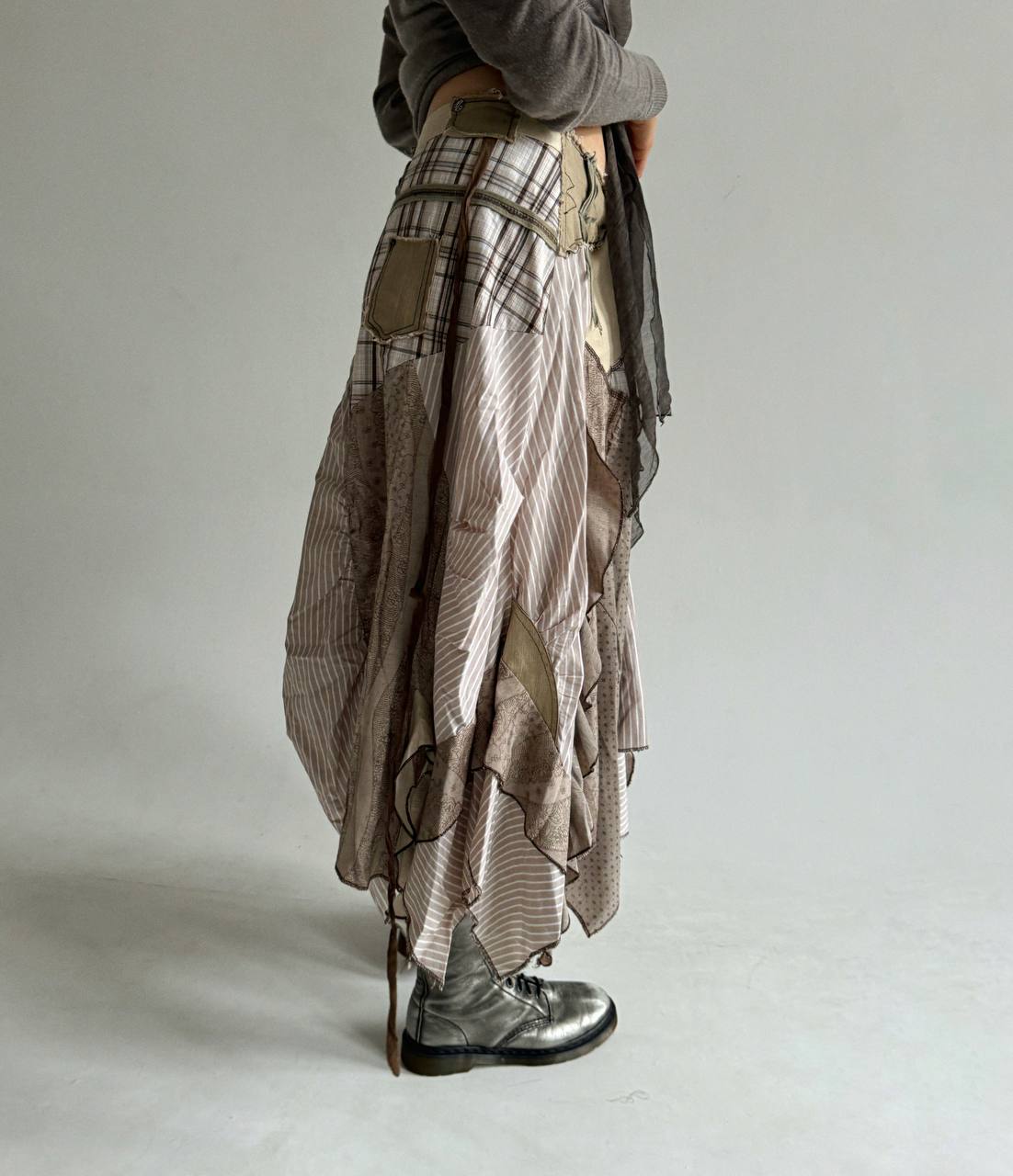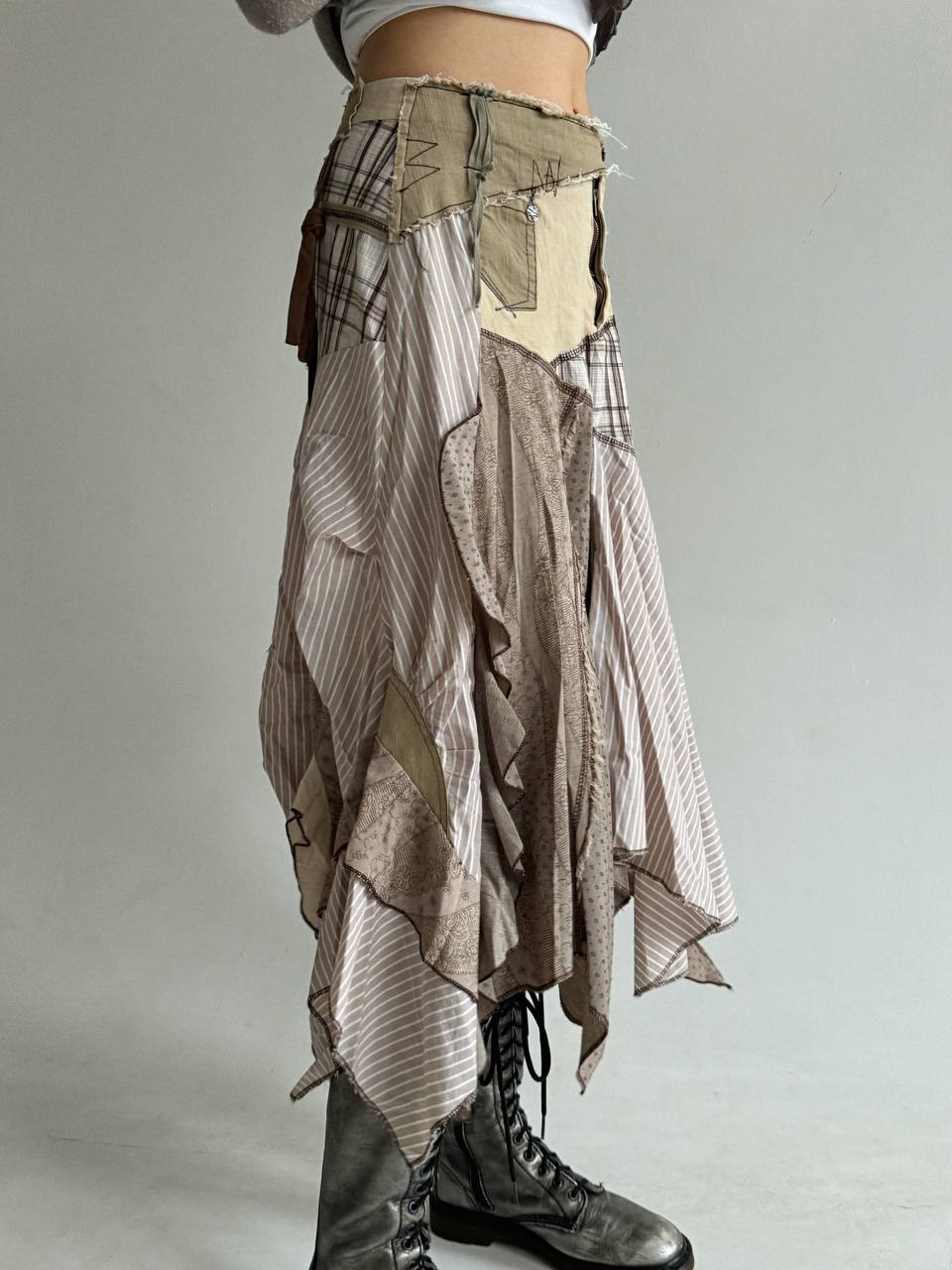 Vintage deconstructed cotton patchwork asymmetrical maxi skirt