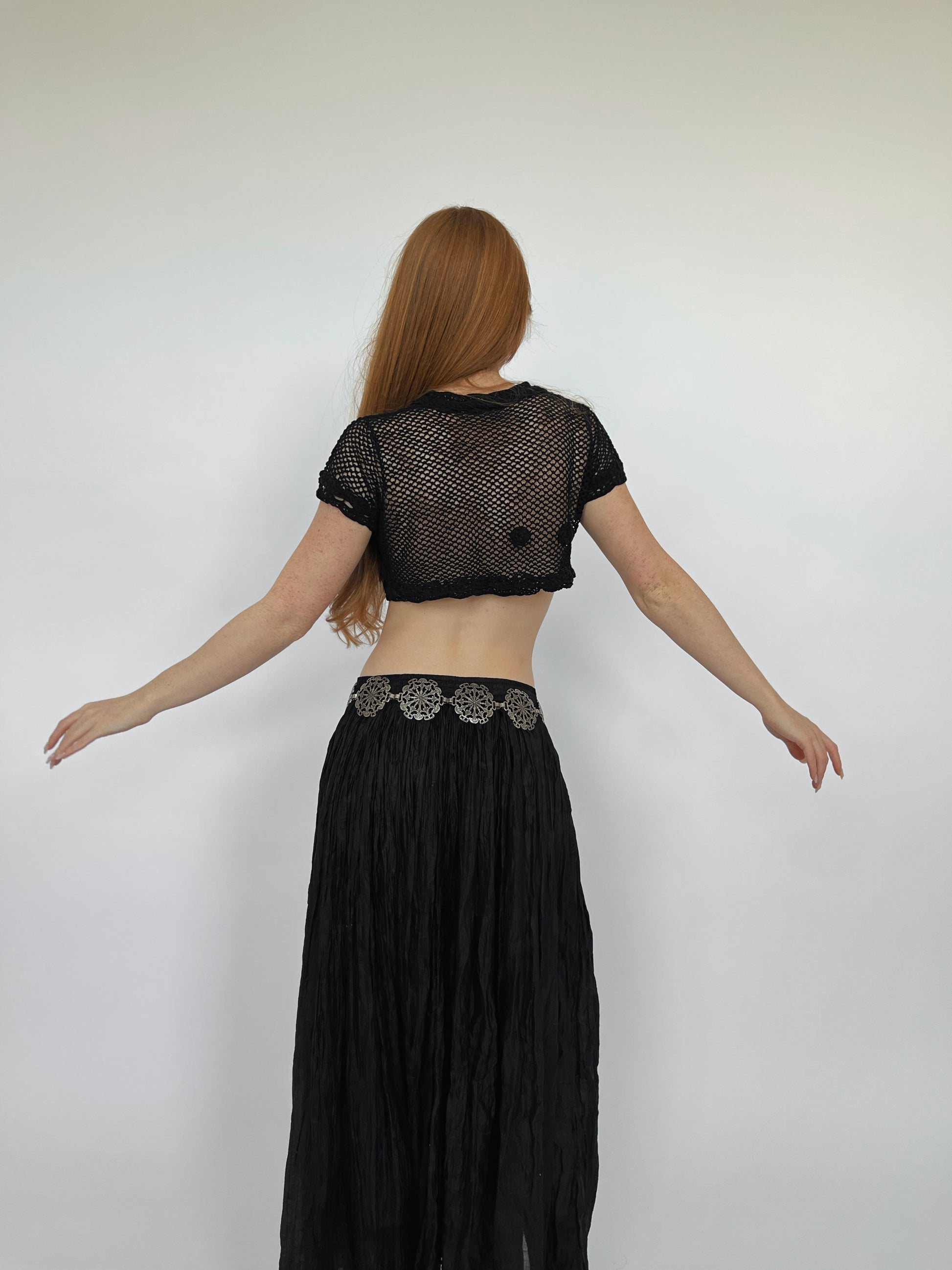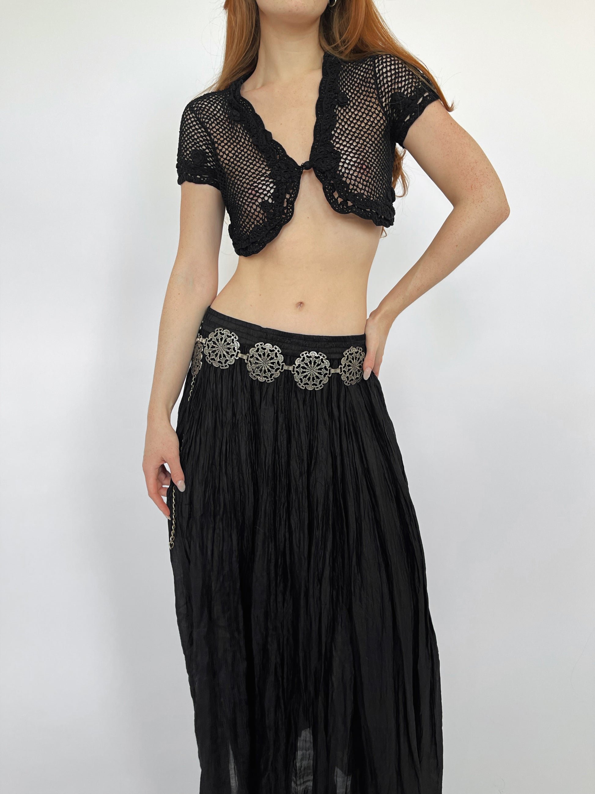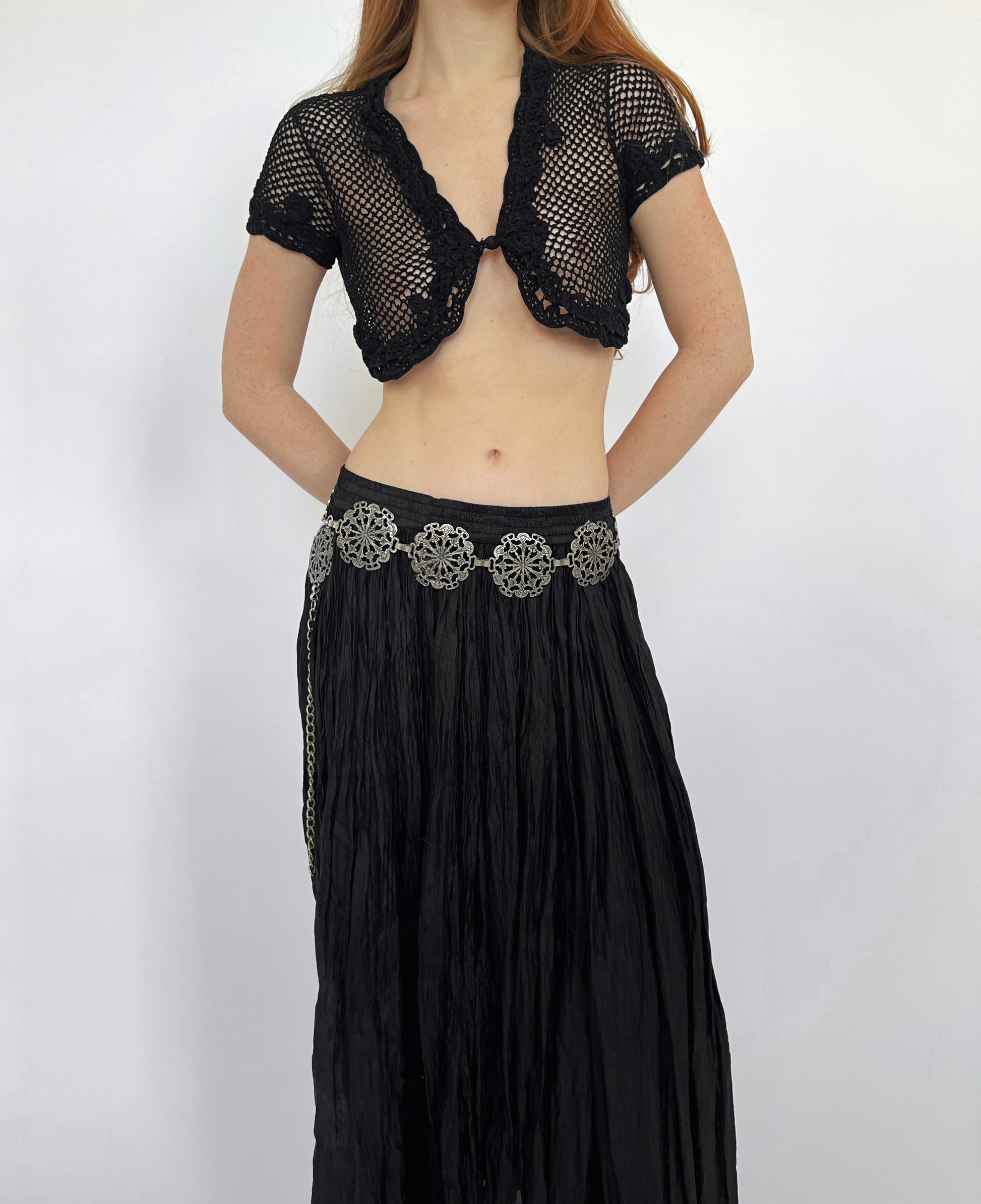 Vintage black fishnet crochet bolero cardigan with crochet roses appliqué