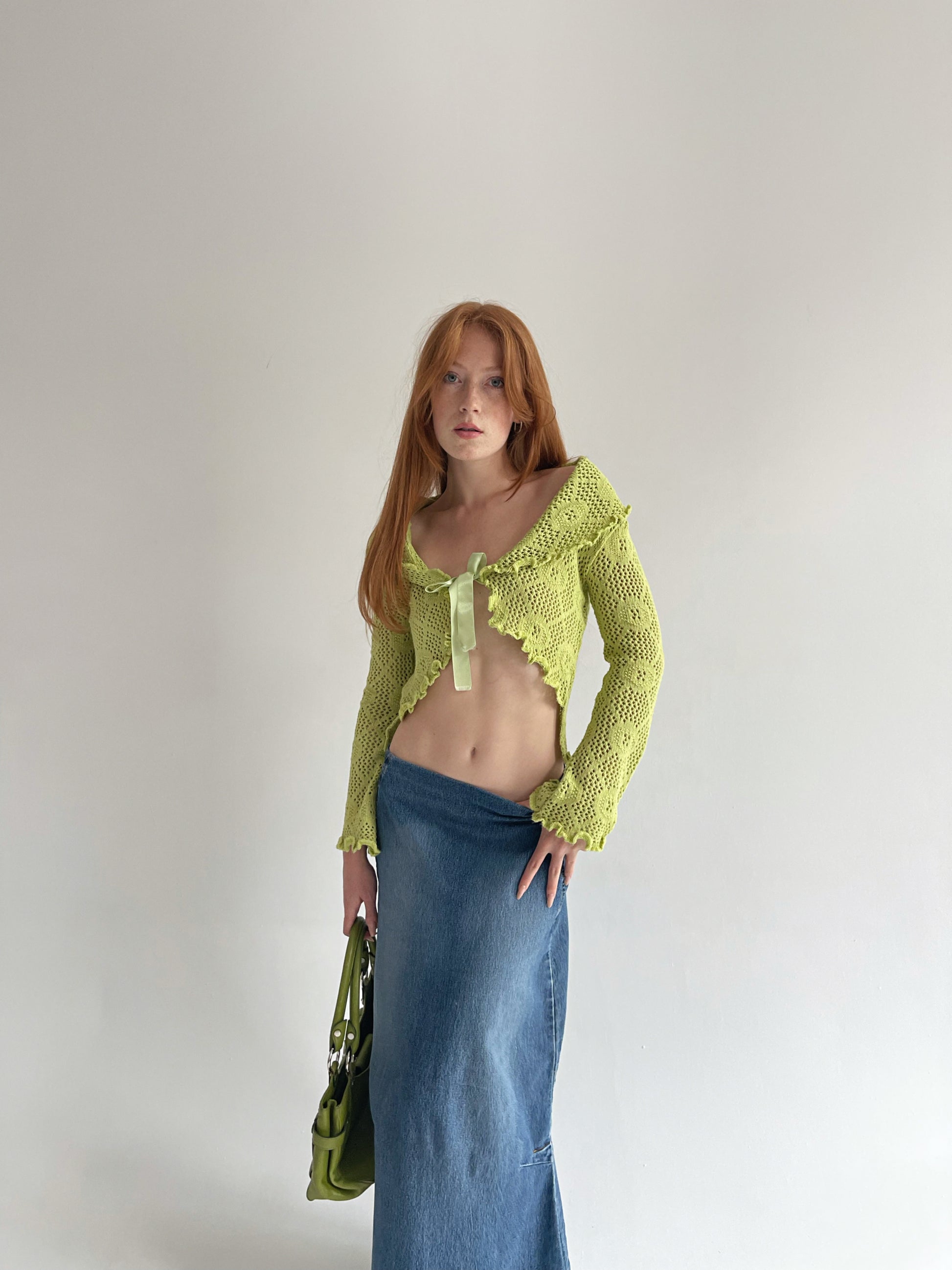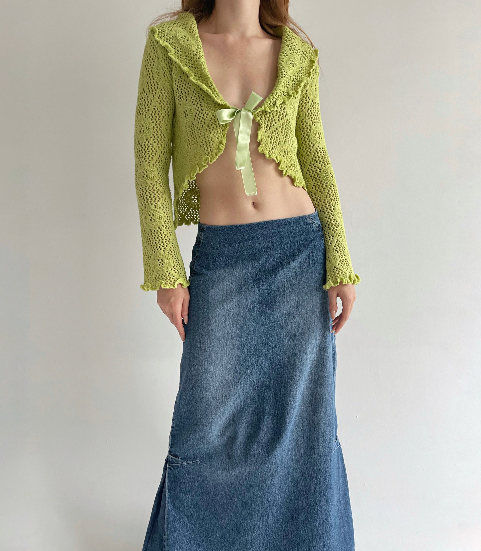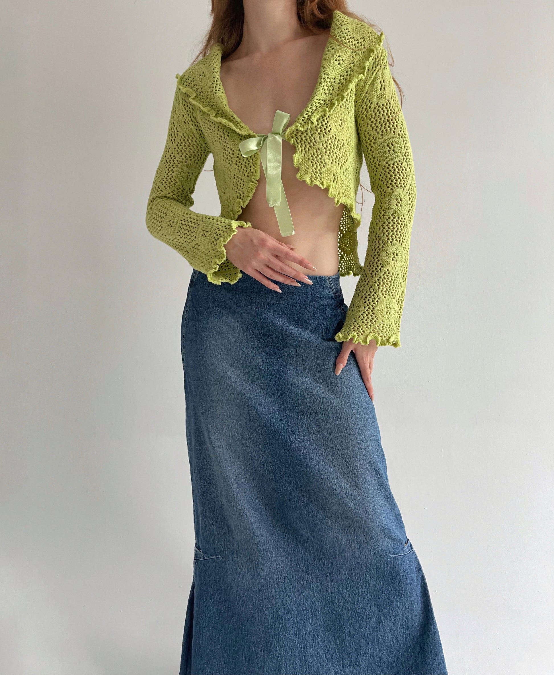 Vintage lime green crochet cardigan with front satin bow and lettuce hem wide collar