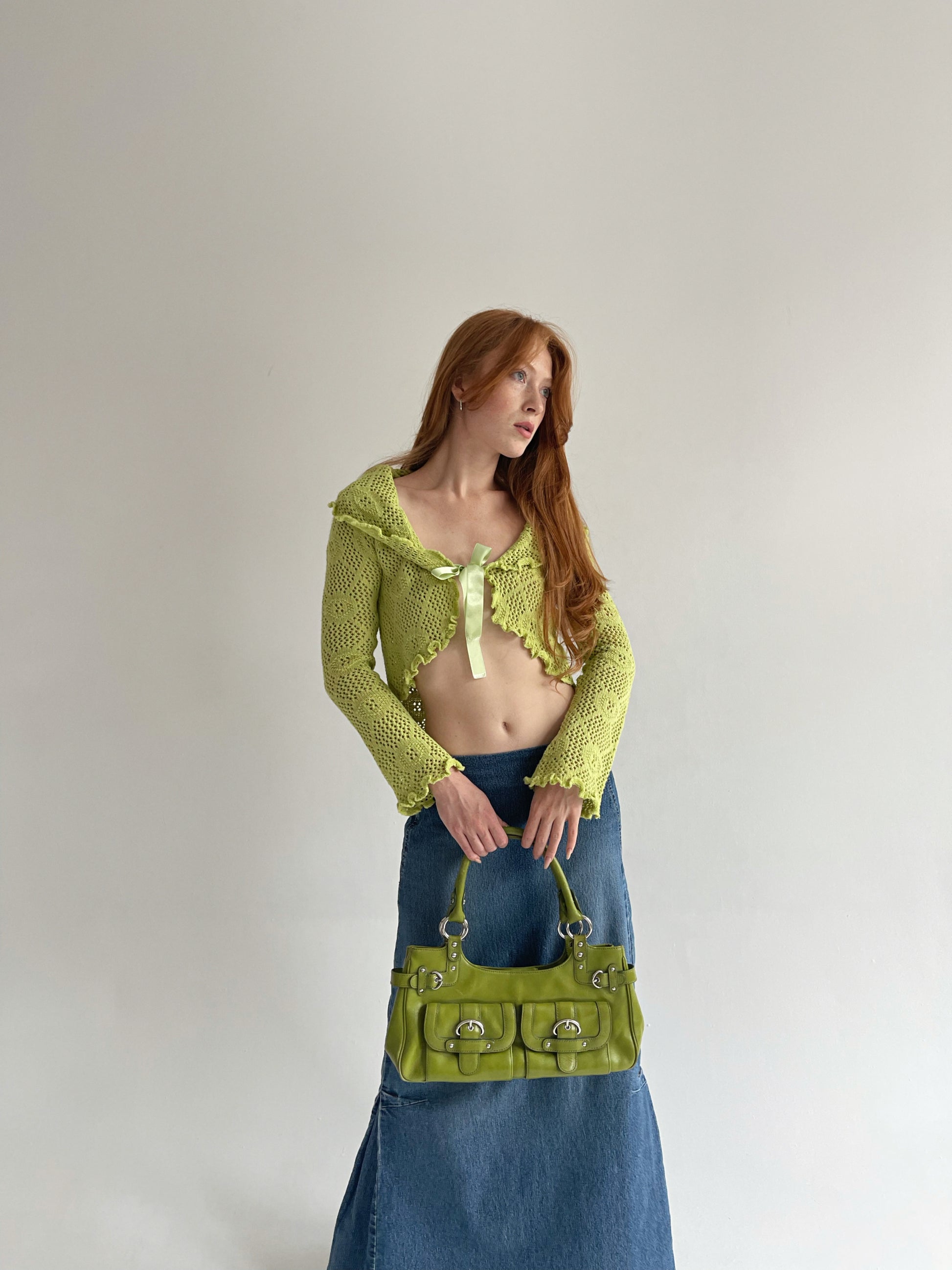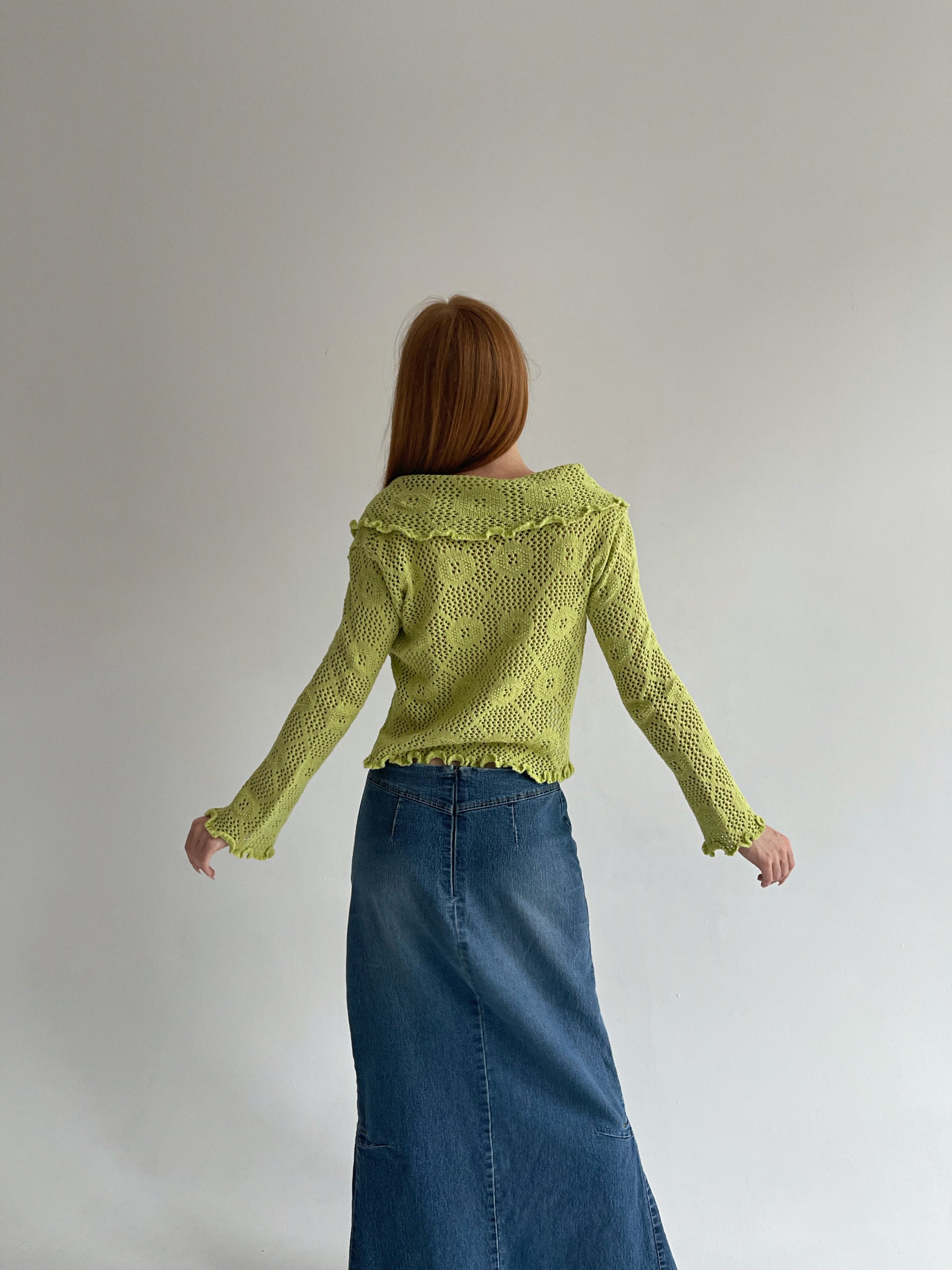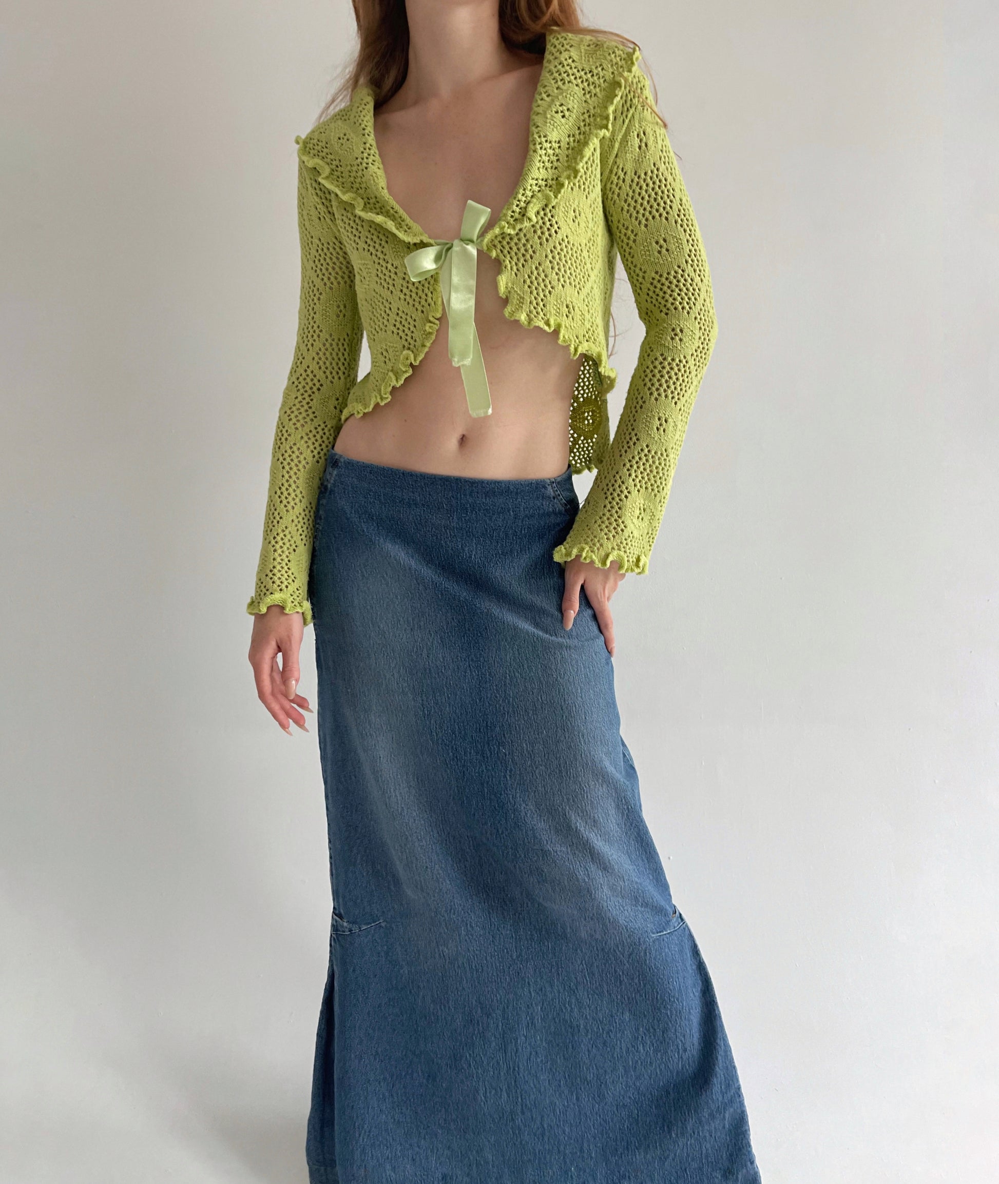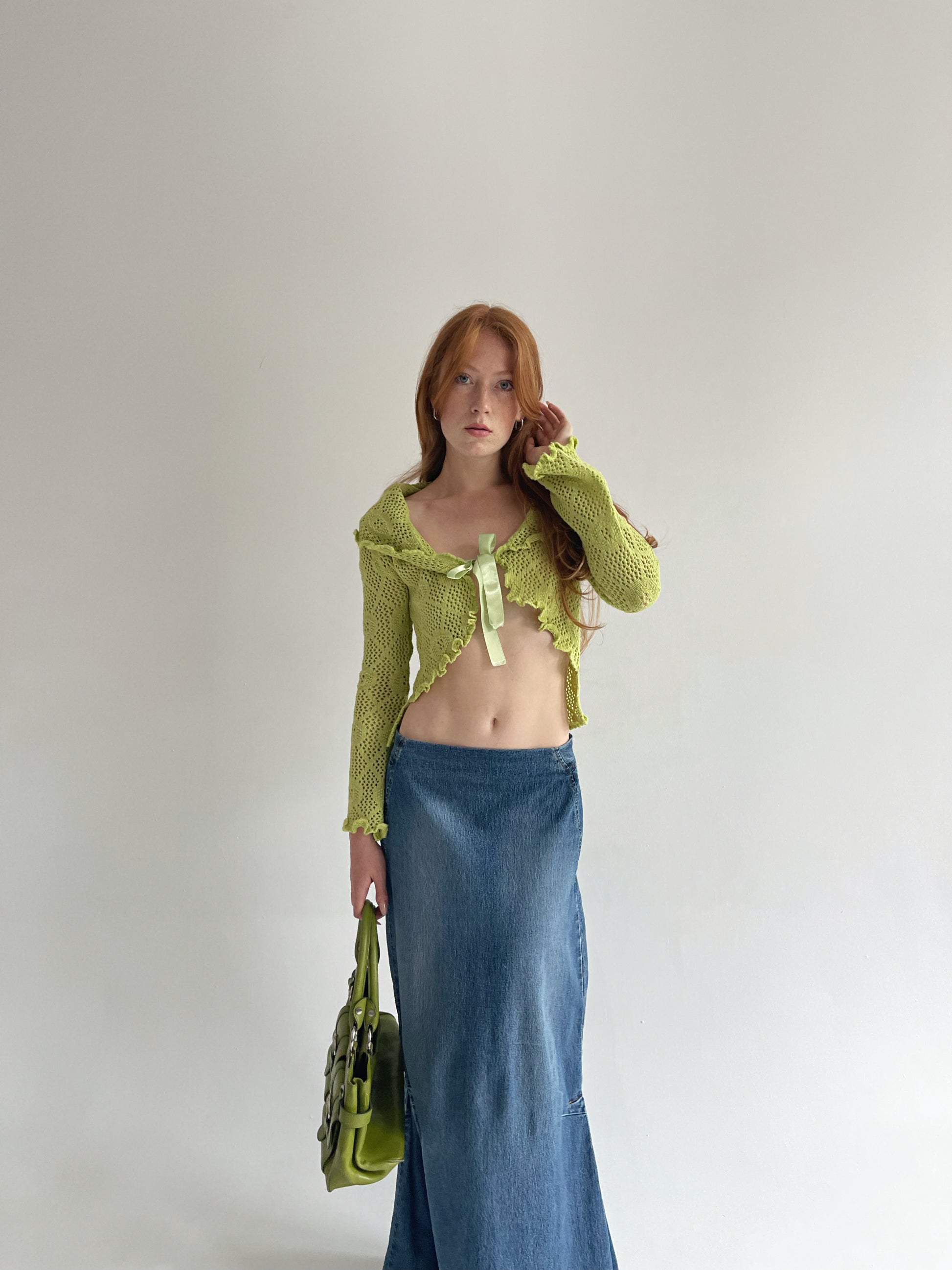 Vintage lime green crochet cardigan with front satin bow and lettuce hem wide collar