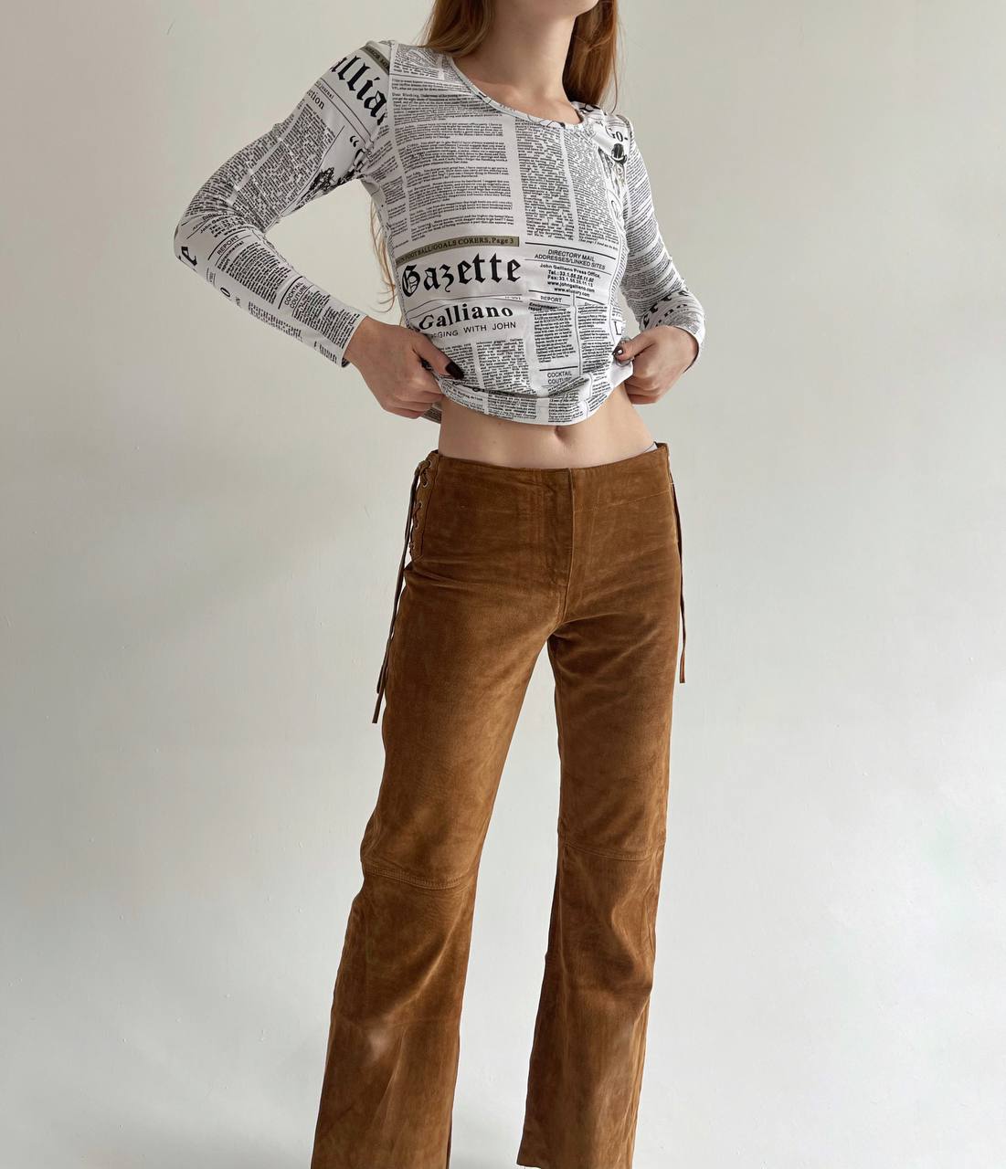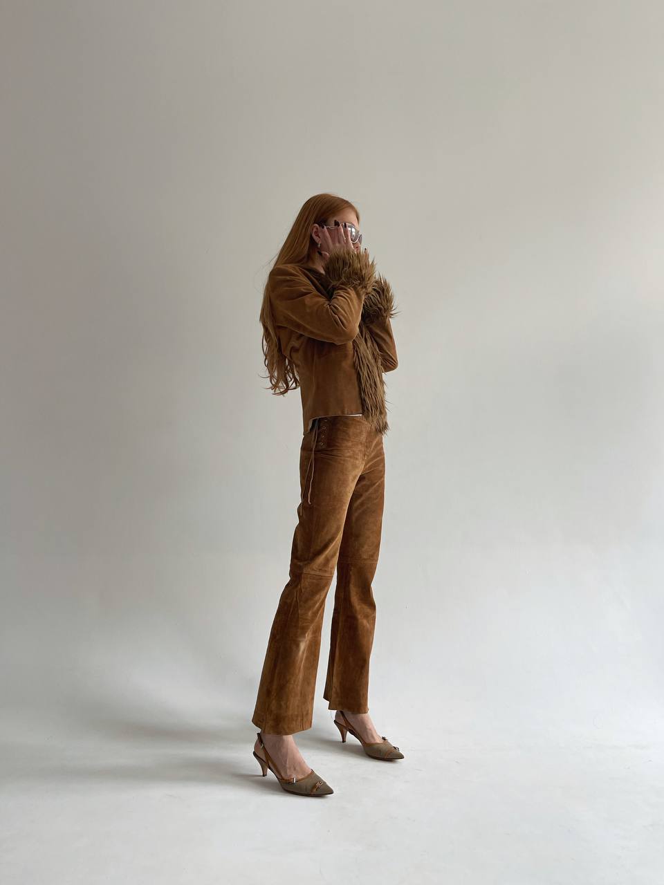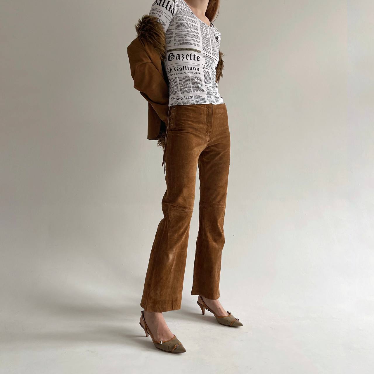 Vintage genuine leather camel flared low rise trousers with side lace up corset like details