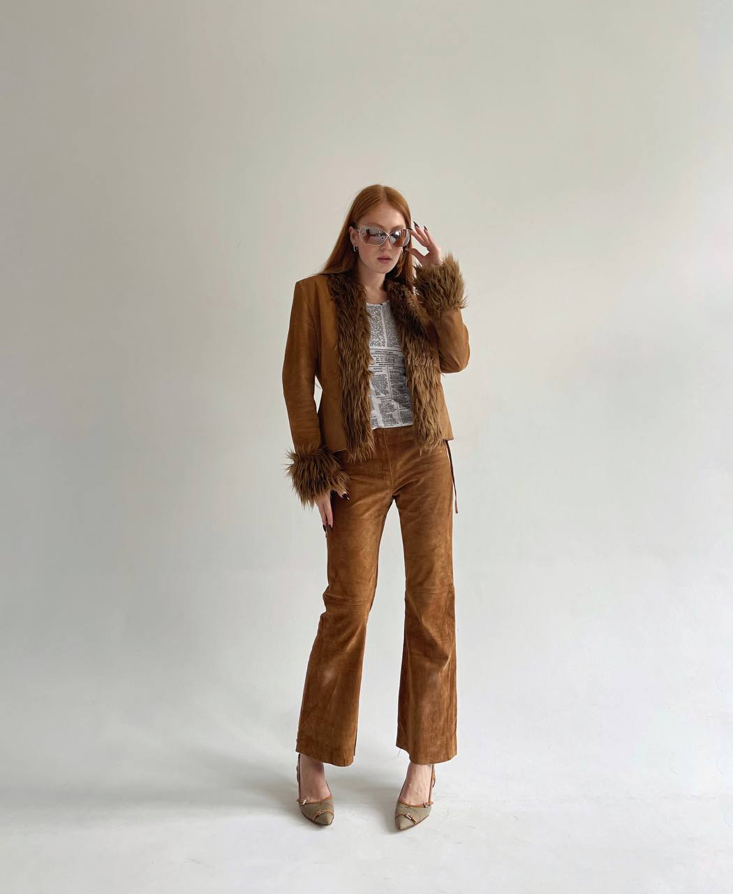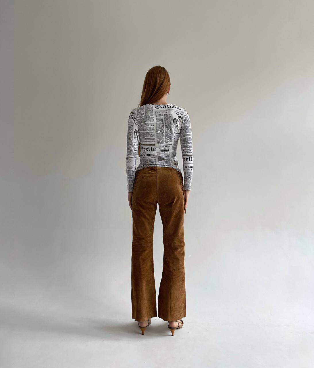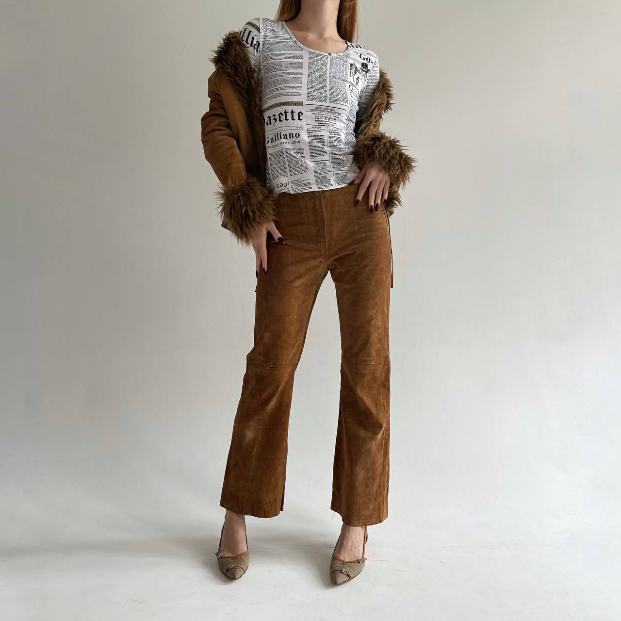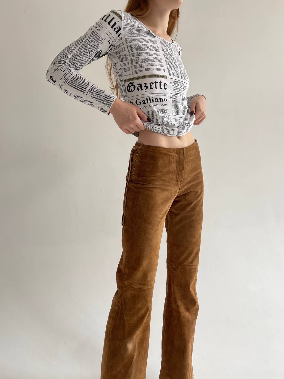 Vintage genuine leather camel flared low rise trousers with side lace up corset like details
