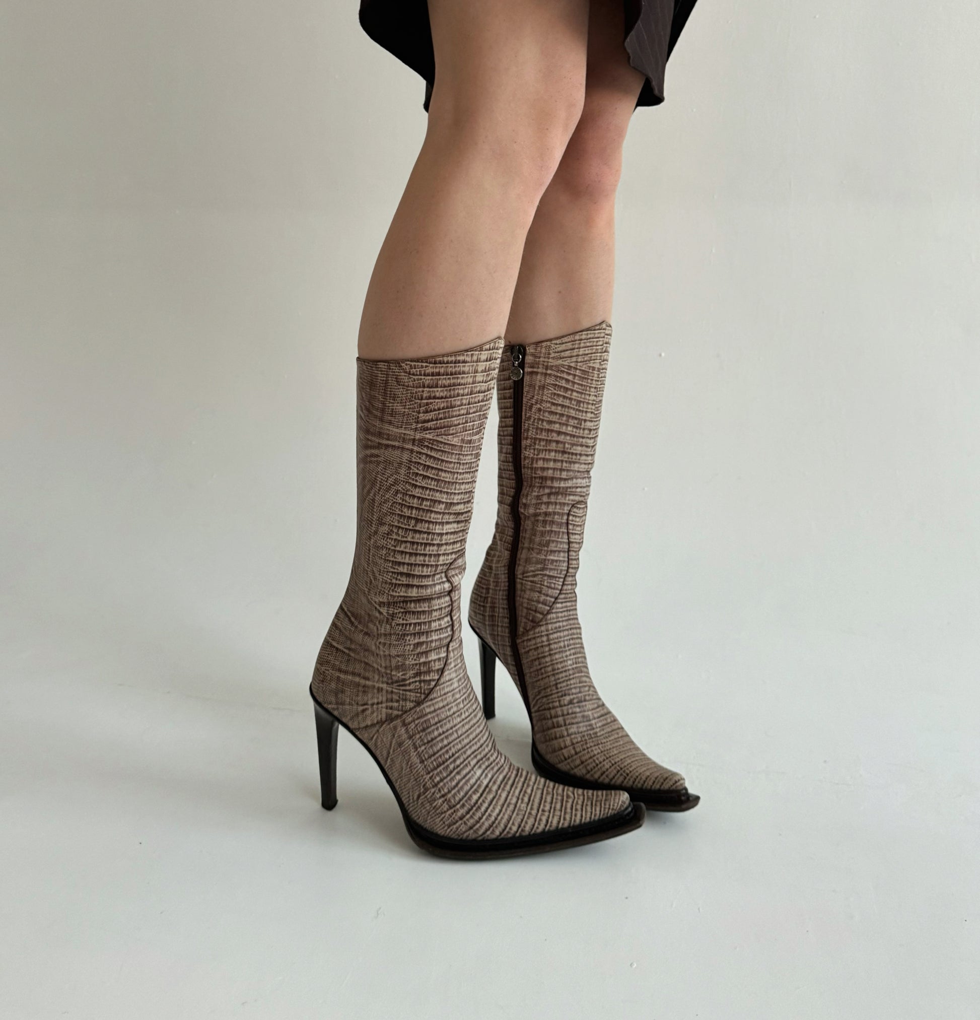 Vintage genuine leather crocodile imitation beige pointy toe boots