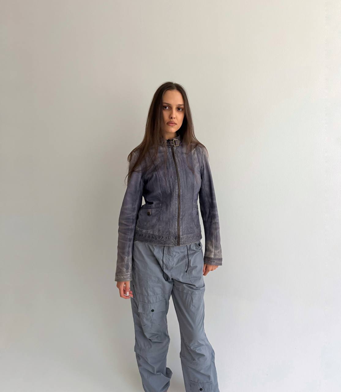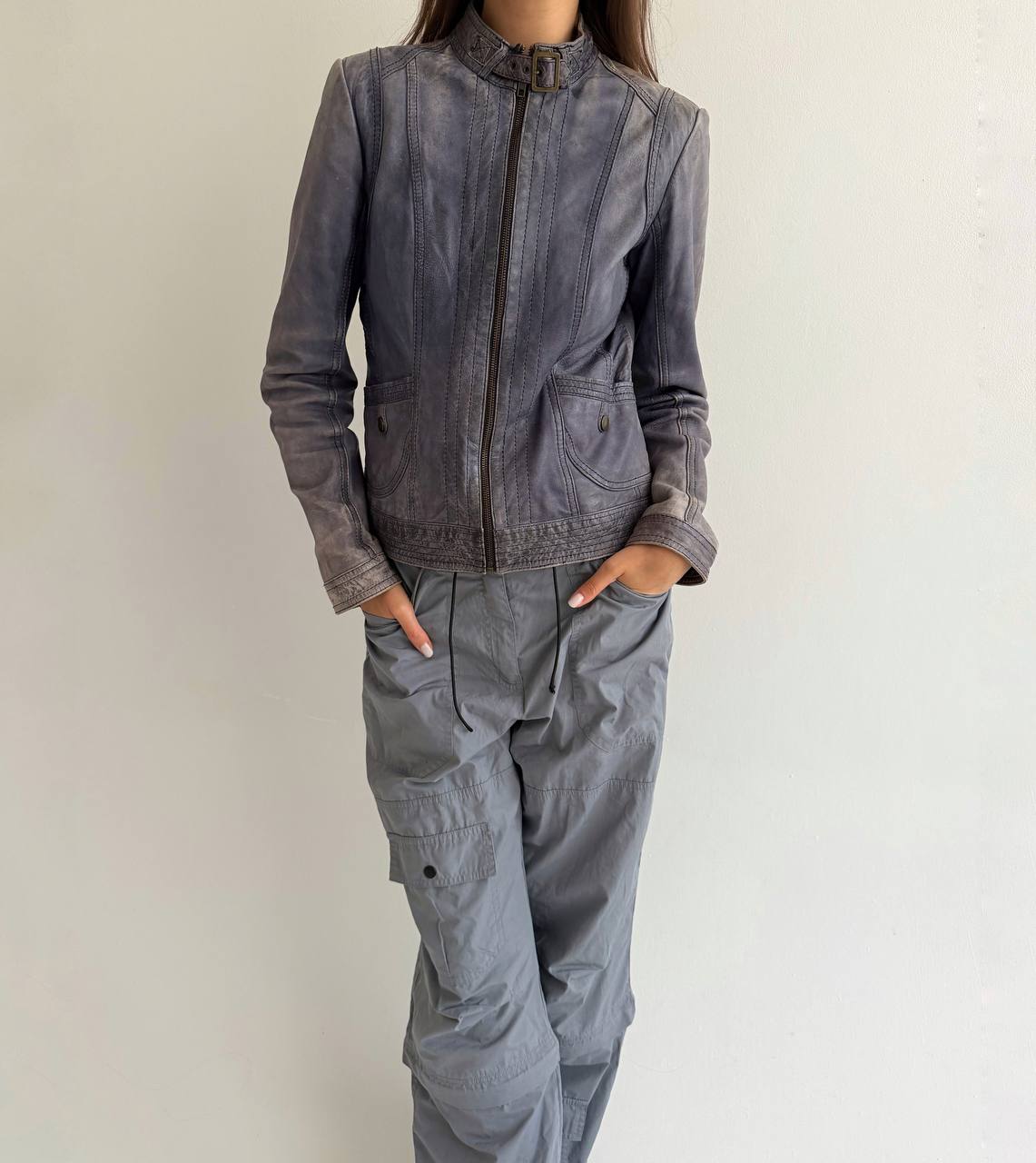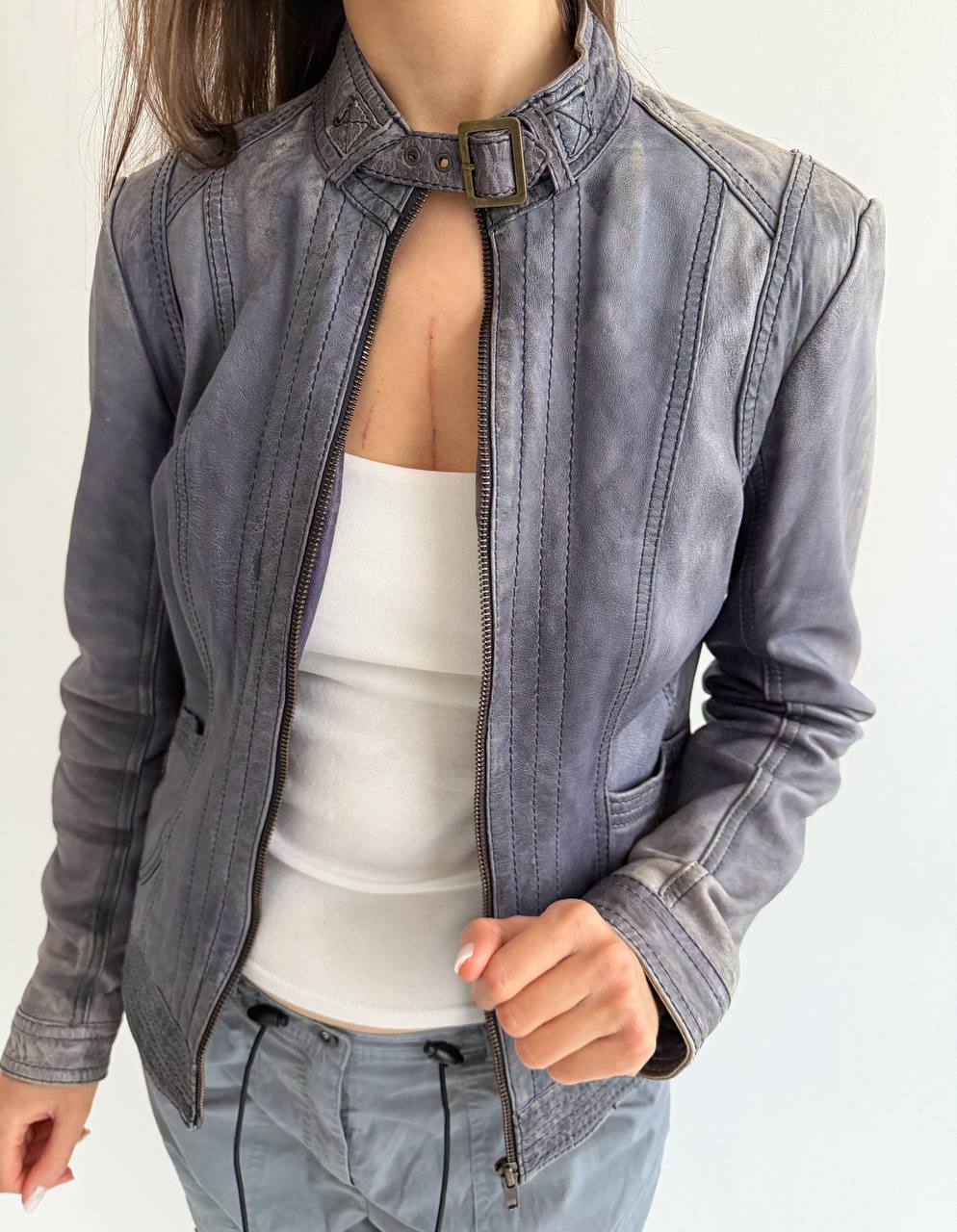 Vintage genuine sheep leather blue washed distressed moto racing type jacket