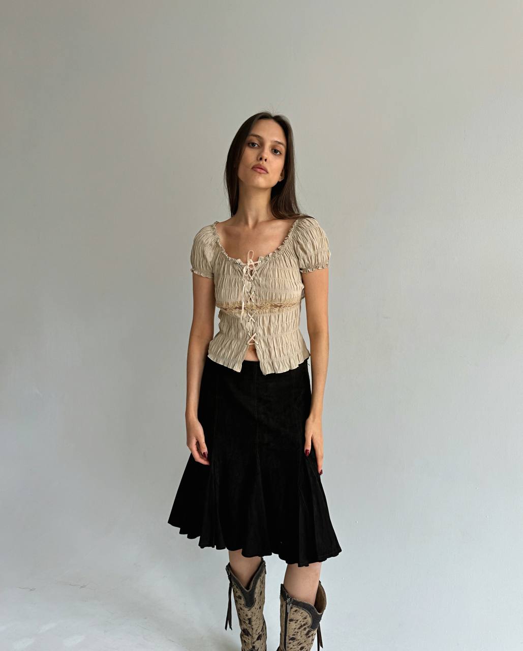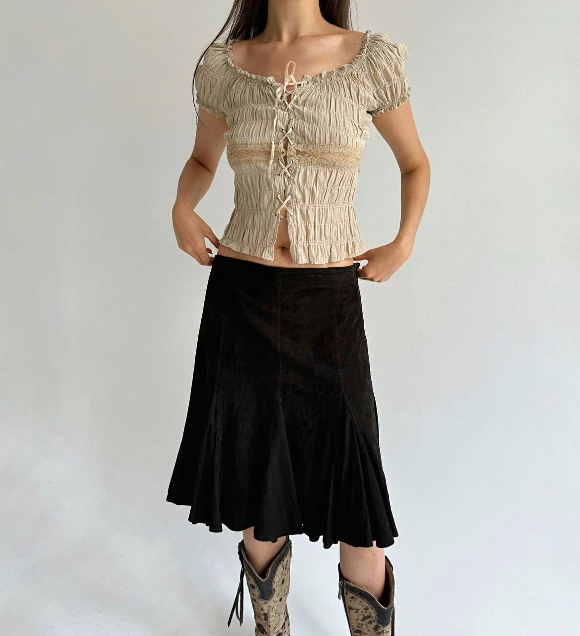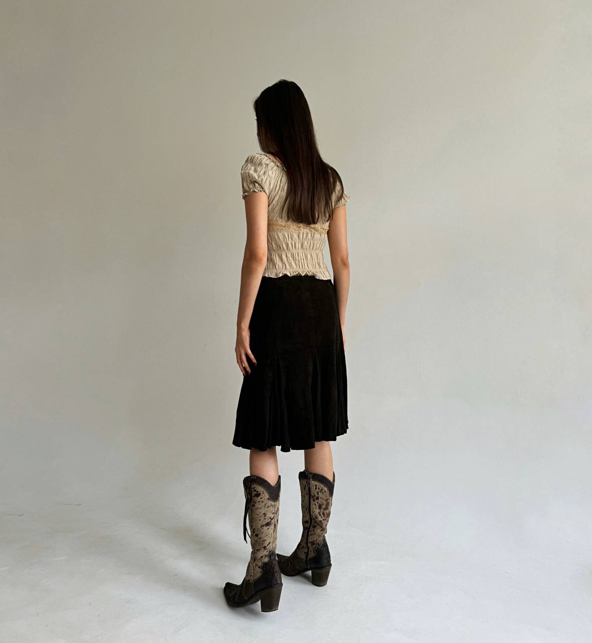 Vintage genuine suede dark brown mini ruched skirt