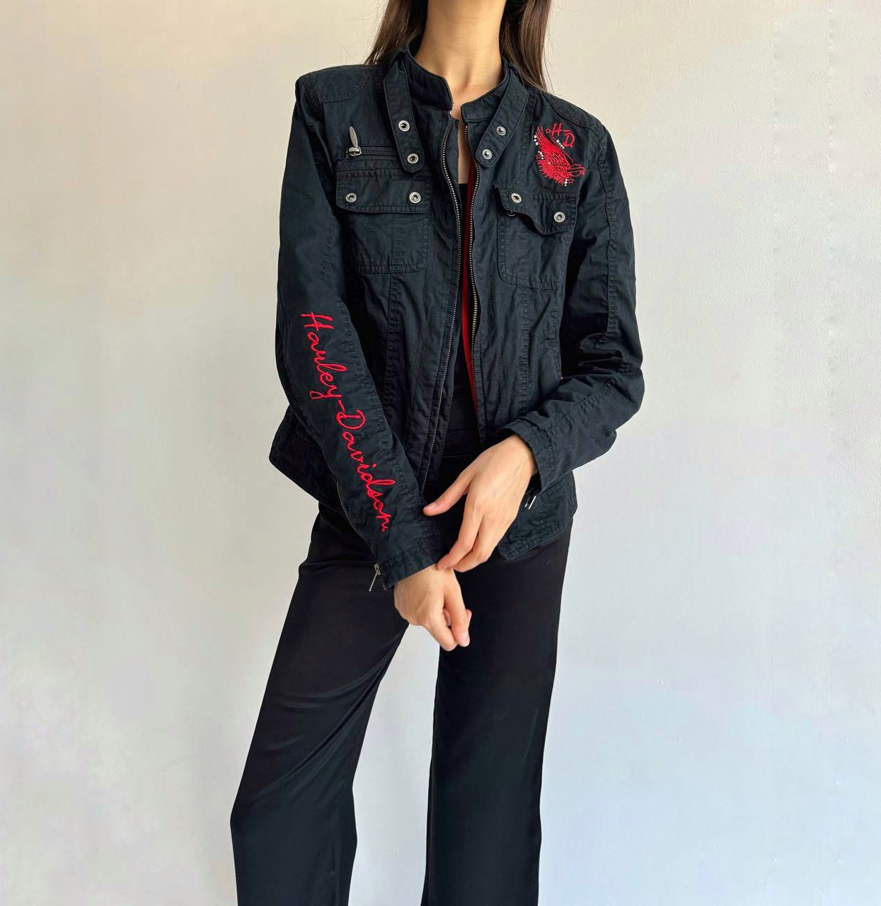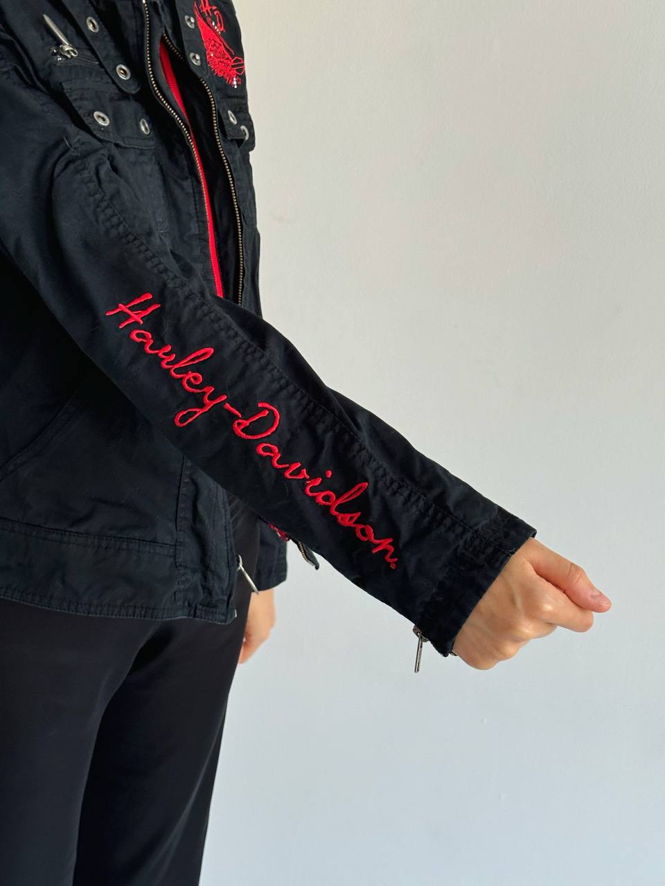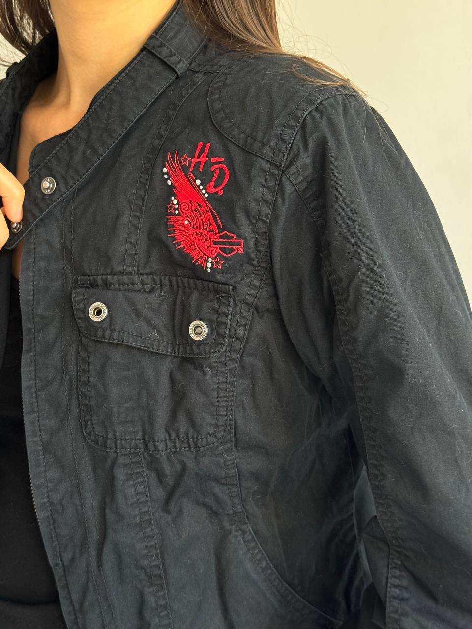 Vintage Harley Davidson black cotton blend moto jacket with red embroidery and some rhinestones