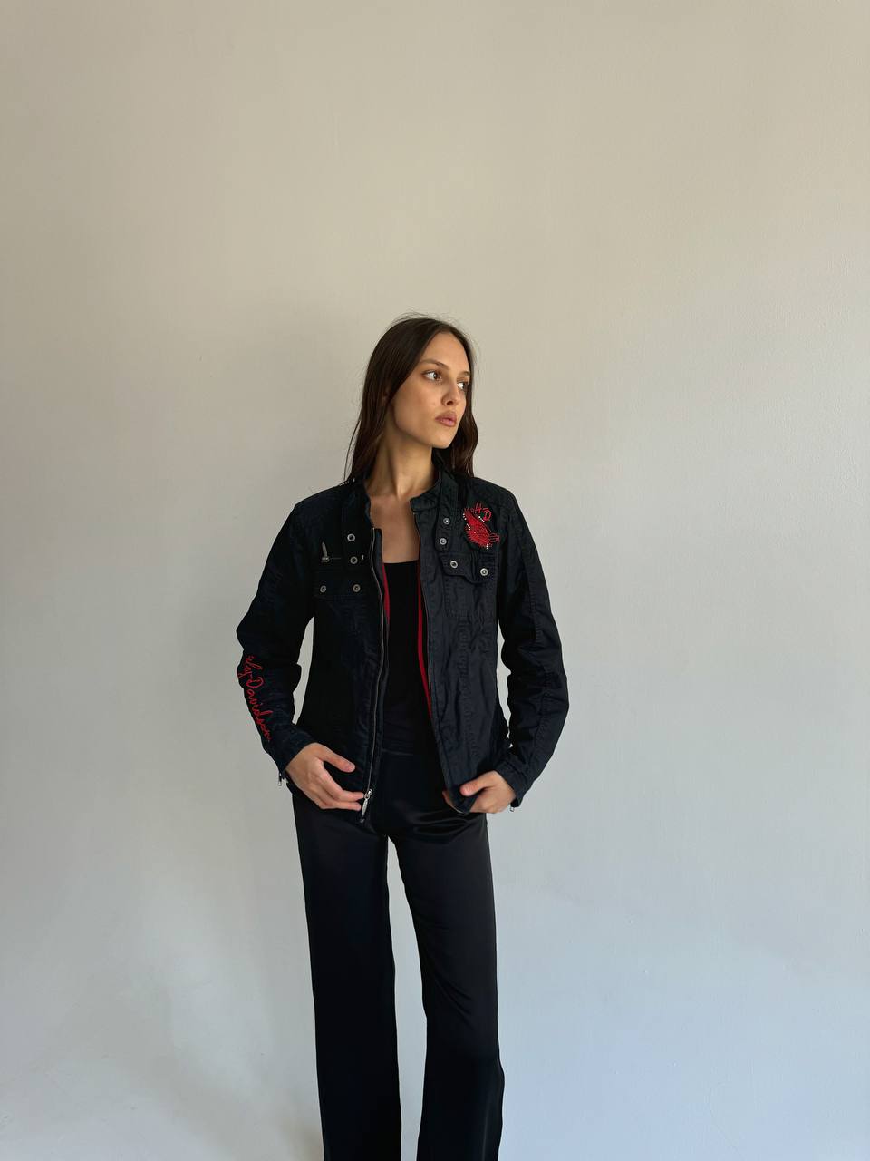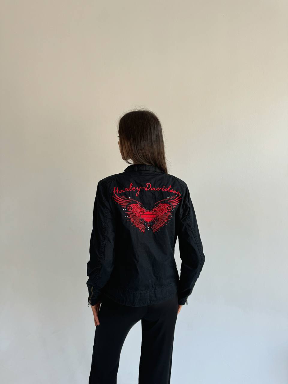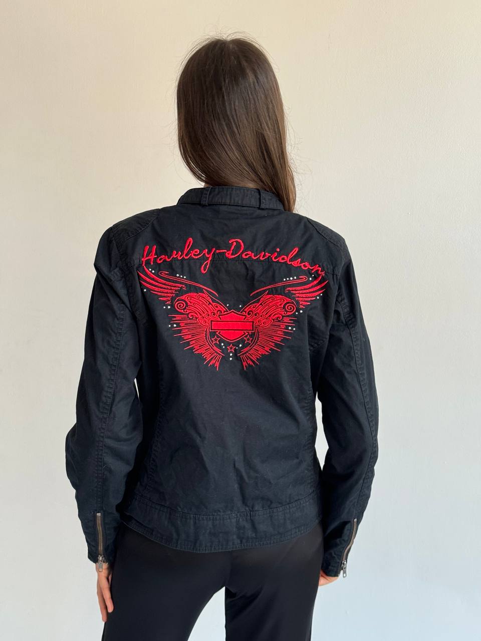 Vintage Harley Davidson black cotton blend moto jacket with red embroidery and some rhinestones