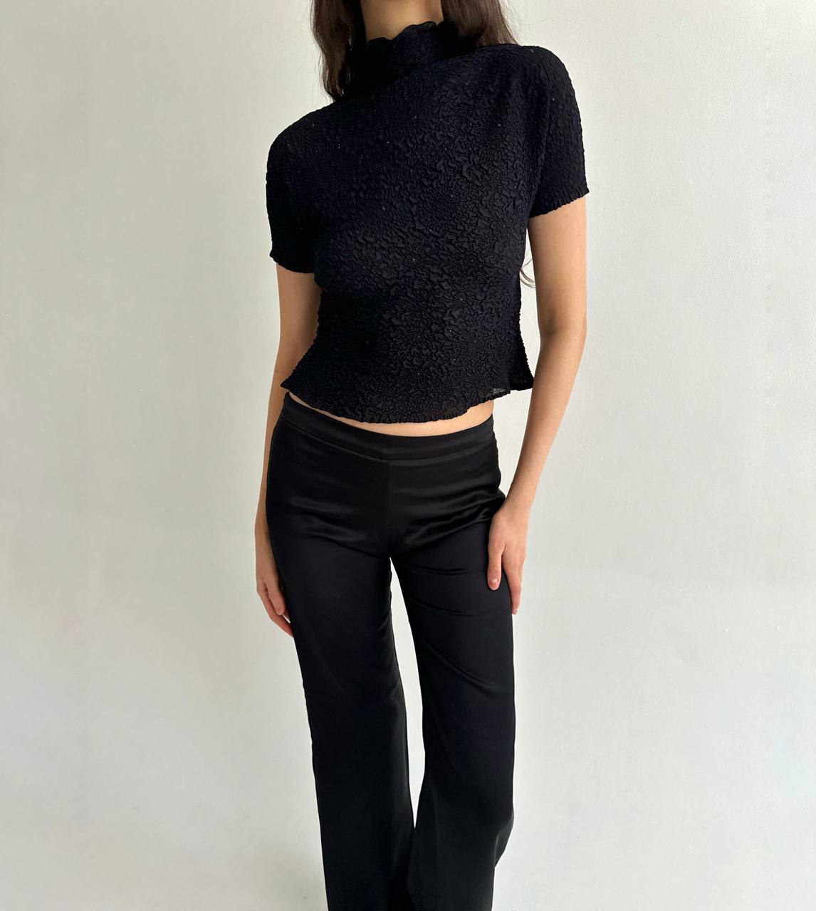 Vintage avant garde Japanese brand the most beautiful blouse with crinkle pleated texture, semi transparent thin fabric, rhinestones, stand collar with side fastening and lettuce hem