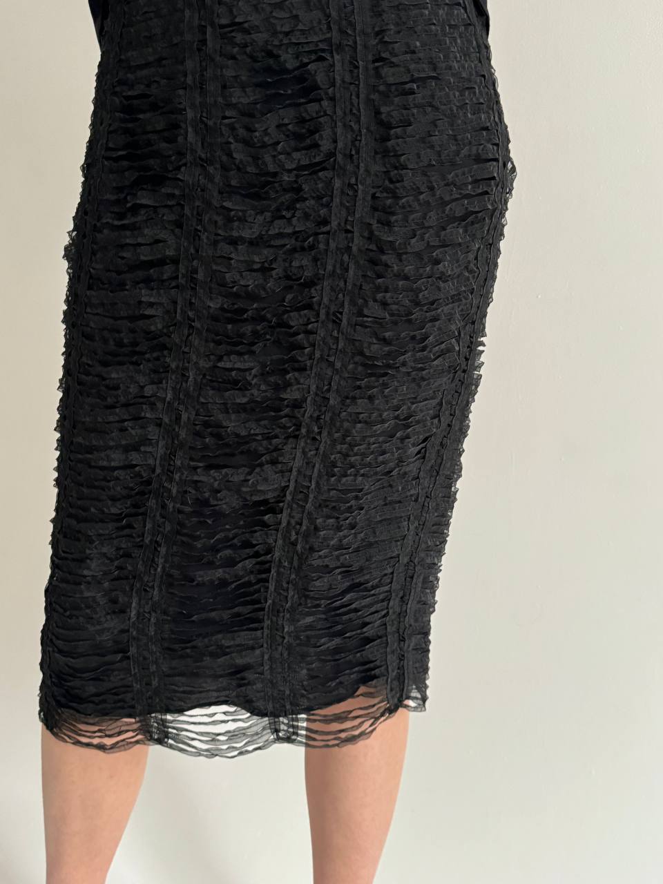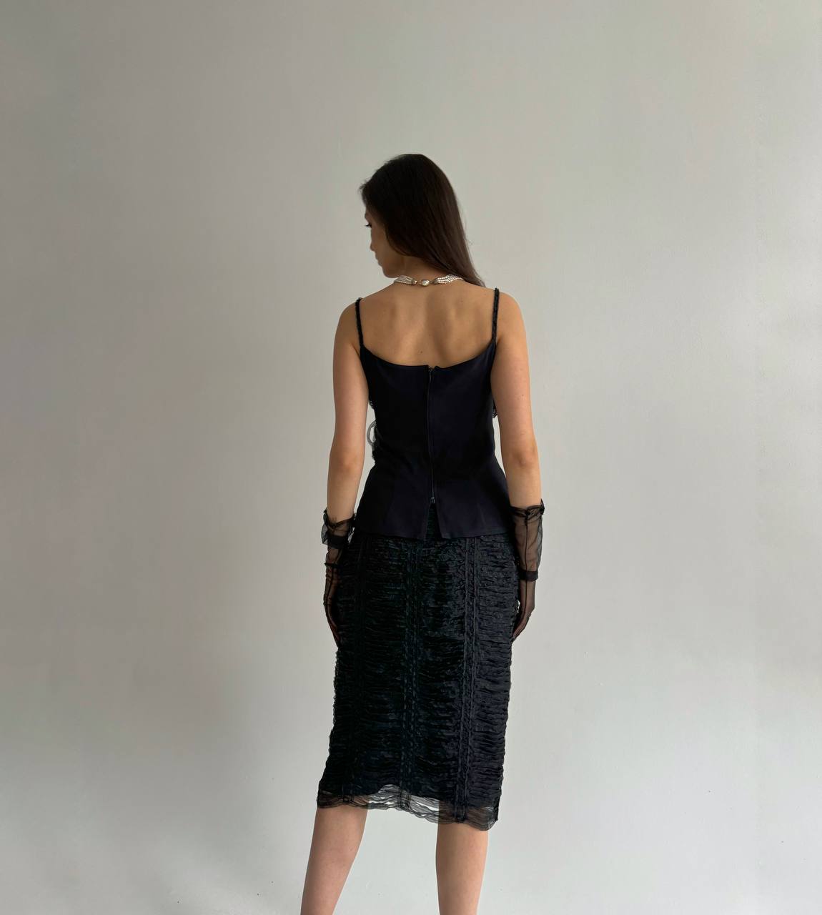 Vintage La Perla 95% silk evening 2 piece set in black, cami top with organza appliqué and midi skirt