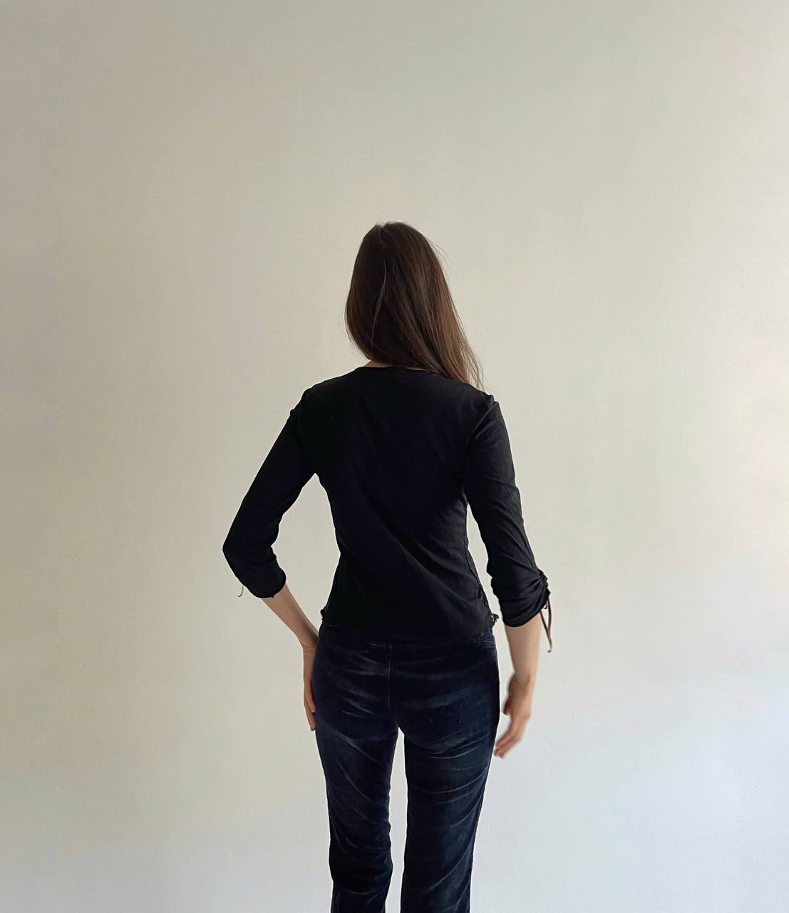 Vintage made in Italy mesh blouse, ombré gradient blue lace front with suede tie and mesh black gathered sleeves and back