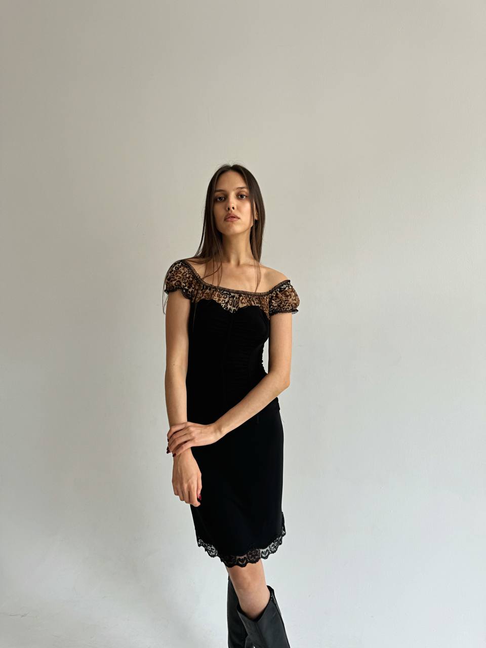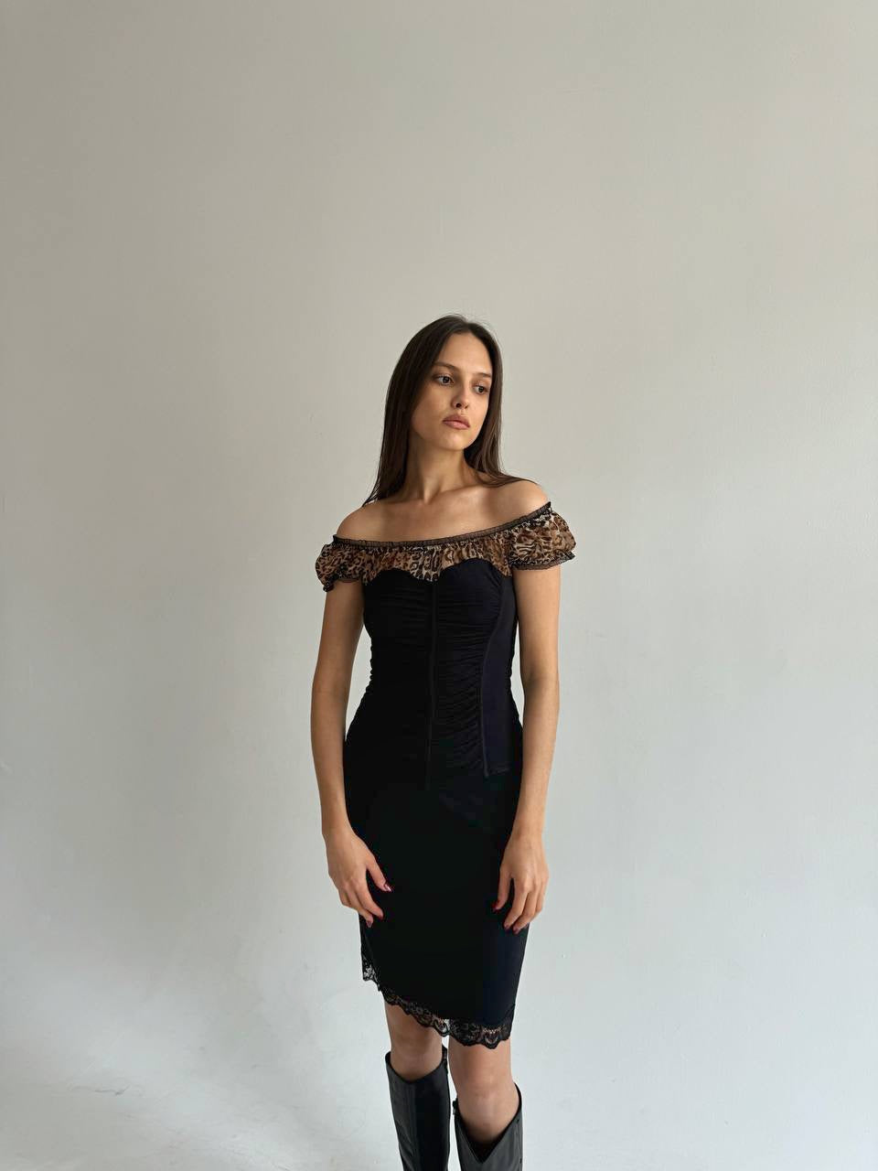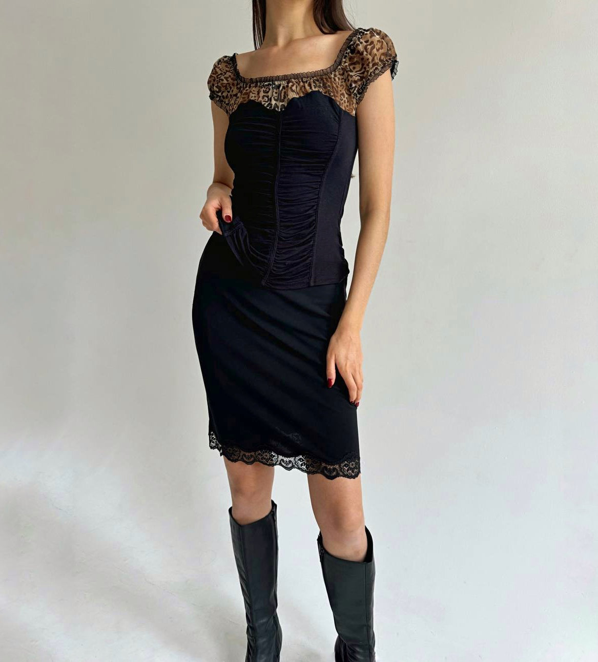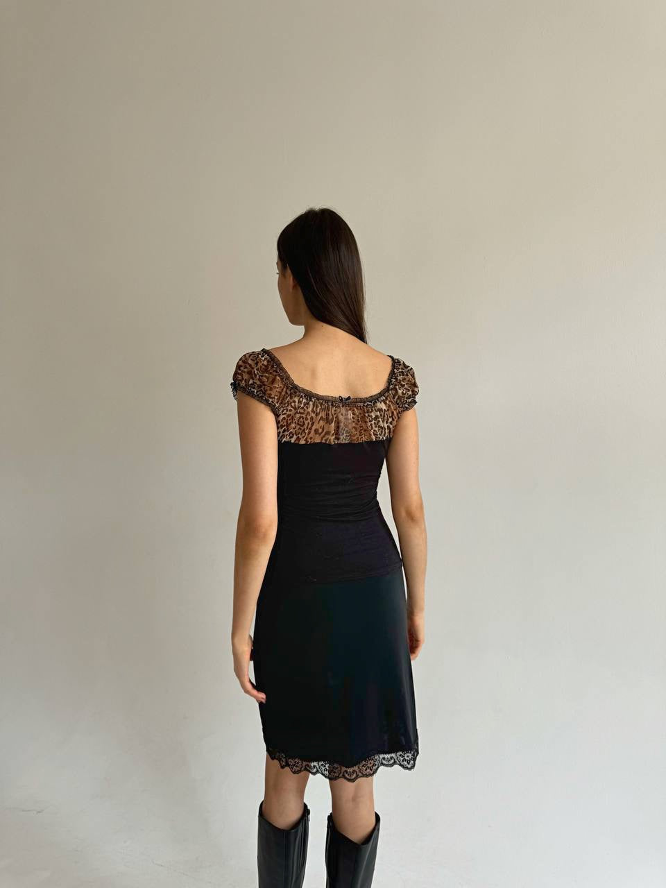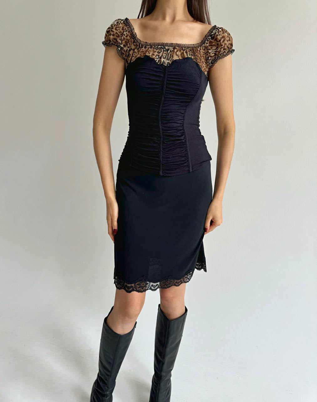 Vintage black ruched top with leopard mesh chest and sleeves