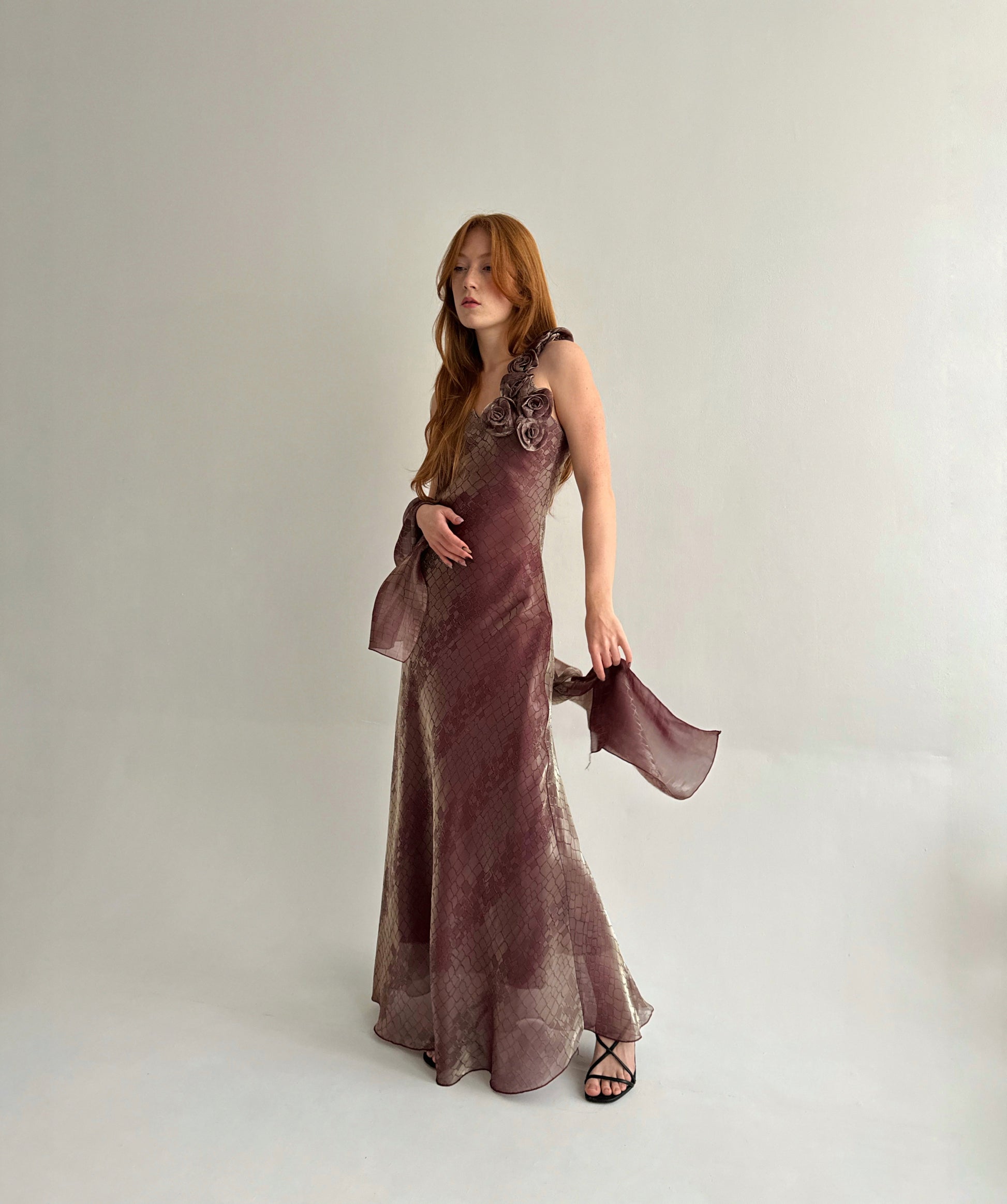 Vintage viscose blend made in France iridescent printed maxi slip dress with flower appliqué and a cape