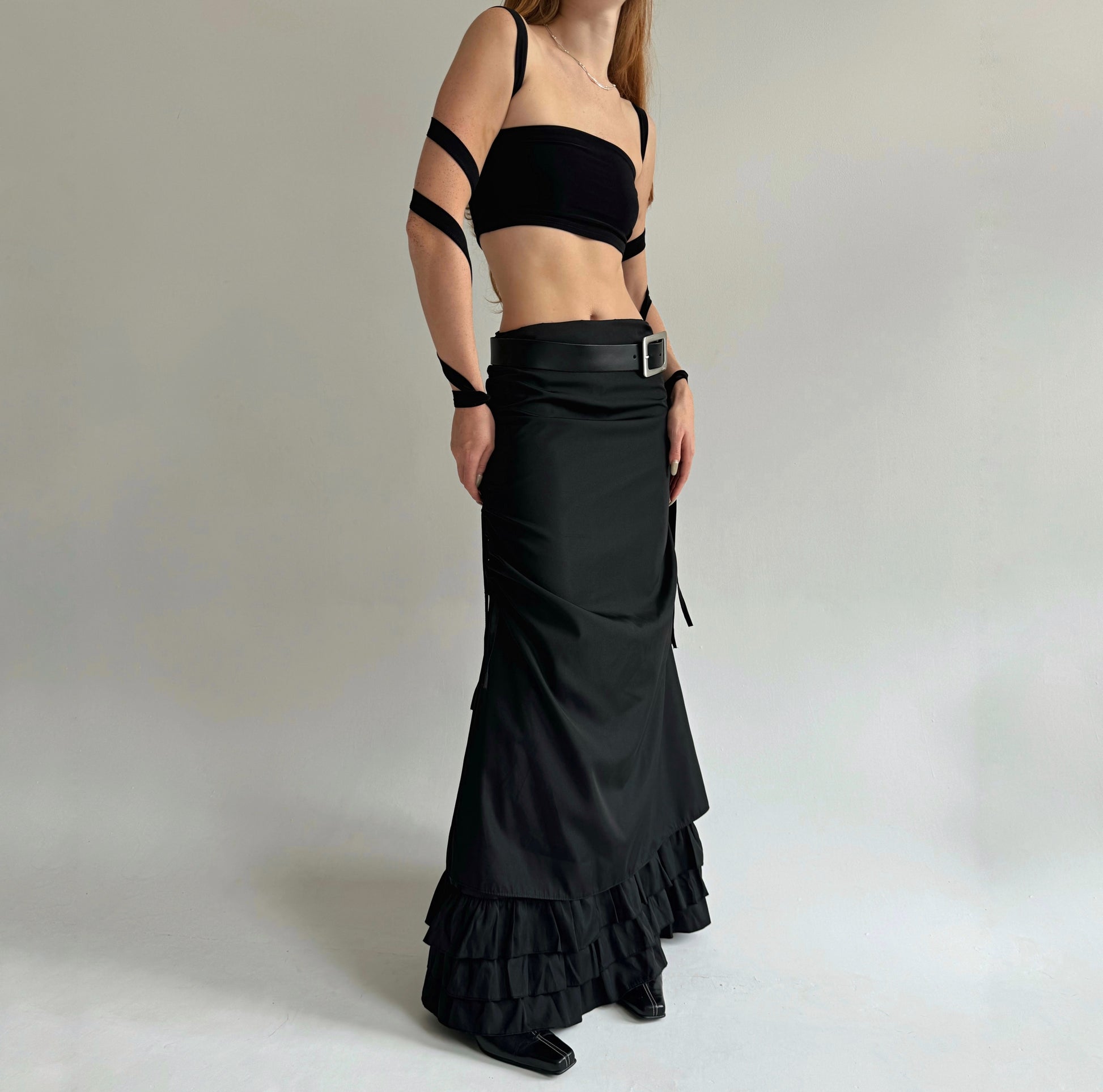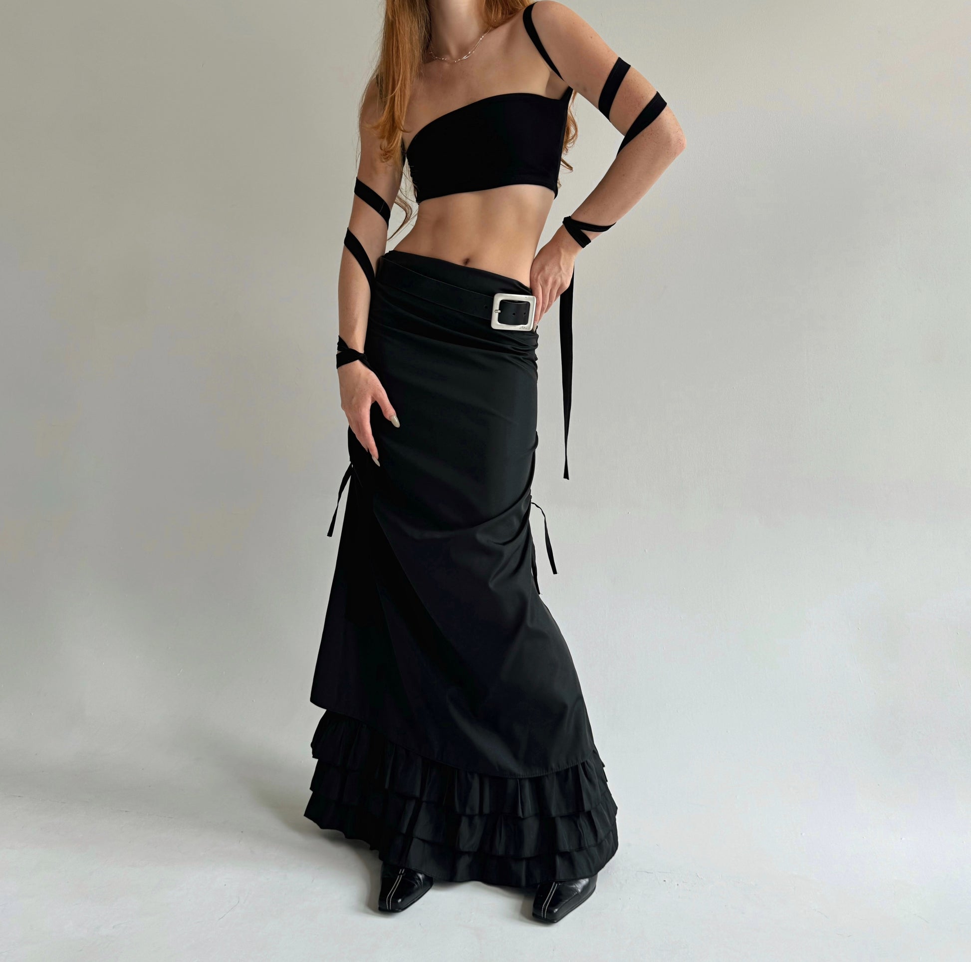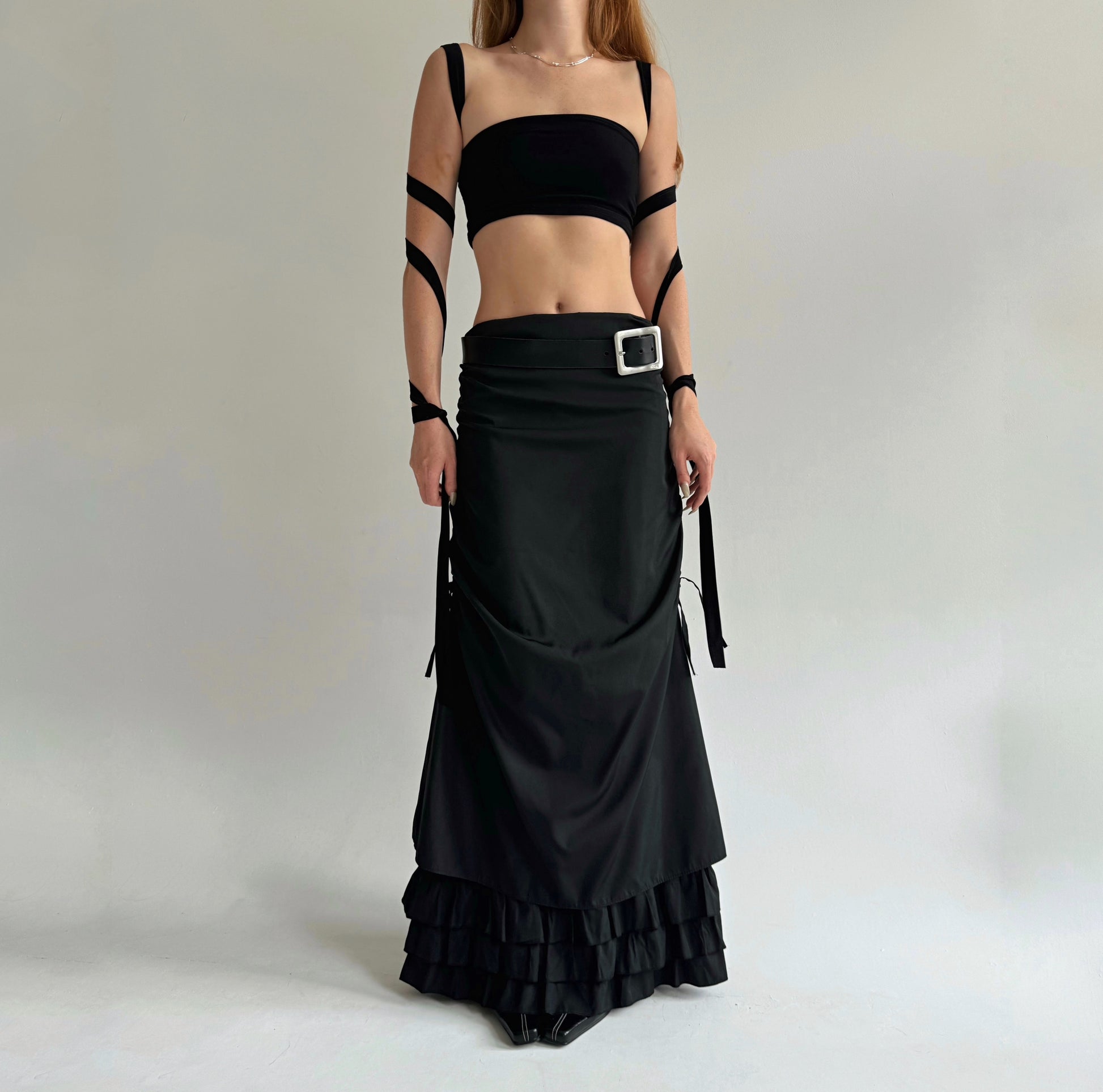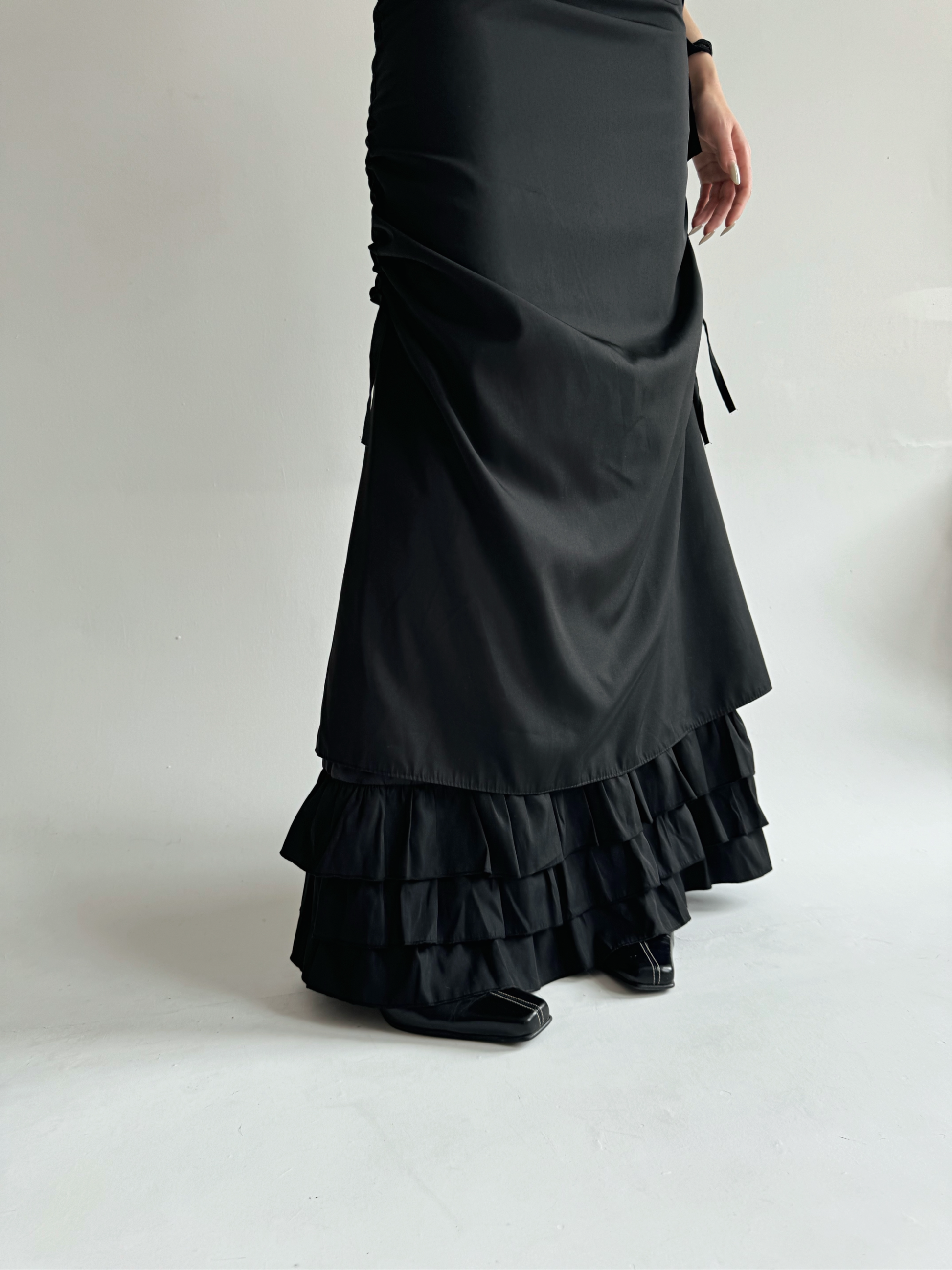 Vintage black maxi skirt with gathered sides and ruched under layer bottom