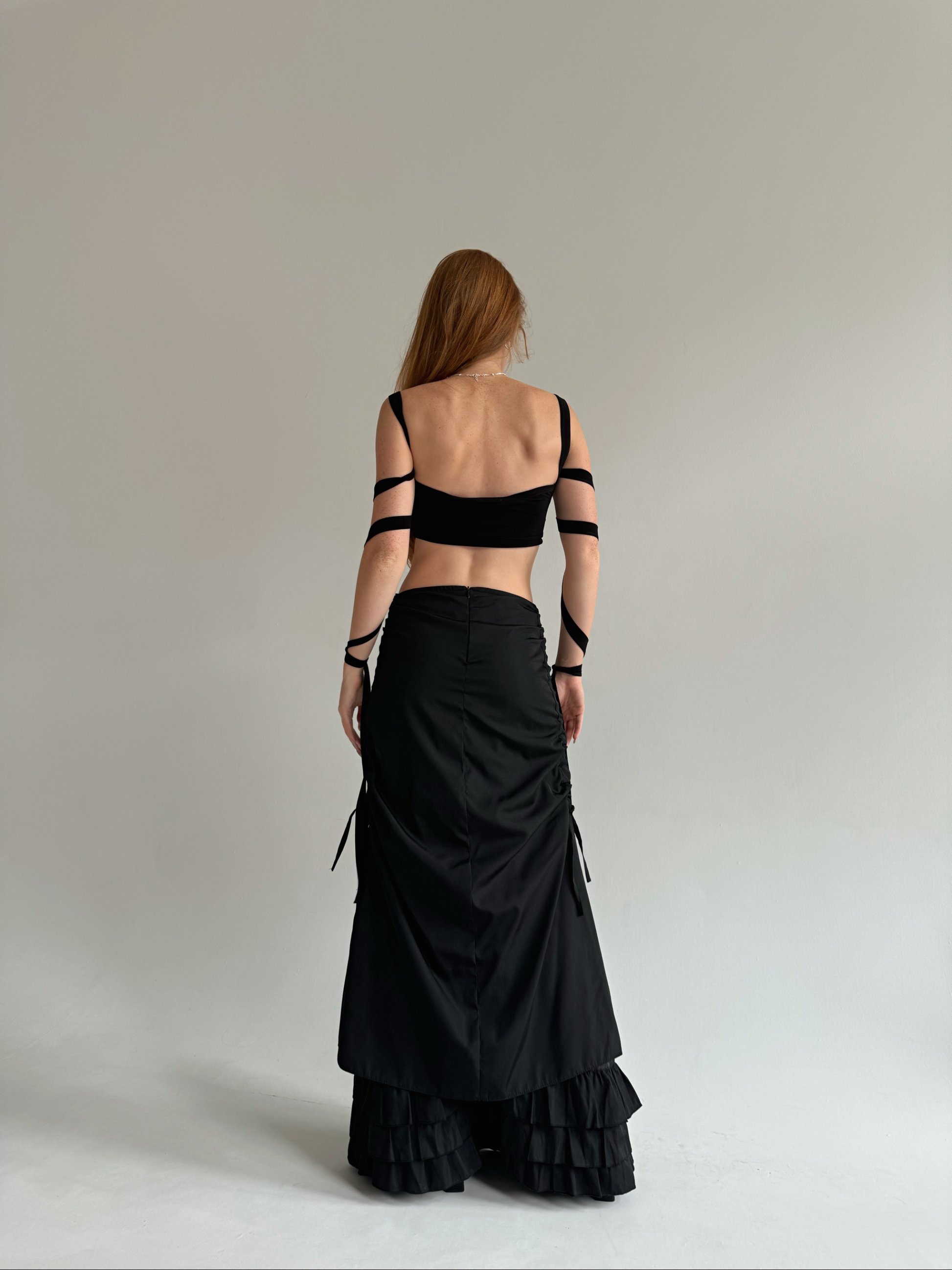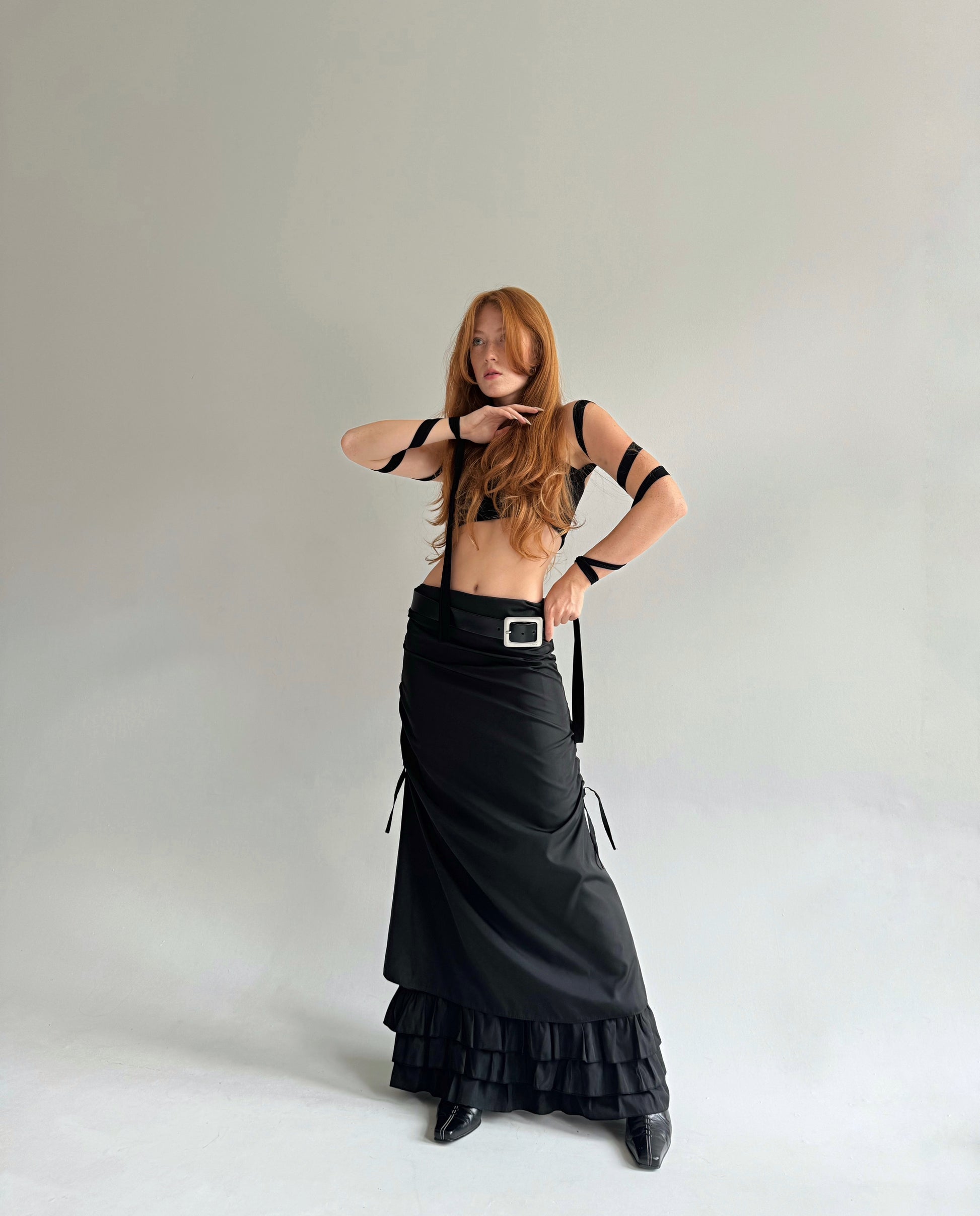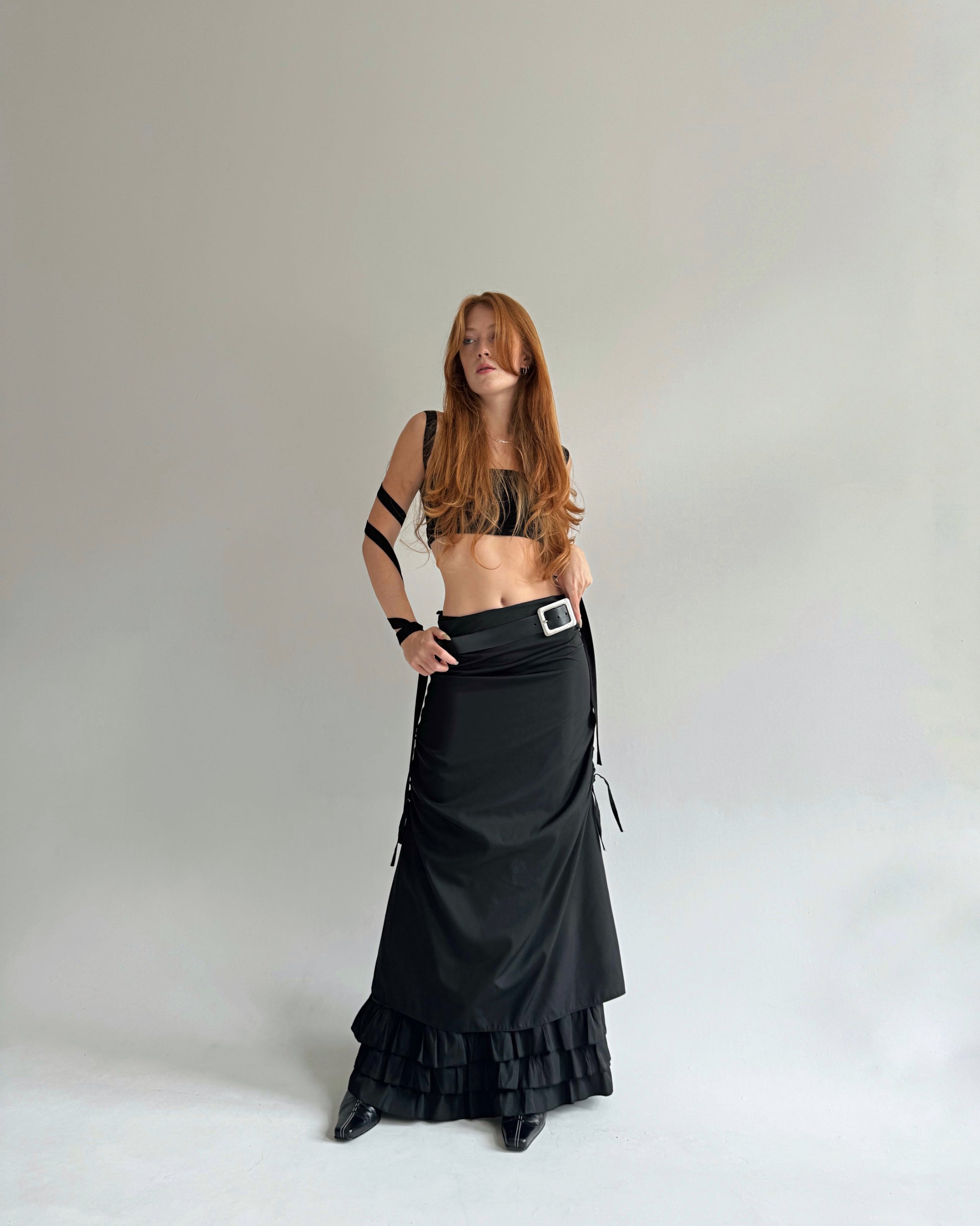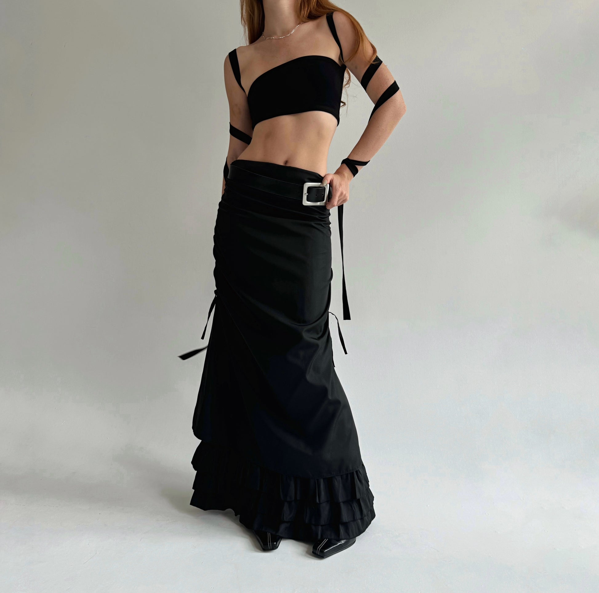 Vintage black maxi skirt with gathered sides and ruched under layer bottom