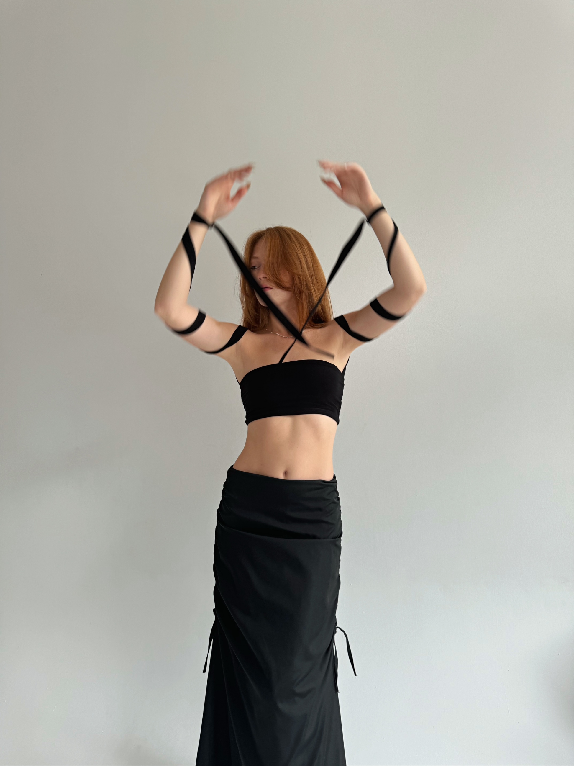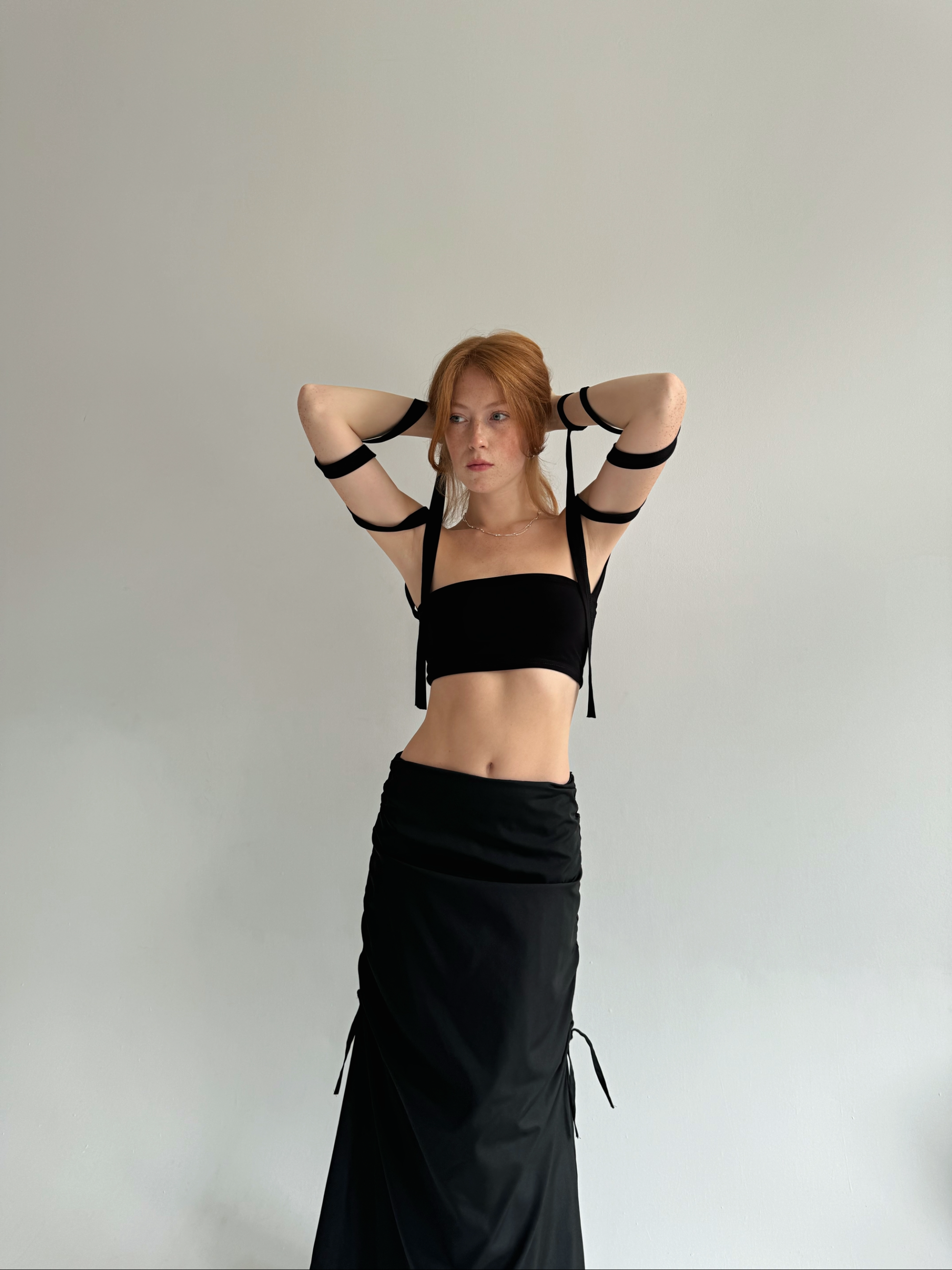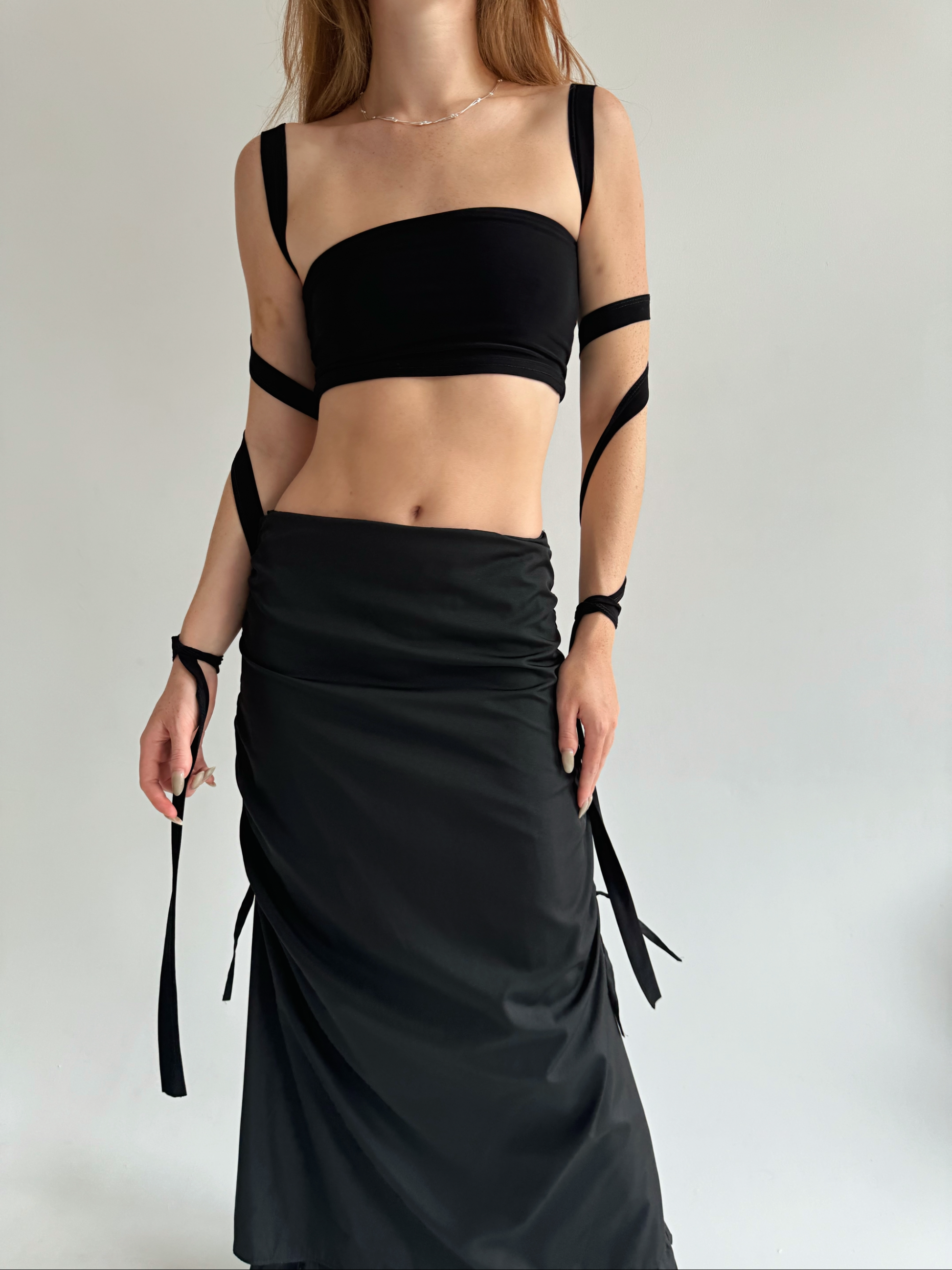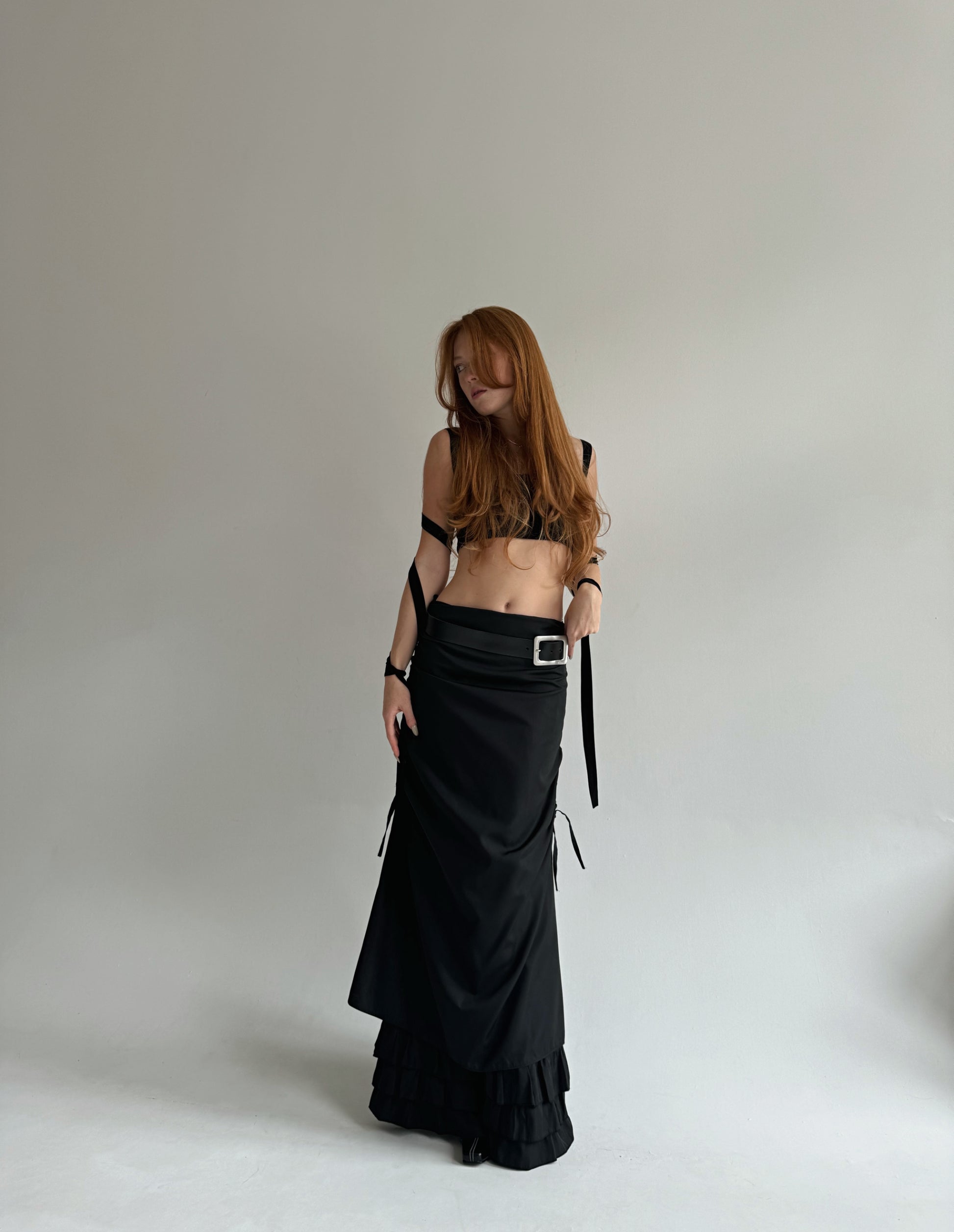 Vintage black maxi skirt with gathered sides and ruched under layer bottom