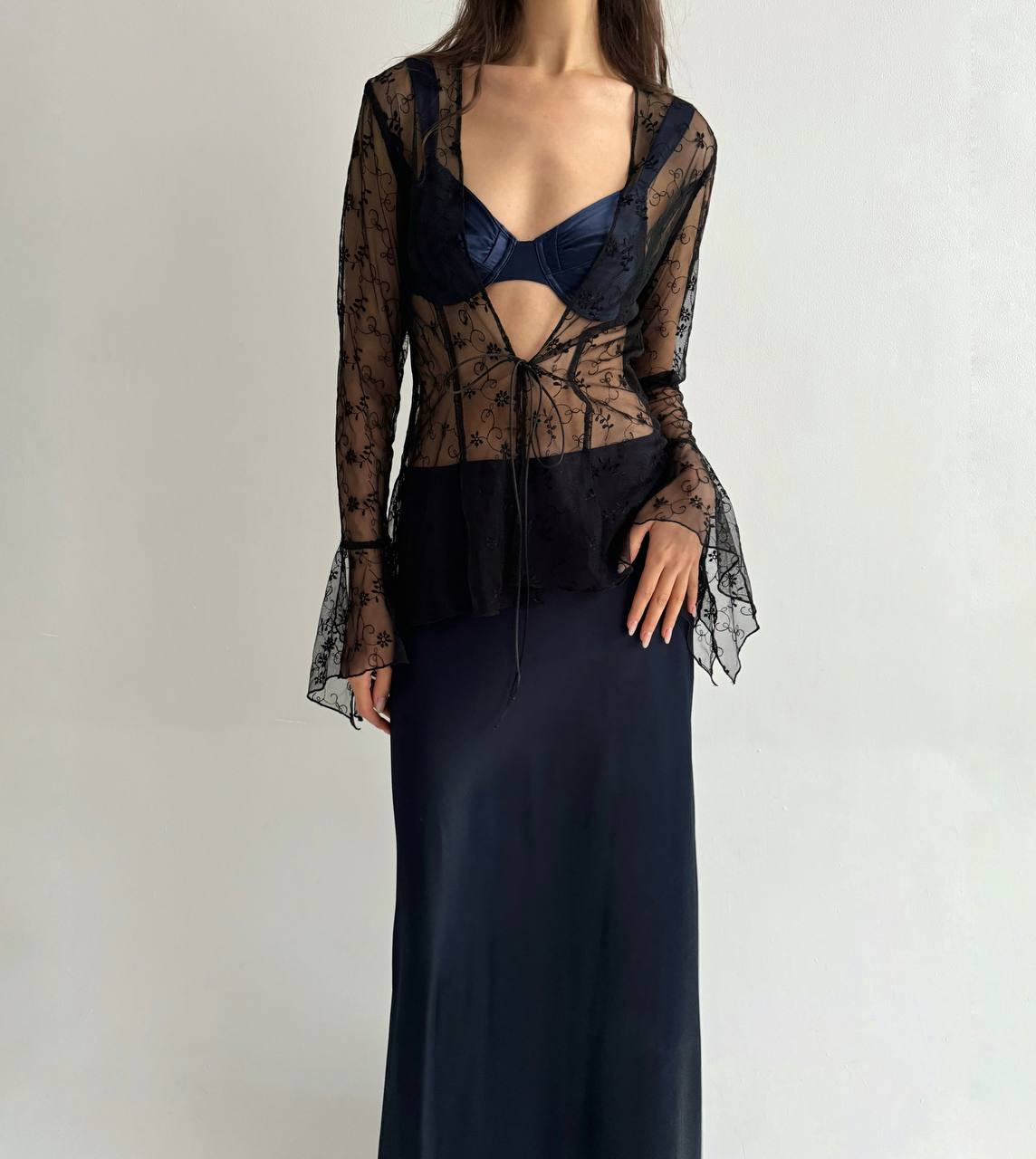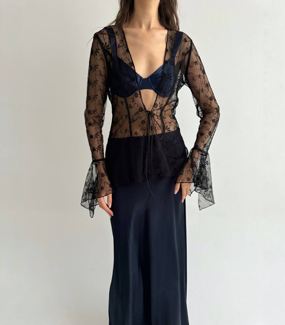 Vintage semi transparent lace mesh fitted blouse with front tie