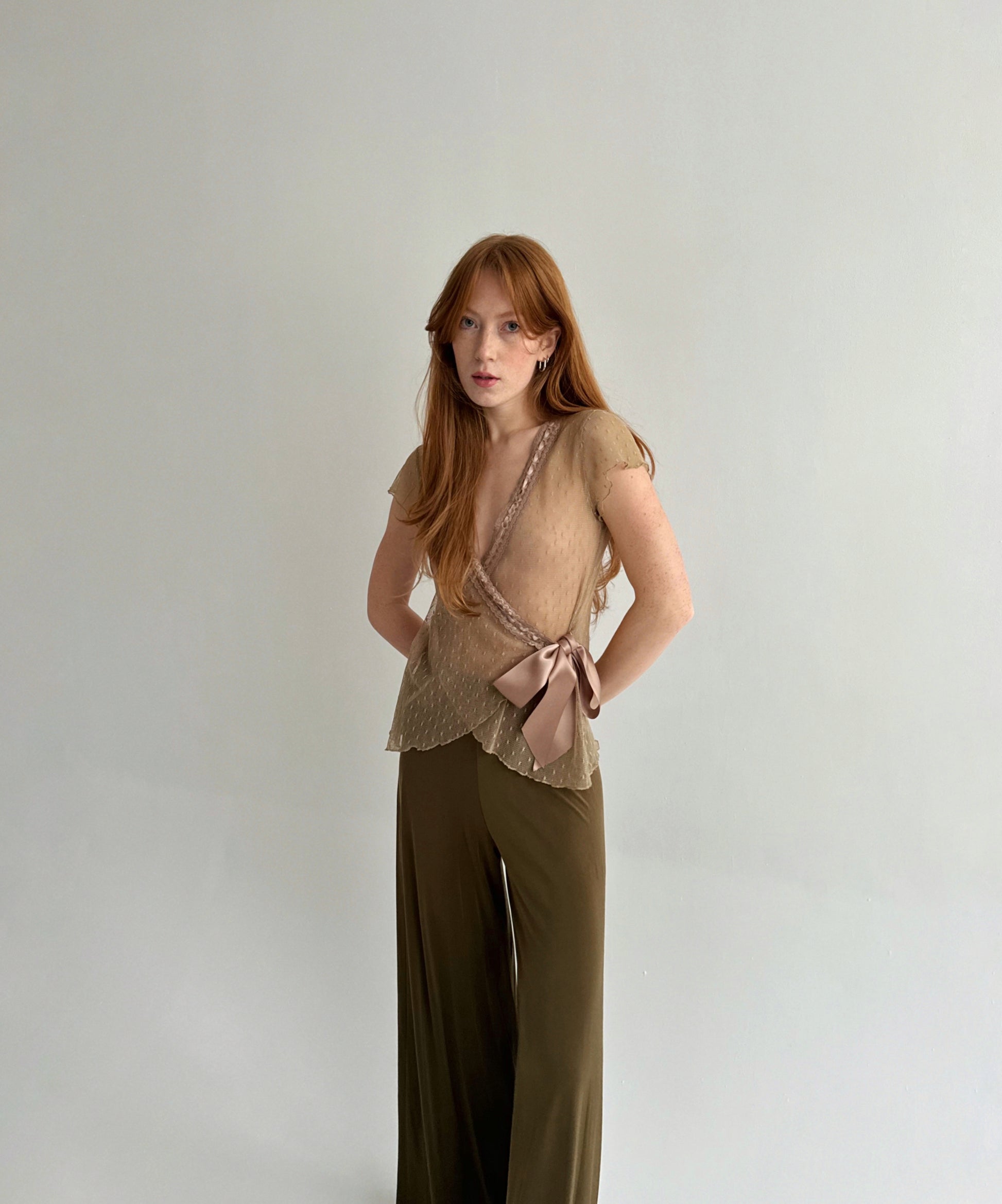 Vintage mesh wrap blouse in taupe with greenish shades, featuring a satin bow and lace detailing