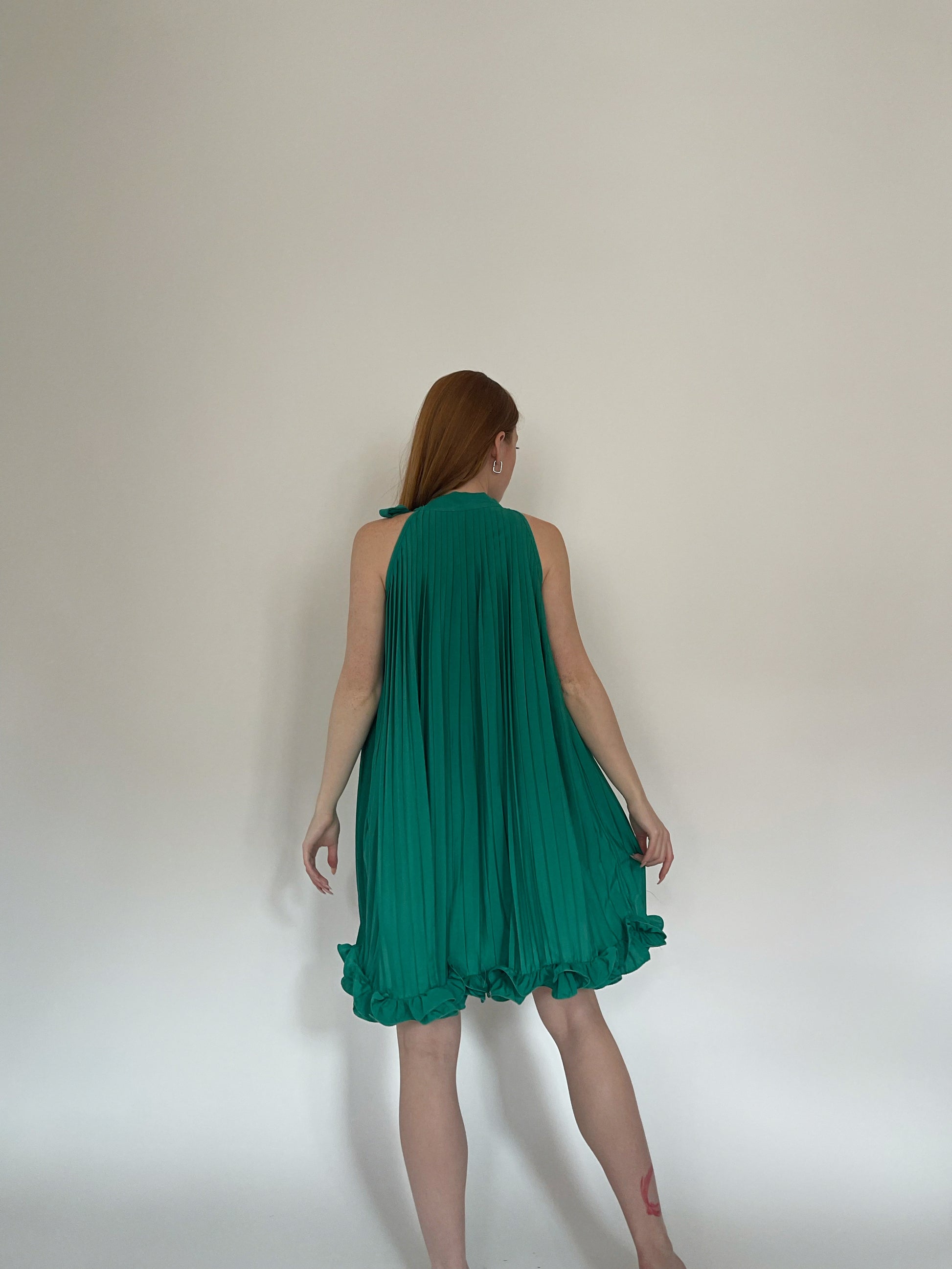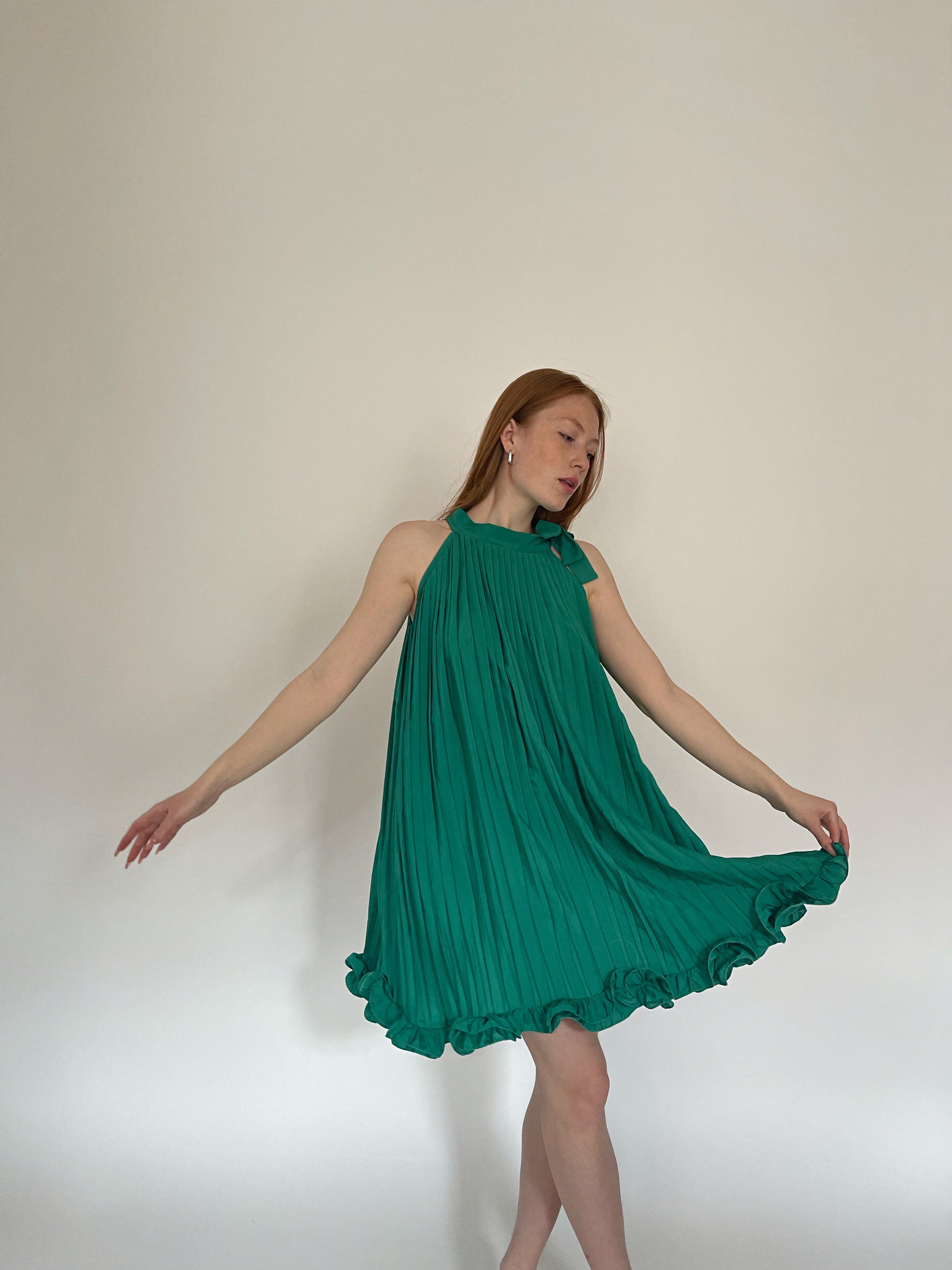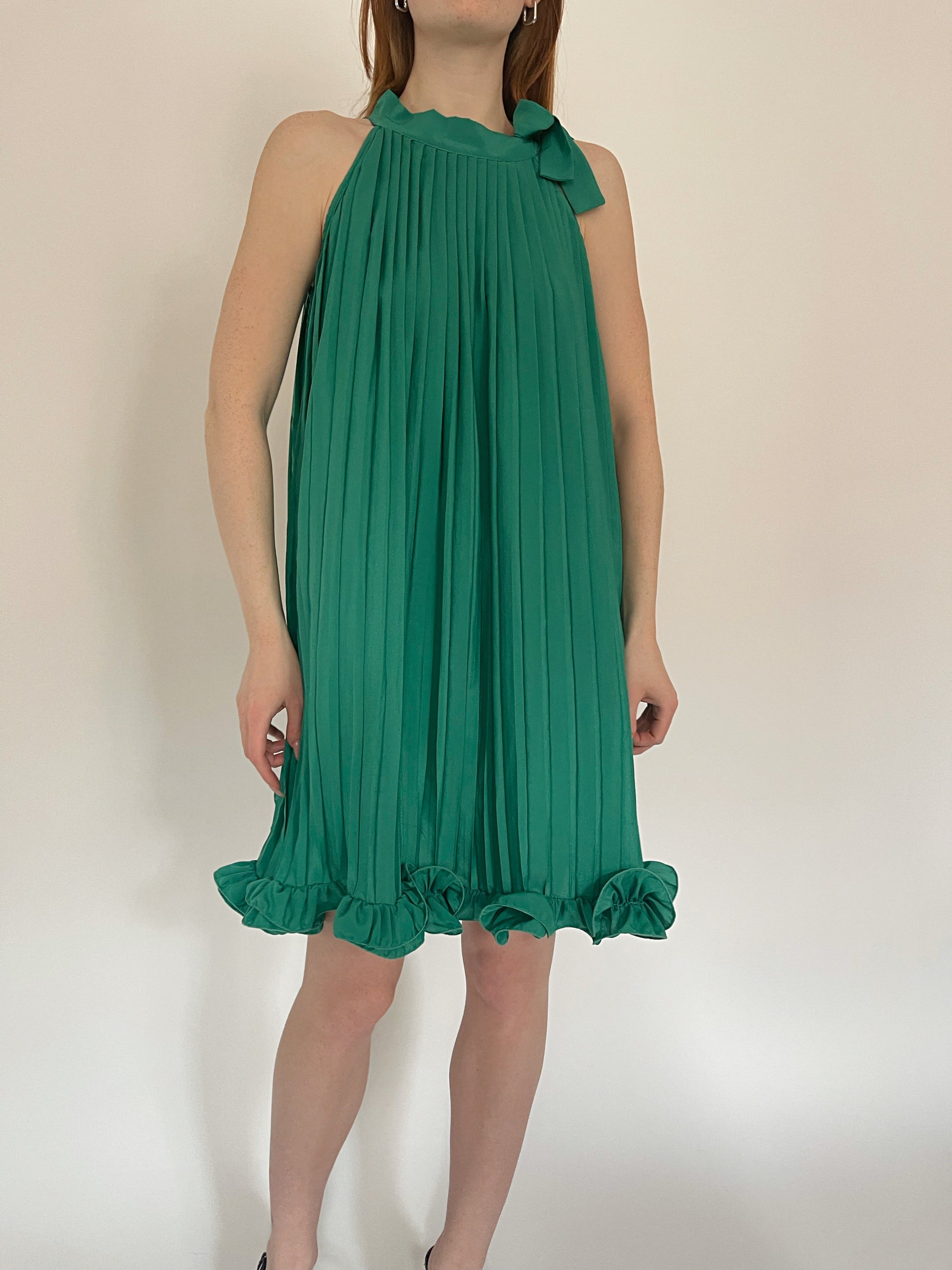 Vintage green pleated mini dress with ruched ruffled hem and neck side bow